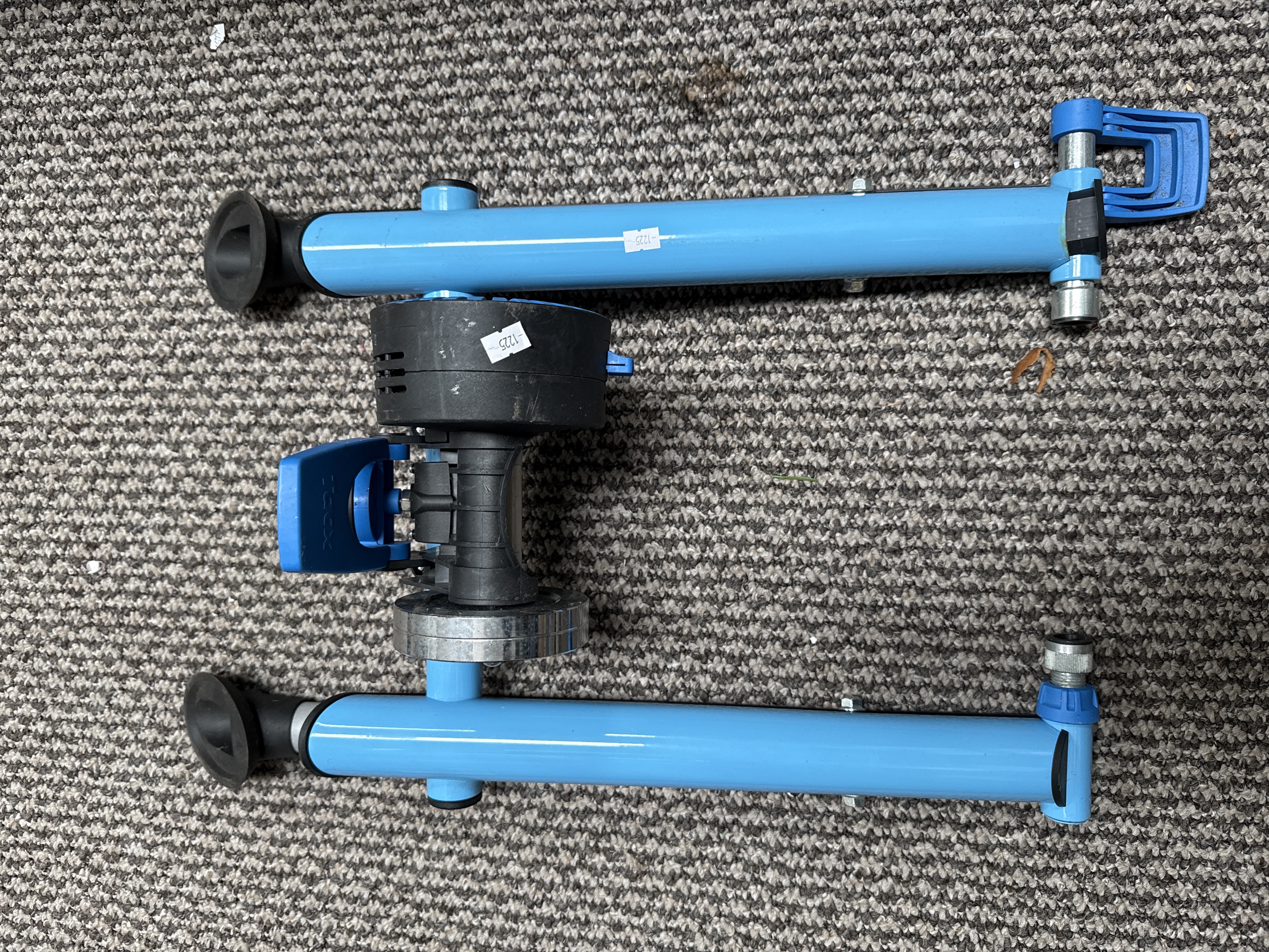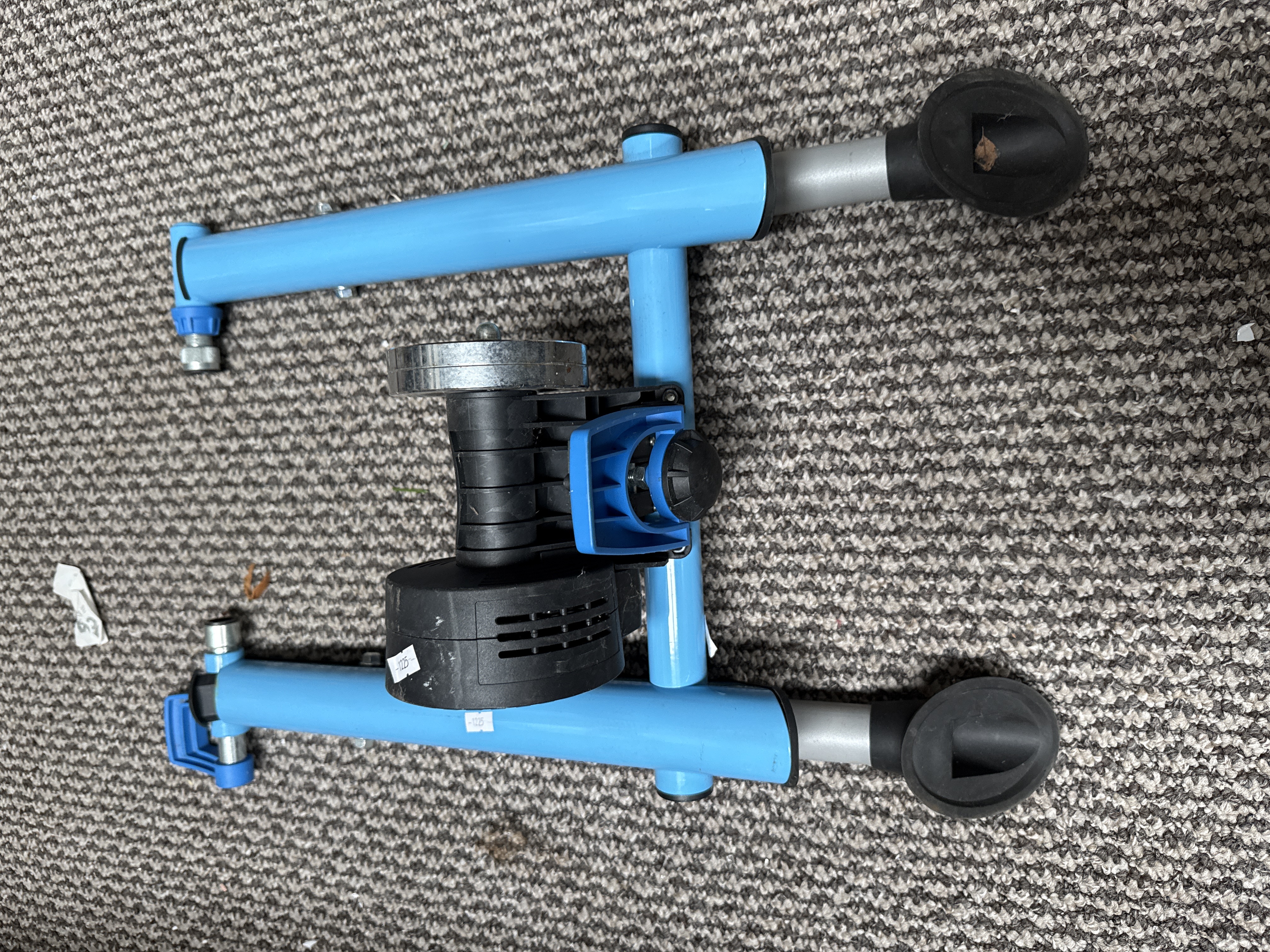 A Tacx Blue Matic indoor bicycle turbo trainer featuring a light blue tubular metal frame with black plastic and metal components. The unit is equipped with a central resistance roller, a flywheel, and adjustable axle clamps for securing a bicycle. The blue plastic adjustment lever is embossed with the Tacx brand name. The frame is supported by four black rubberised feet.