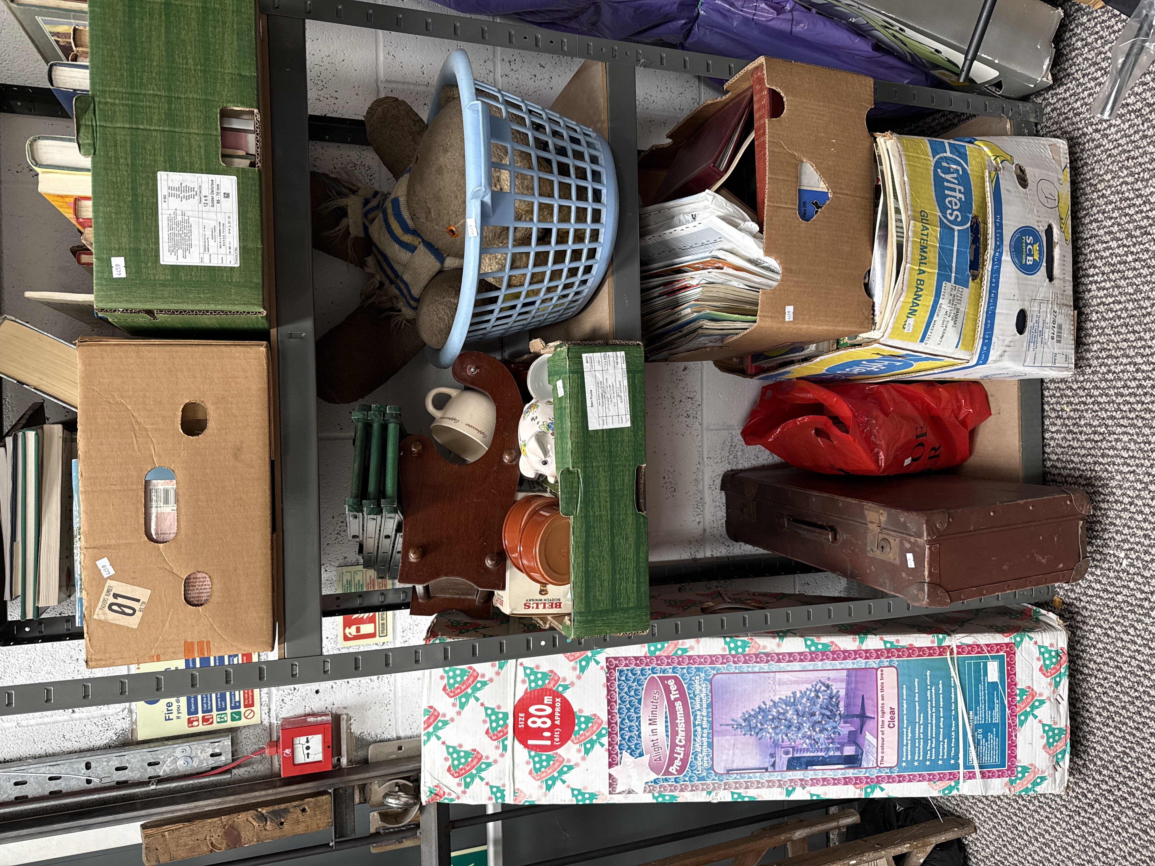 This lot comprises a diverse collection of household goods, books, ephemera, and other items. Included is a vintage brown suitcase featuring metal latches and hardware, showing some surface scuffs. A large retail box contains a 1.80m (6ft) pre-lit Christmas tree, described on the packaging as Alight in Minutes with clear lights. A plush teddy bear wearing a striped scarf is contained within a blue plastic laundry basket. The assortment includes several cardboard boxes, one of which is branded Fyffes Guatemala Bananas with an SCB Premium label, and another marked Packers Number 01; these contain a variety of books, folders, and paper ephemera. Also present are a dark wood wall-mounted rack, a ceramic mug, and a ceramic item bearing the mark BELLS. The lot is completed by a set of green folding components and a red plastic bag. Please note that the metal racking shown in the photograph is not included in this lot.