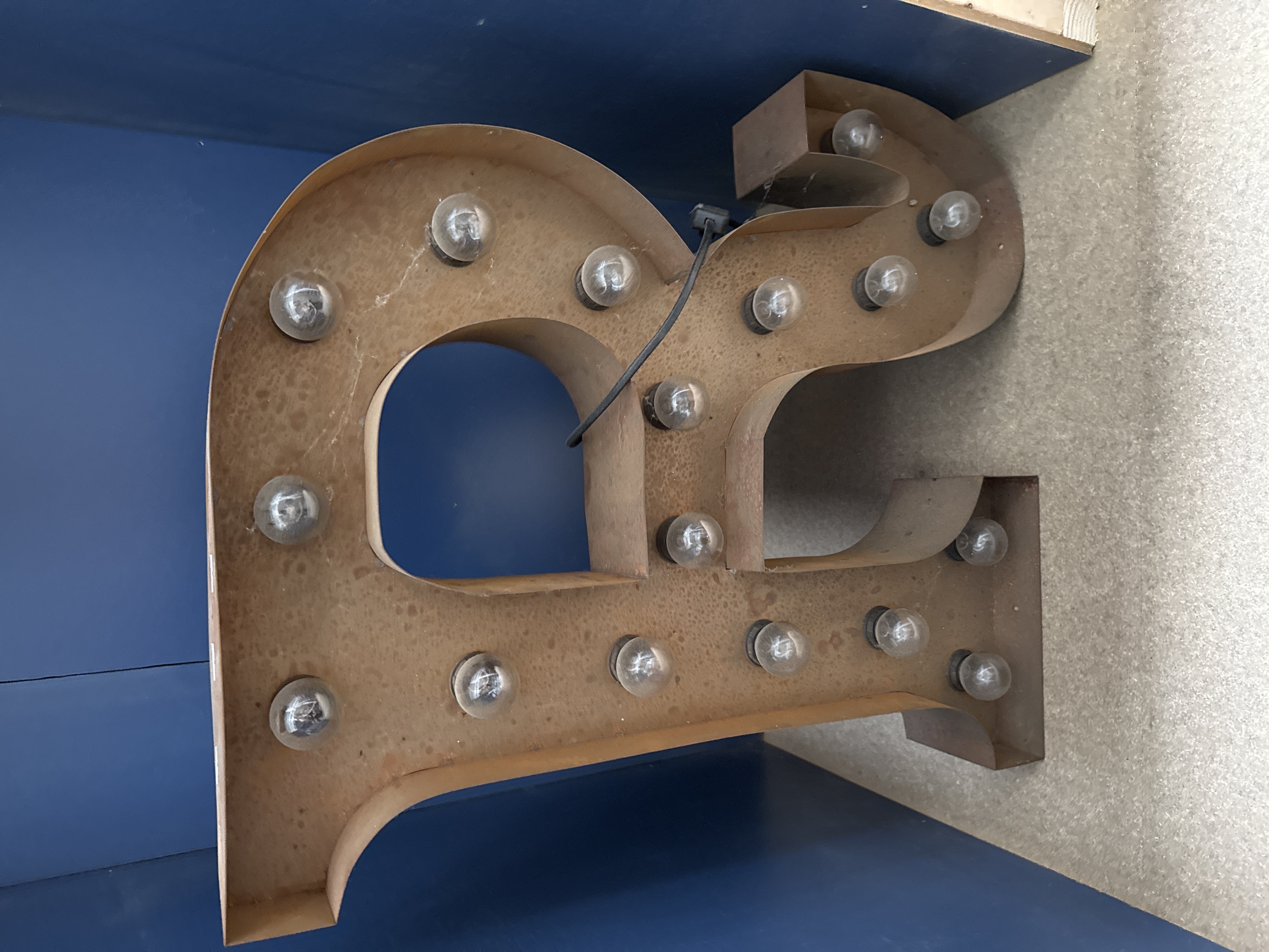 An industrial style marquee-style illuminated display letter representing the lowercase letter r. The piece is constructed from 22 X 25” fabricated sheet metal with a deep-channel profile, featuring a heavily oxidised and rusted finish to create a vintage aesthetic. The interior channel is fitted with sixteen clear glass round incandescent-style bulbs. A black electrical cord extends from the rear of the casing. The item is consistent with 21st-century decorative signage produced in the industrial style.
