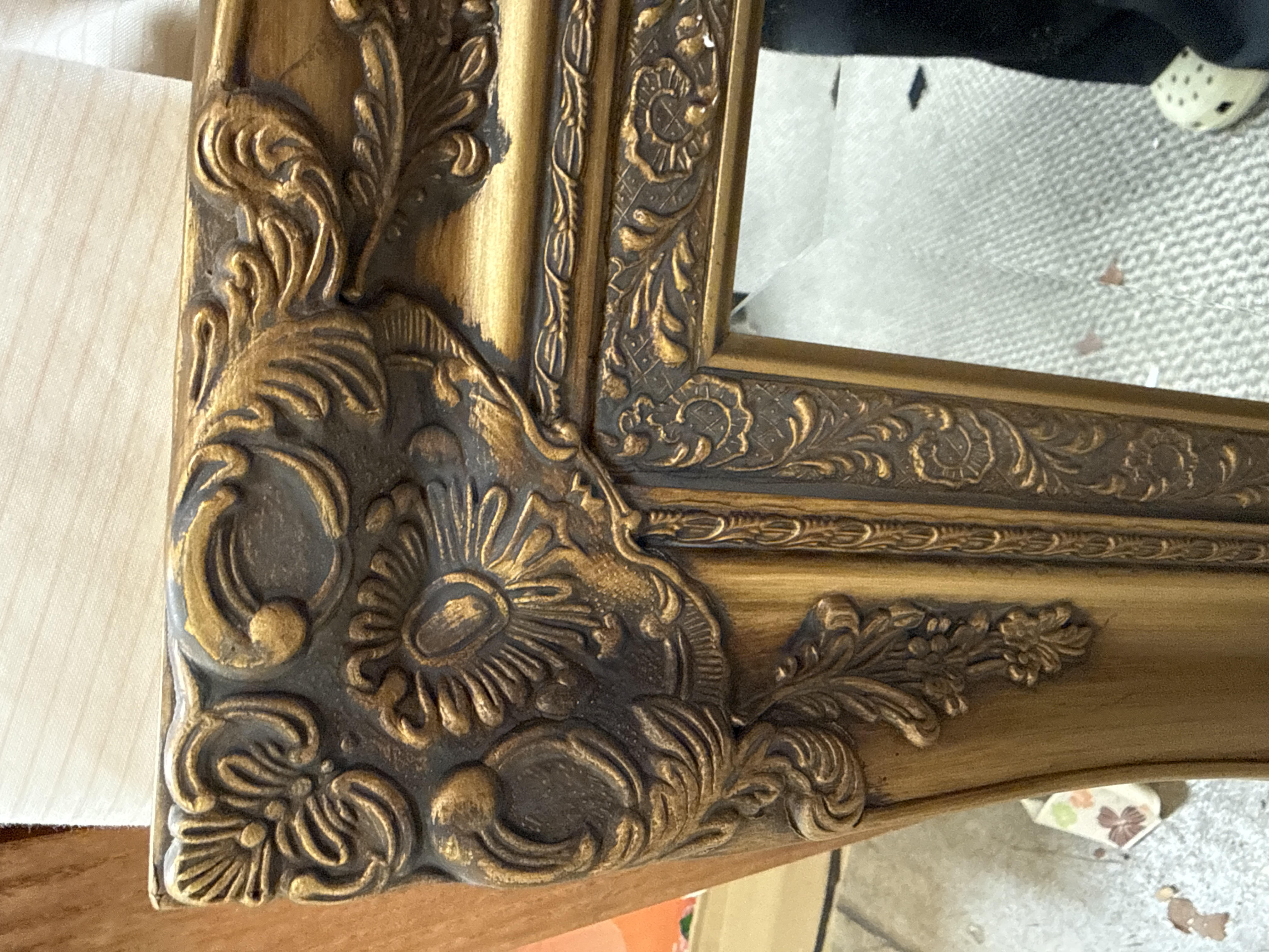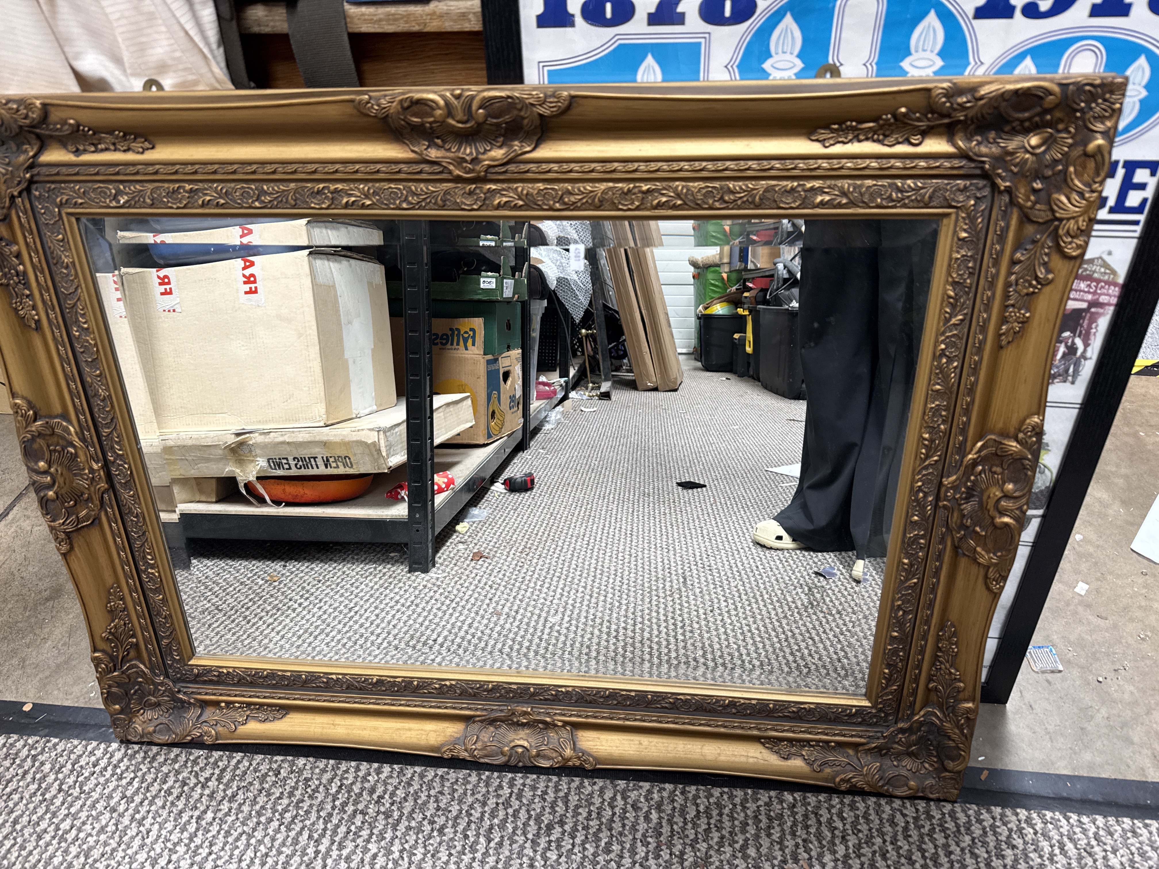 A large rectangular wall mirror featuring a heavily ornamented frame in the Rococo revival style. The frame is constructed from a moulded composite material with an antiqued gilt finish, accented by dark pigment in the recesses to emphasise the relief work. Decorative elements include scrolled acanthus leaves, floral motifs, and prominent cartouches at each corner, with additional shell-like crests at the midpoint of each side. The mirror plate is clear and bevelled. This piece is a modern decorative item, resembling mid-20th century designs.