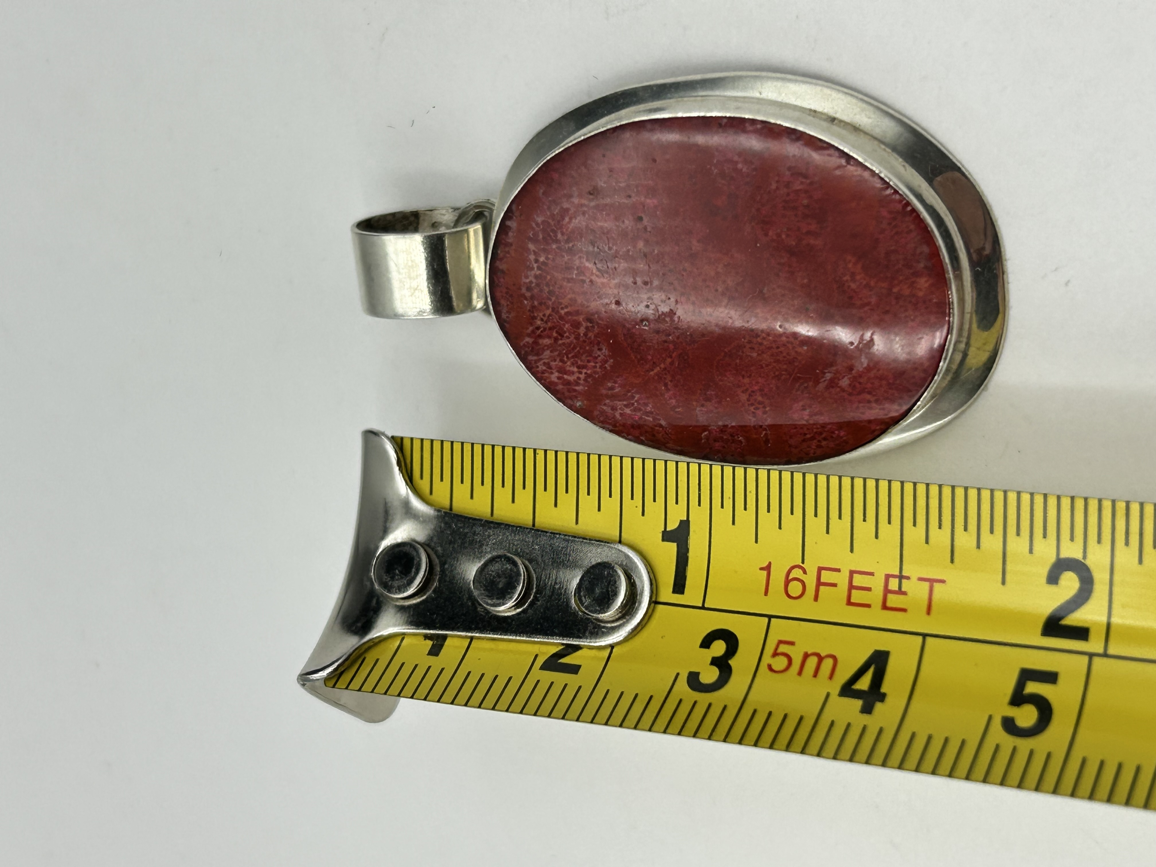 A large oval pendant featuring a central red sponge coral cabochon. The coral displays a characteristic porous cellular structure and is rub-over set within a plain, polished white metal border. The pendant is designed with a wide, integrated, and tapered polished bail. No hallmarks or maker’s marks are visible.