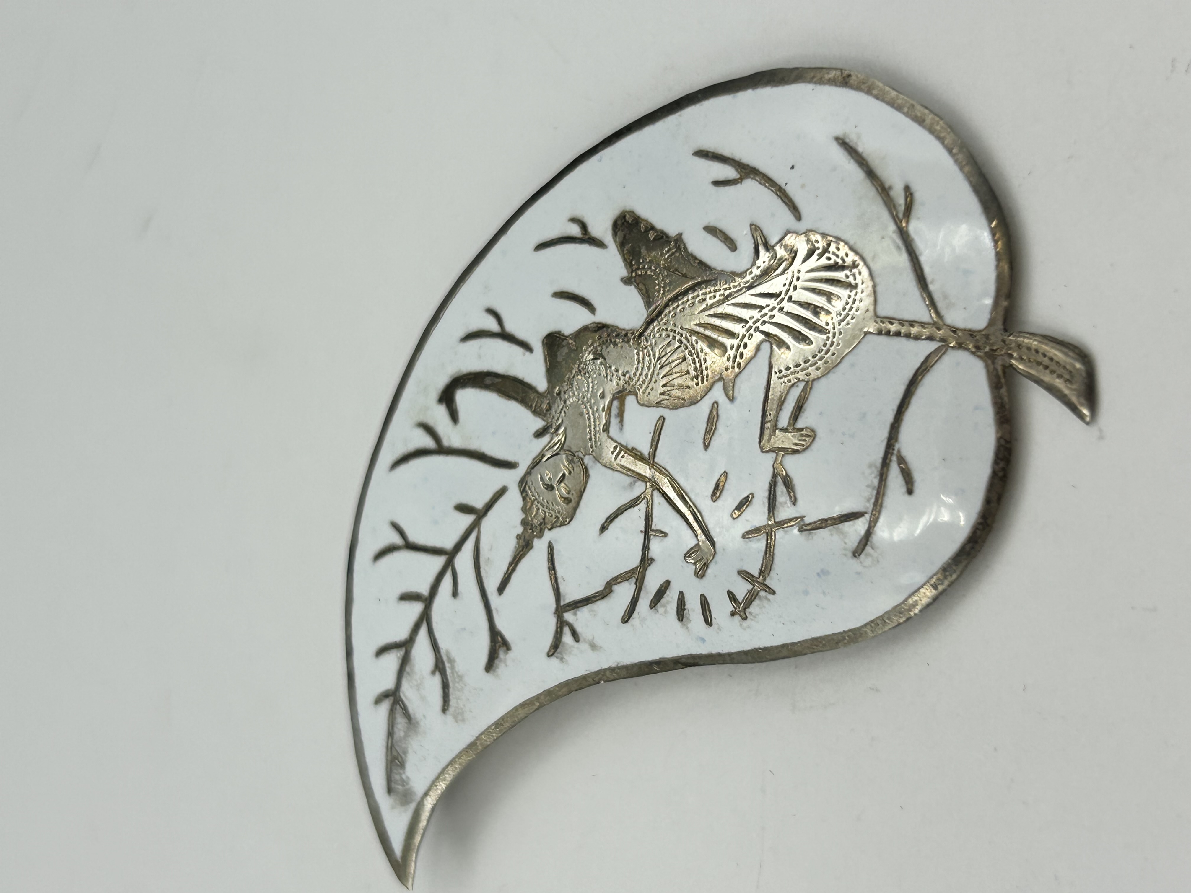 A sterling silver and enamel brooch of Thai origin. The piece is formed as a large bodhi leaf or paisley shape, featuring a white enamel ground. The obverse is decorated with a chased silver figure of a traditional Thai dancer in ceremonial attire, set amongst stylized foliate branches. The reverse is stamped with the marks STERLING and SIAM. The brooch is fitted with a horizontal pin and a revolving safety clasp.