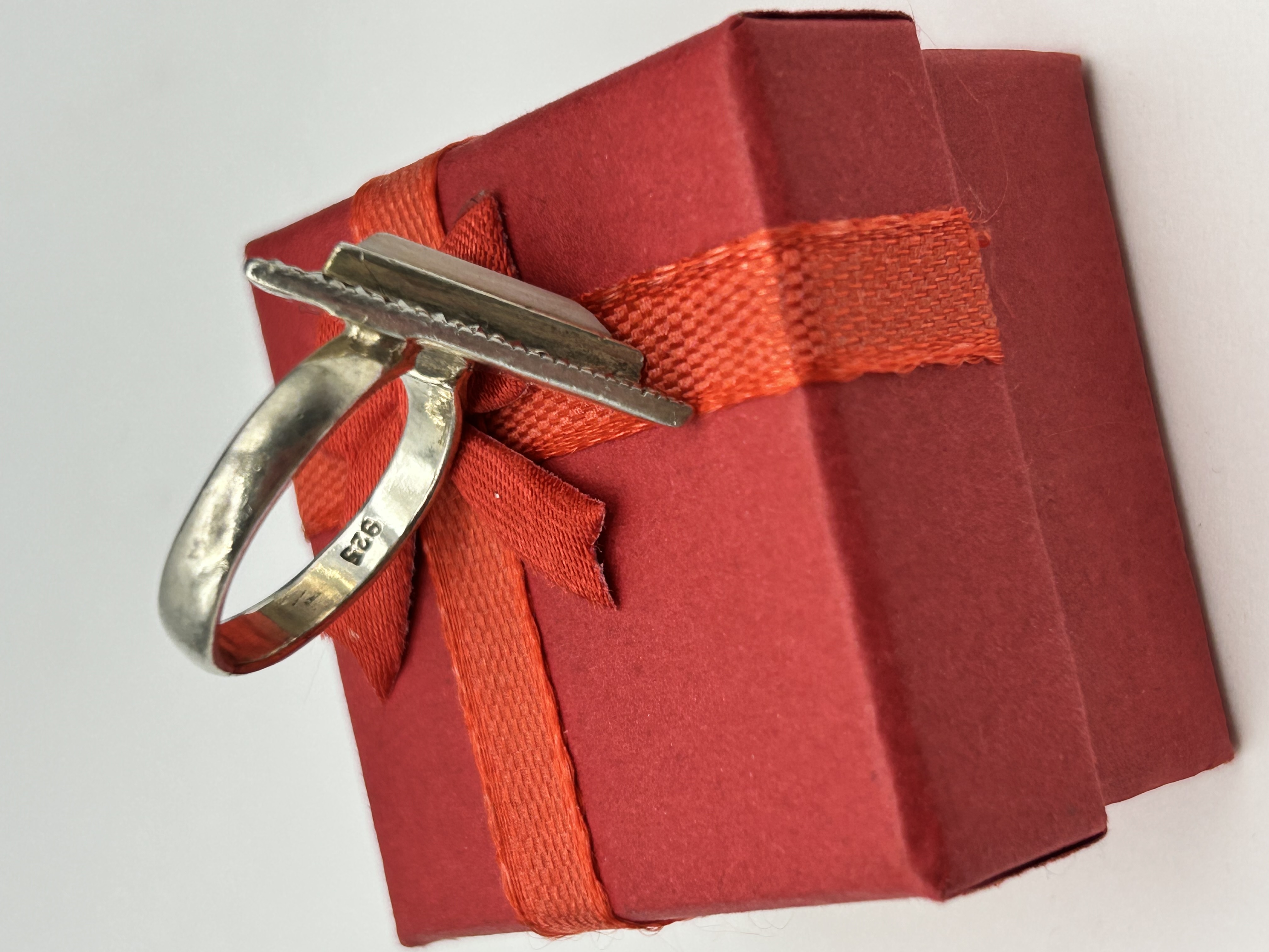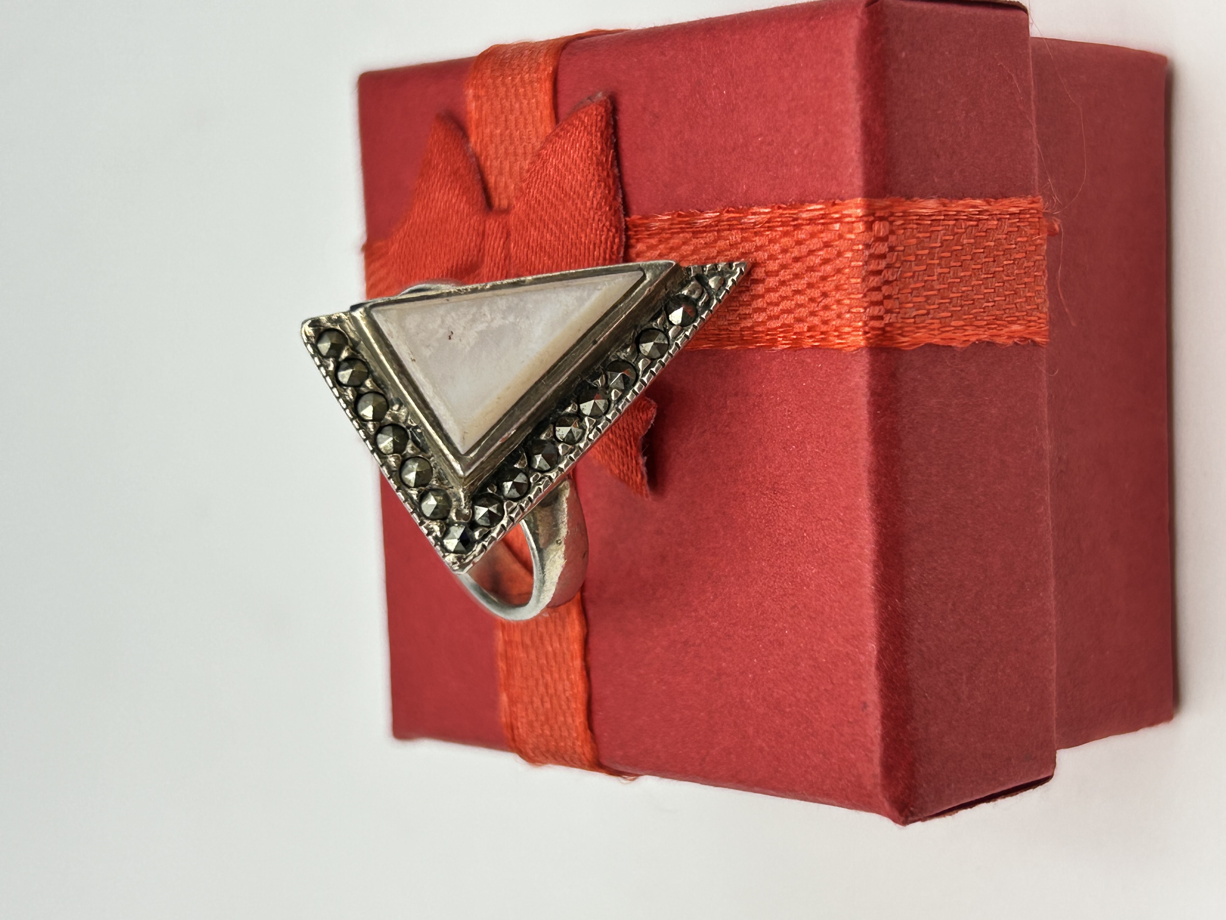A sterling silver cocktail ring designed in the Art Deco style. The piece features a large, asymmetrical triangular head with a central bezel-set triangular panel of cream-coloured mother-of-pearl. This central stone is bordered on two sides by grain-set, faceted marcasite stones. The head is supported by a split shoulder that tapers into a polished D-section band. The inner shank is stamped with the hallmark 925, indicating the metal is sterling silver.
