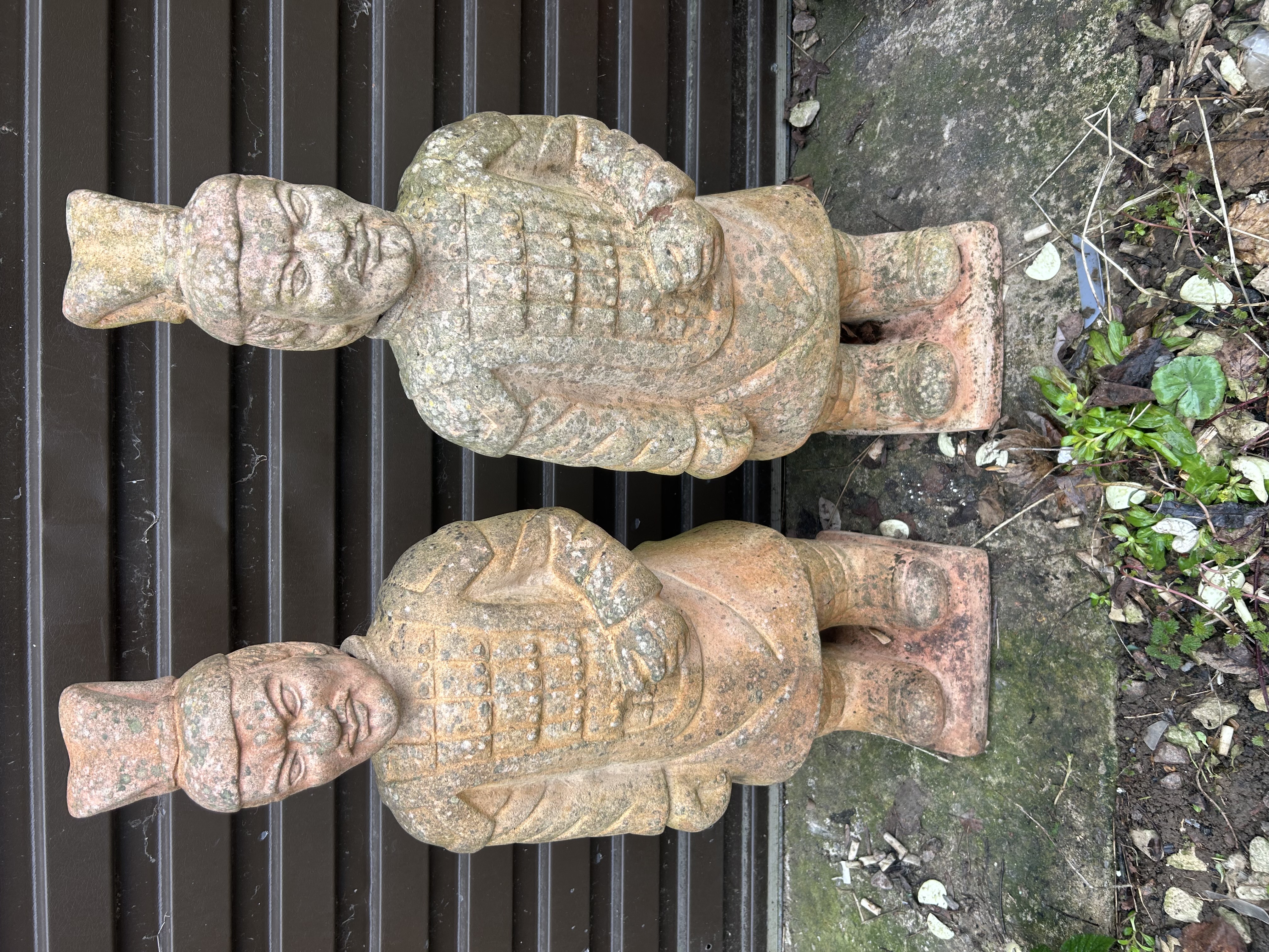 A pair of cast terracotta or composition ceramic garden figures modelled as soldiers from the Terracotta Army. Each figure is depicted in a standing pose wearing traditional military attire, including an armoured tunic with square plates, a pleated robe, and a characteristic topknot headdress. The figures are mounted on integral rectangular plinth bases. One figure features hands positioned to hold a staff or weapon, which is no longer present. These items are modern decorative reproductions produced in the late 20th or early 21st century. No reign marks, inscriptions, or maker’s marks are visible on the exterior surfaces or bases.