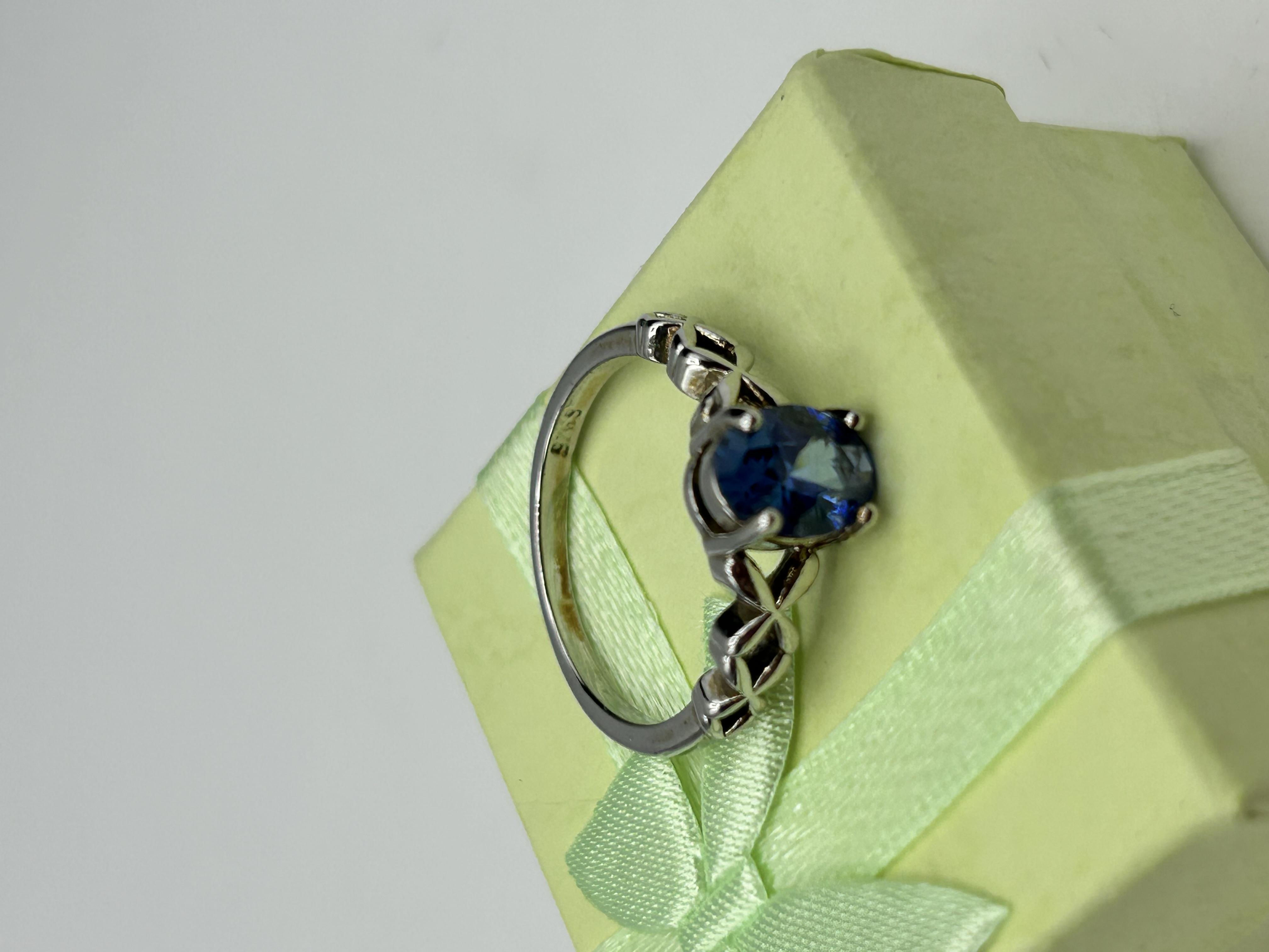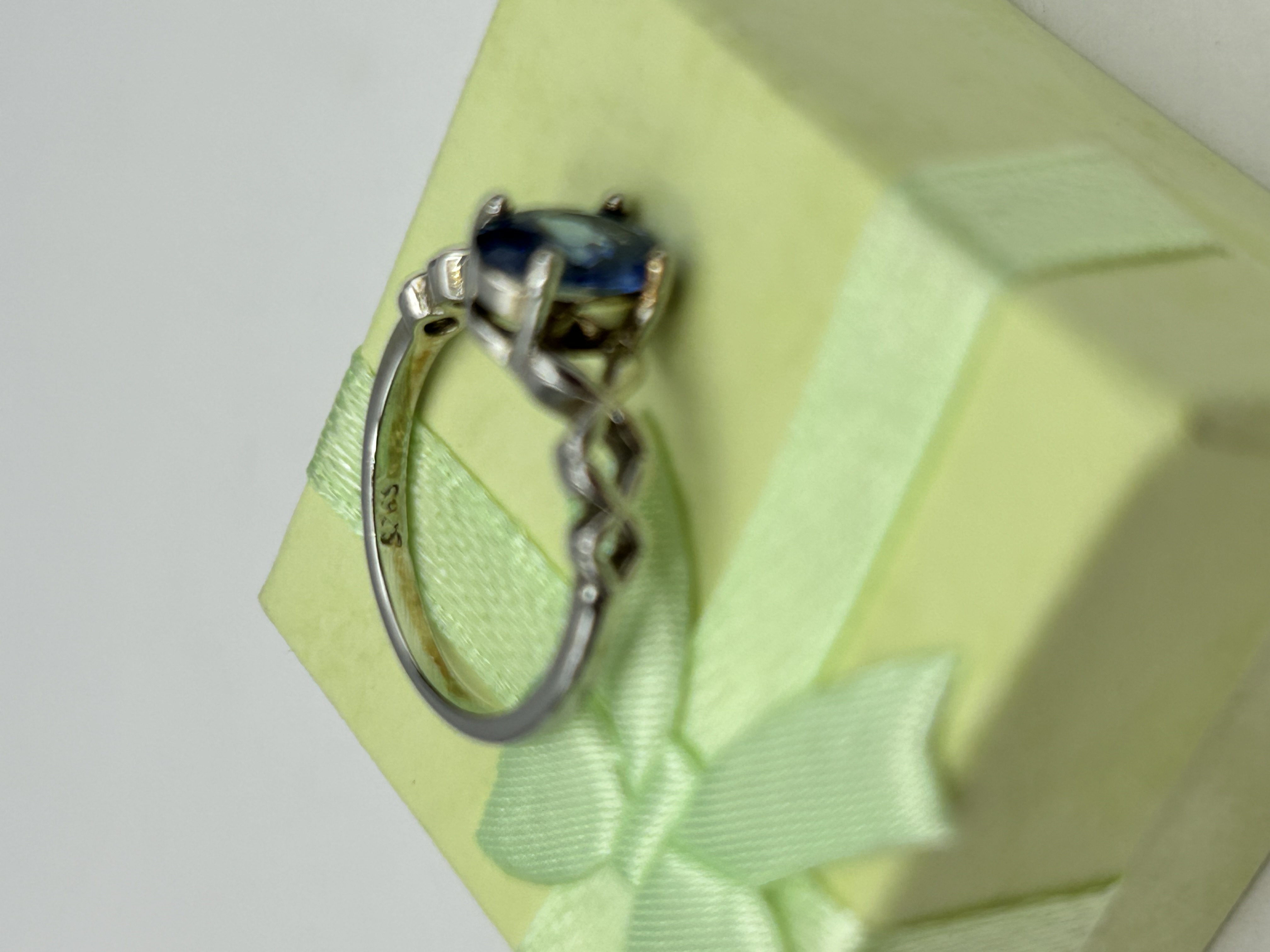 A sterling silver dress ring featuring a central oval-faceted blue stone. The shoulders of the ring are decorated with an openwork Celtic-inspired criss-cross design. The central stone is secured in a four-prong claw setting. The interior of the band is stamped with the mark S925, confirming the material as sterling silver.