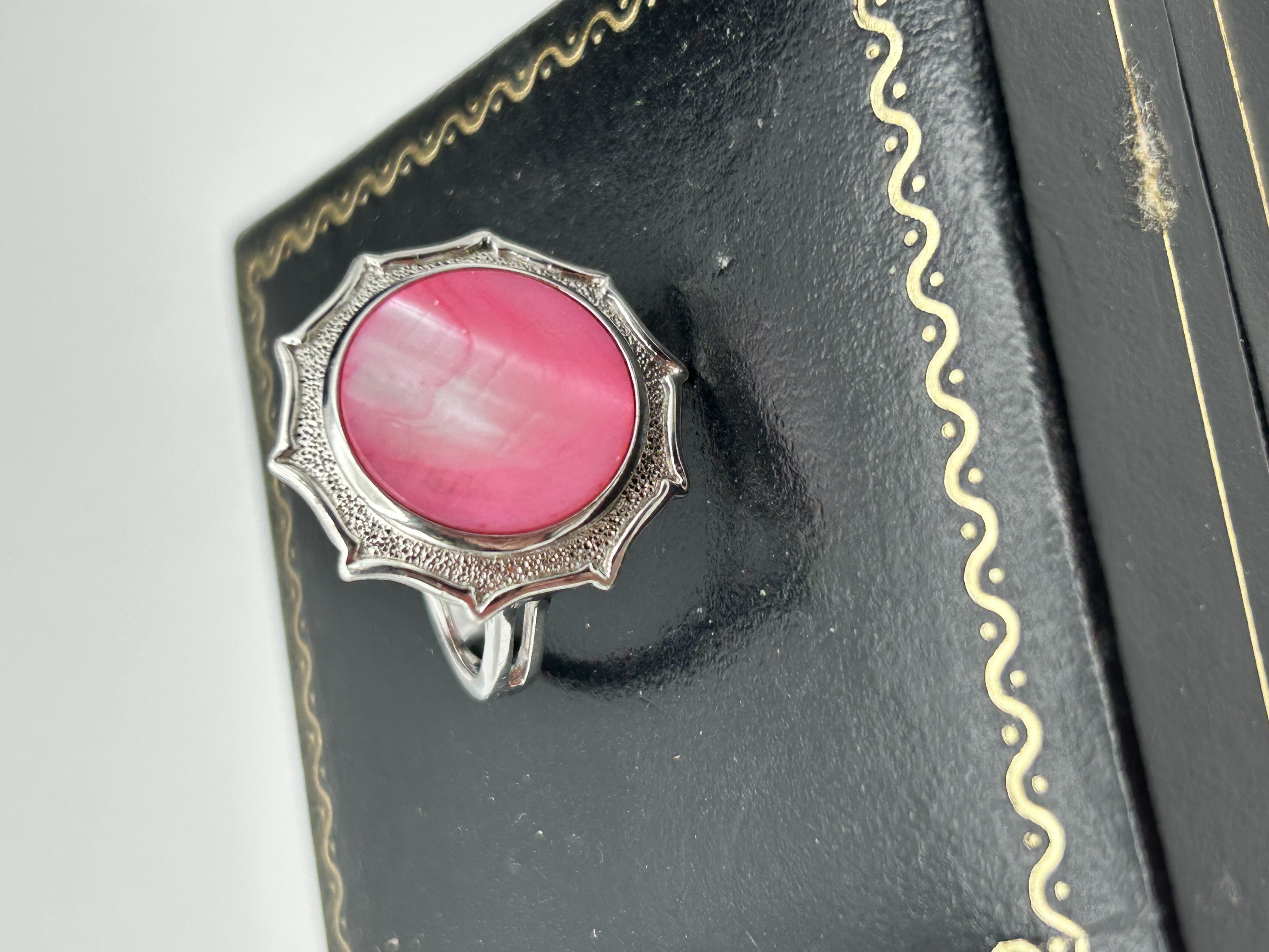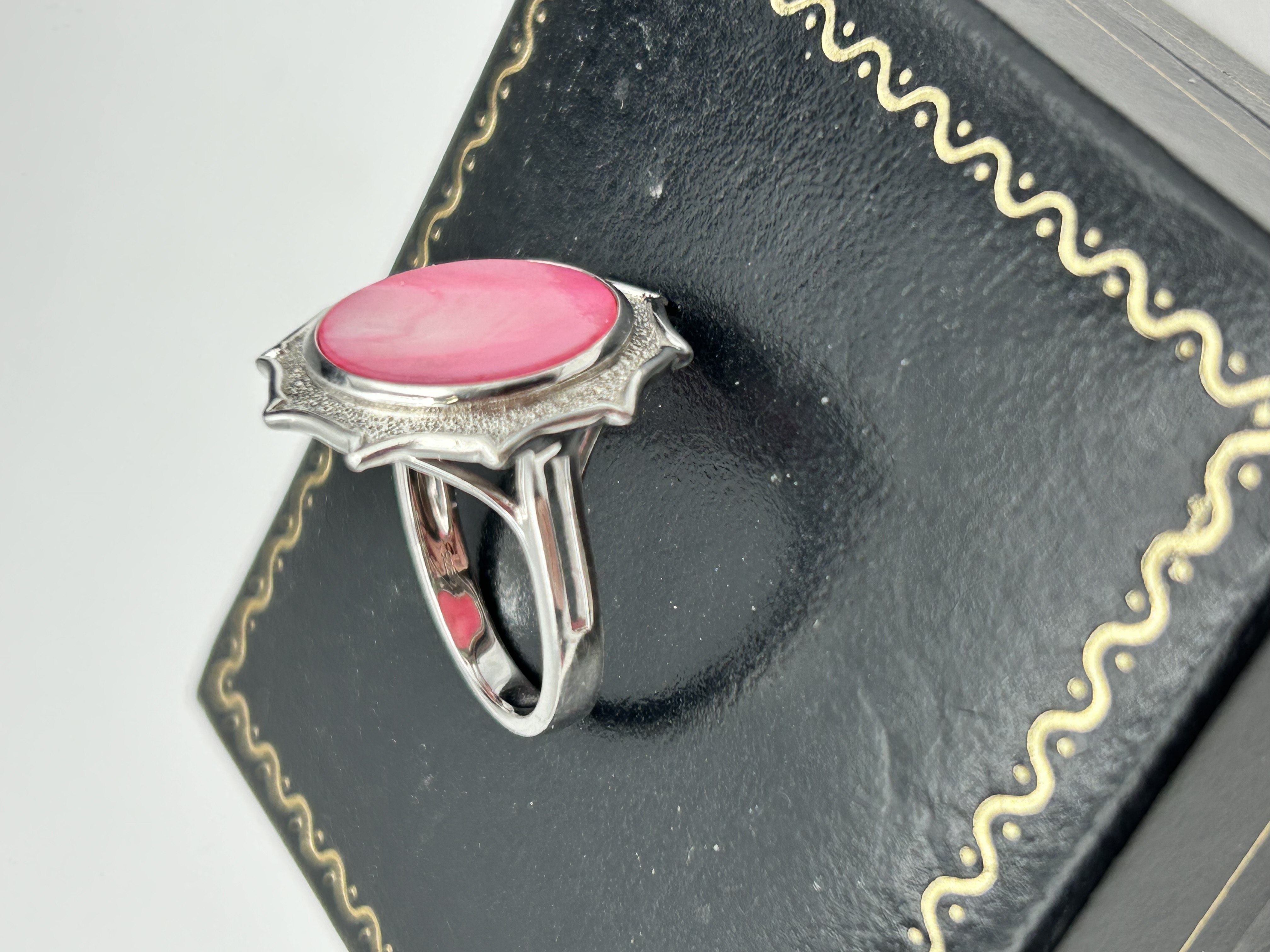 A silver cocktail ring featuring a large oval pink cabochon. The stone displays chatoyant properties consistent with mother-of-pearl or dyed shell. The central stone is bezel-set within a decorative mount characterized by a scalloped edge and a stippled, textured border. The ring is constructed with a split-shoulder shank. A small rectangular mark is present on the interior of the shank, though the characters are not clearly legible. The ring is presented in a black faux-leather jewellery box with gold-tone Greek key and scrollwork tooling.