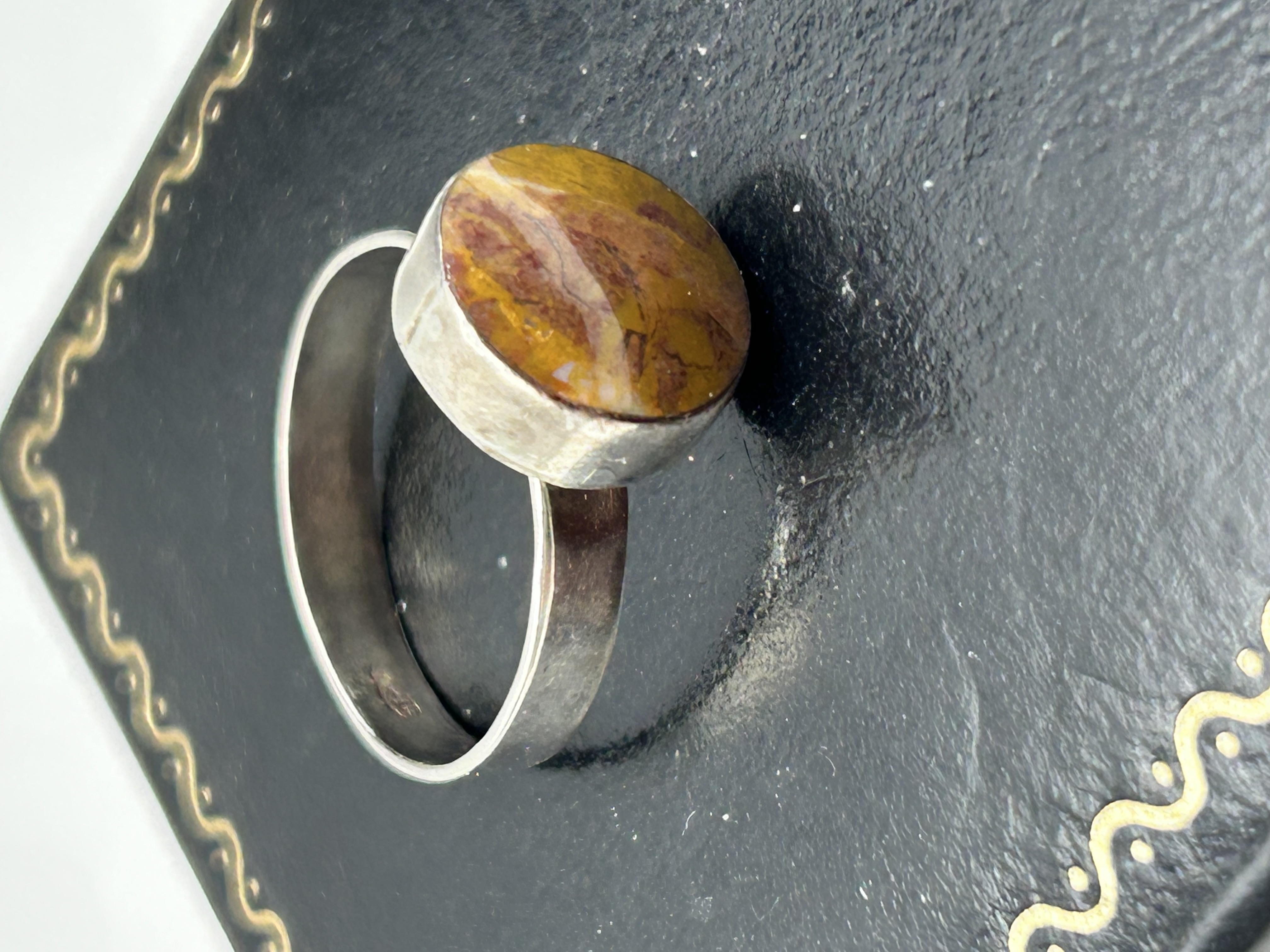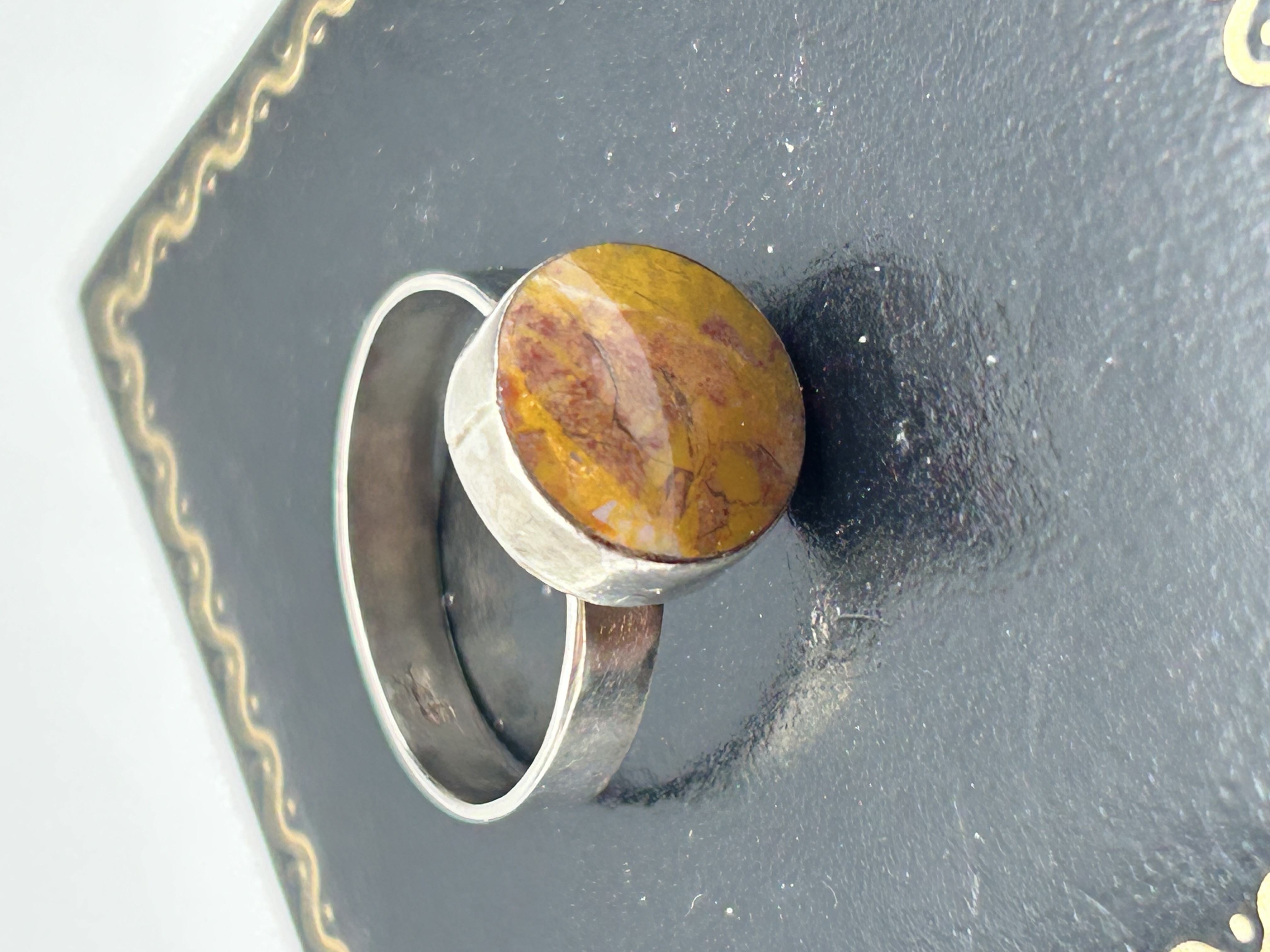 A silver cocktail ring featuring a large circular cabochon-cut variegated jasper stone. The stone exhibits a mottled pattern of mustard yellow, reddish-brown, and earthy brown tones, characteristic of varieties such as Mookaite jasper. The stone is housed in a full bezel setting atop a wide, flat-profile band. The interior of the band is impressed with the numerals 925, indicating sterling silver fineness, alongside other indistinct marks.