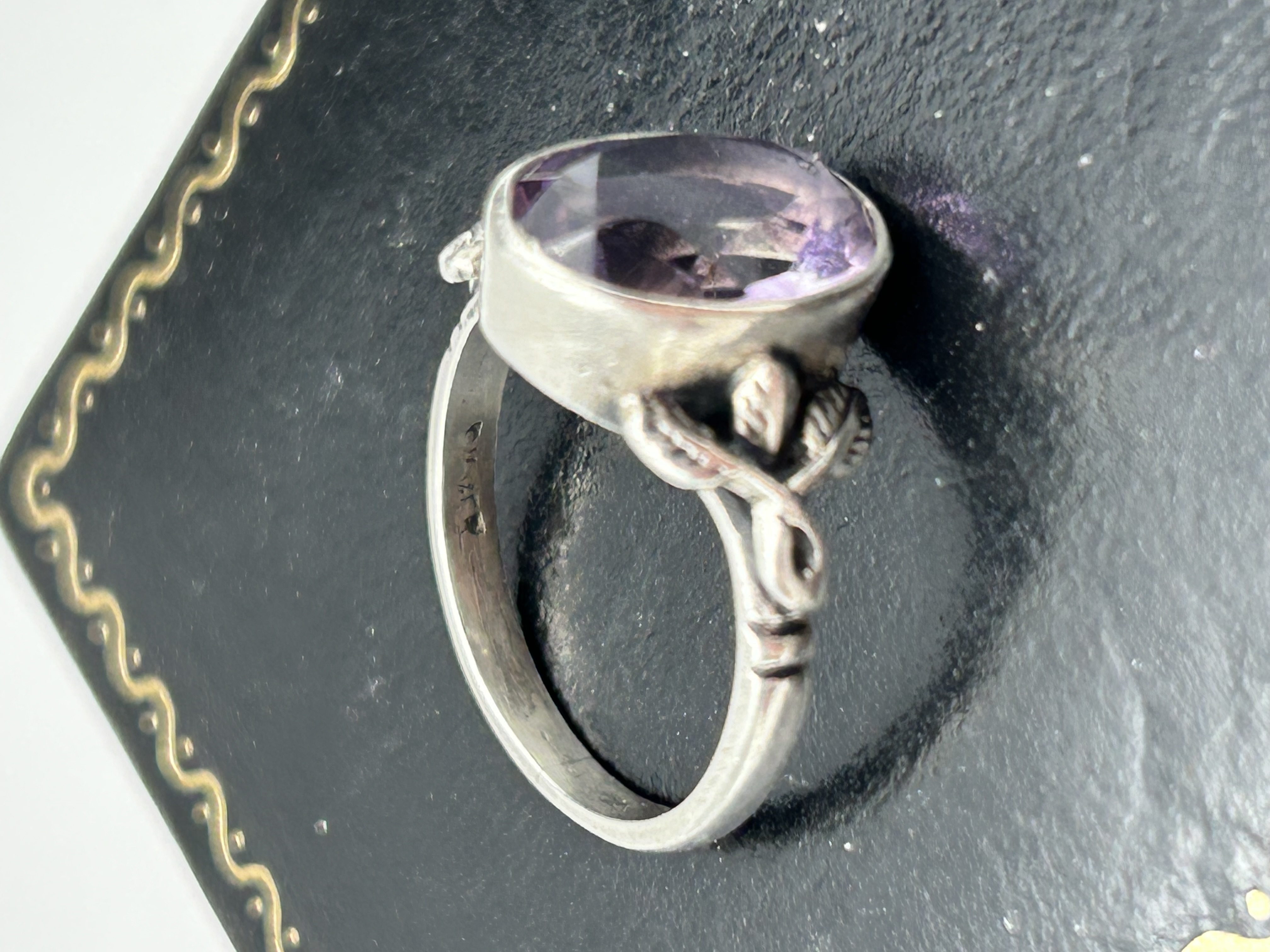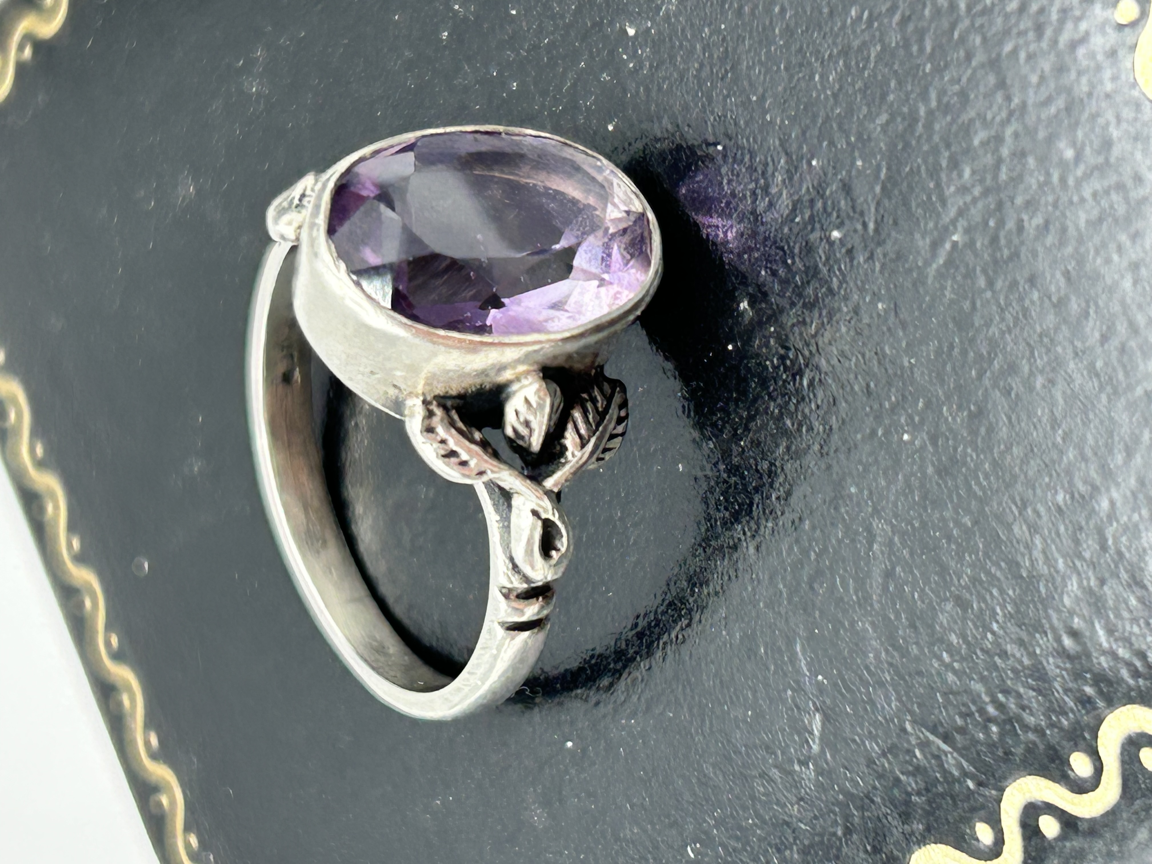 A silver cocktail ring in the Arts and Crafts style, featuring a single large oval-cut purple gemstone, likely an amethyst. The gemstone is secured within a deep collet setting. The ring features decorative shoulders with cast foliate motifs, including stylised leaves and buds, which taper into a plain D-section band. The interior of the shank is incised with the characters 925, indicating the item is sterling silver. The design and foliate metalwork are characteristic of pieces attributed to the jeweller Bernard Instone.