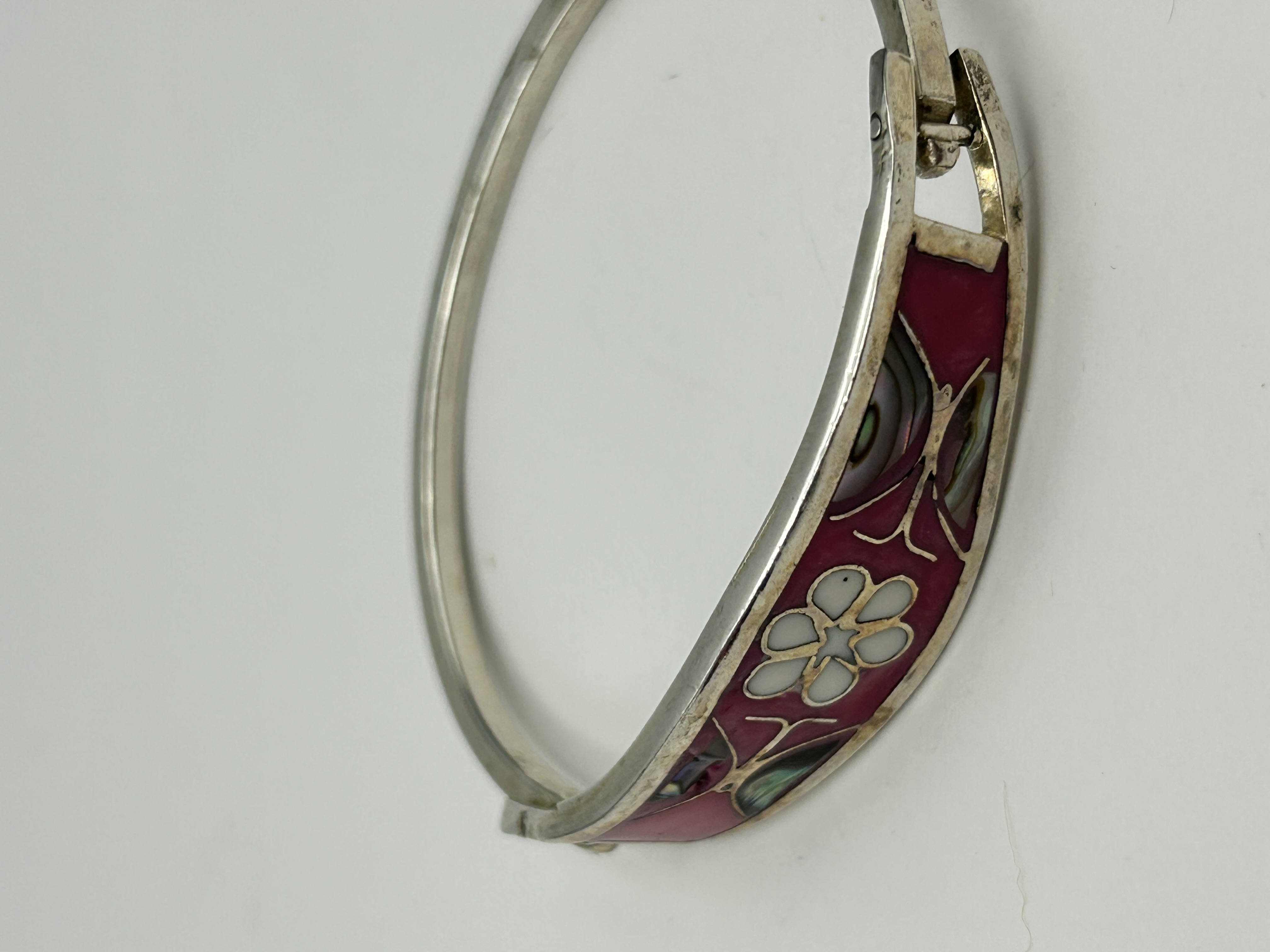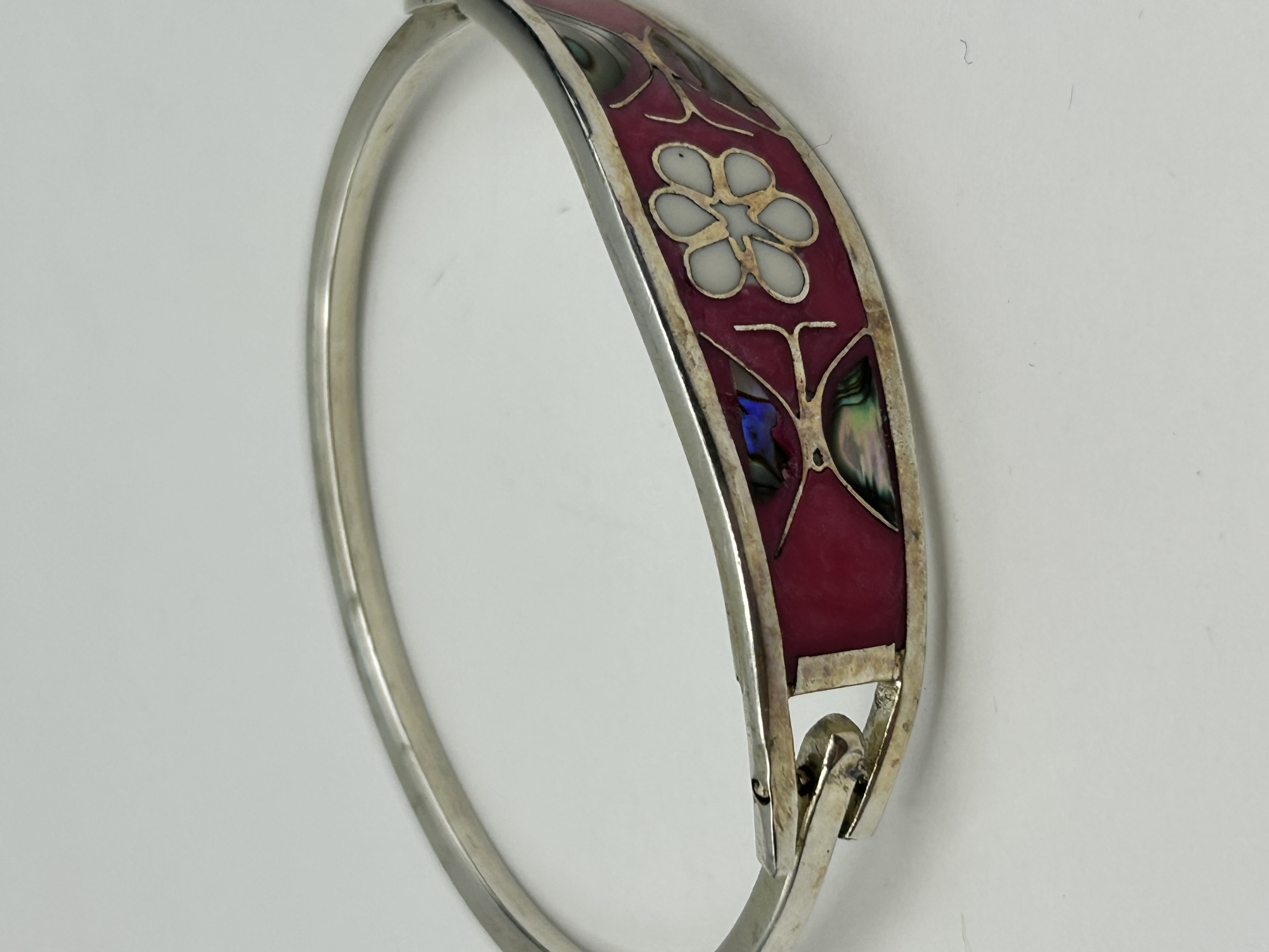 A Mexican silver hinged bangle featuring a decorative curved front panel. The panel is decorated with a red enamel ground, inlaid with mother-of-pearl in a floral motif and accented with iridescent abalone shell. The bracelet is designed with a hinged opening and a concealed tongue-and-groove clasp, including a small loop for a safety chain. The interior of the band is stamped with the mark MEXICO.