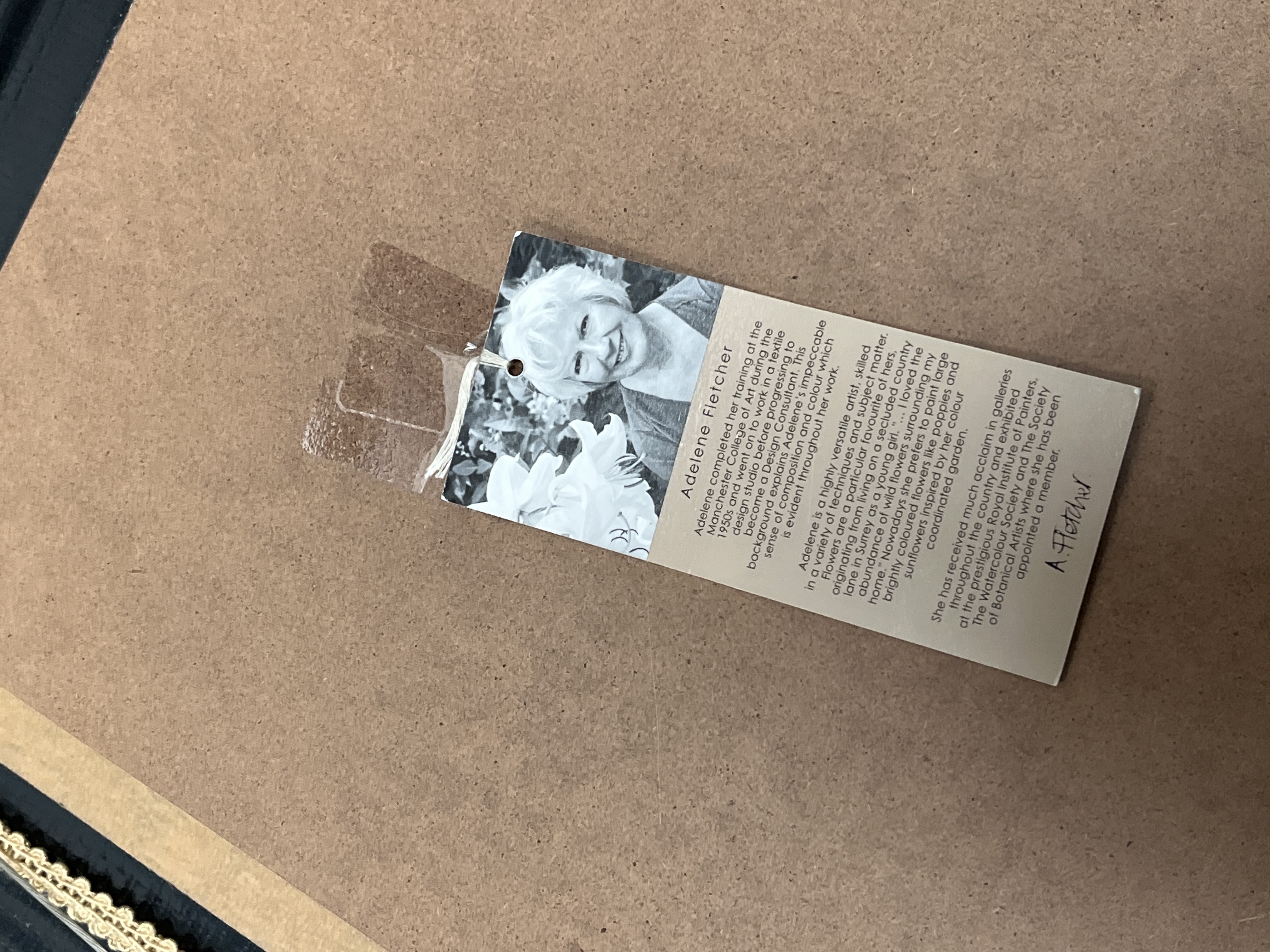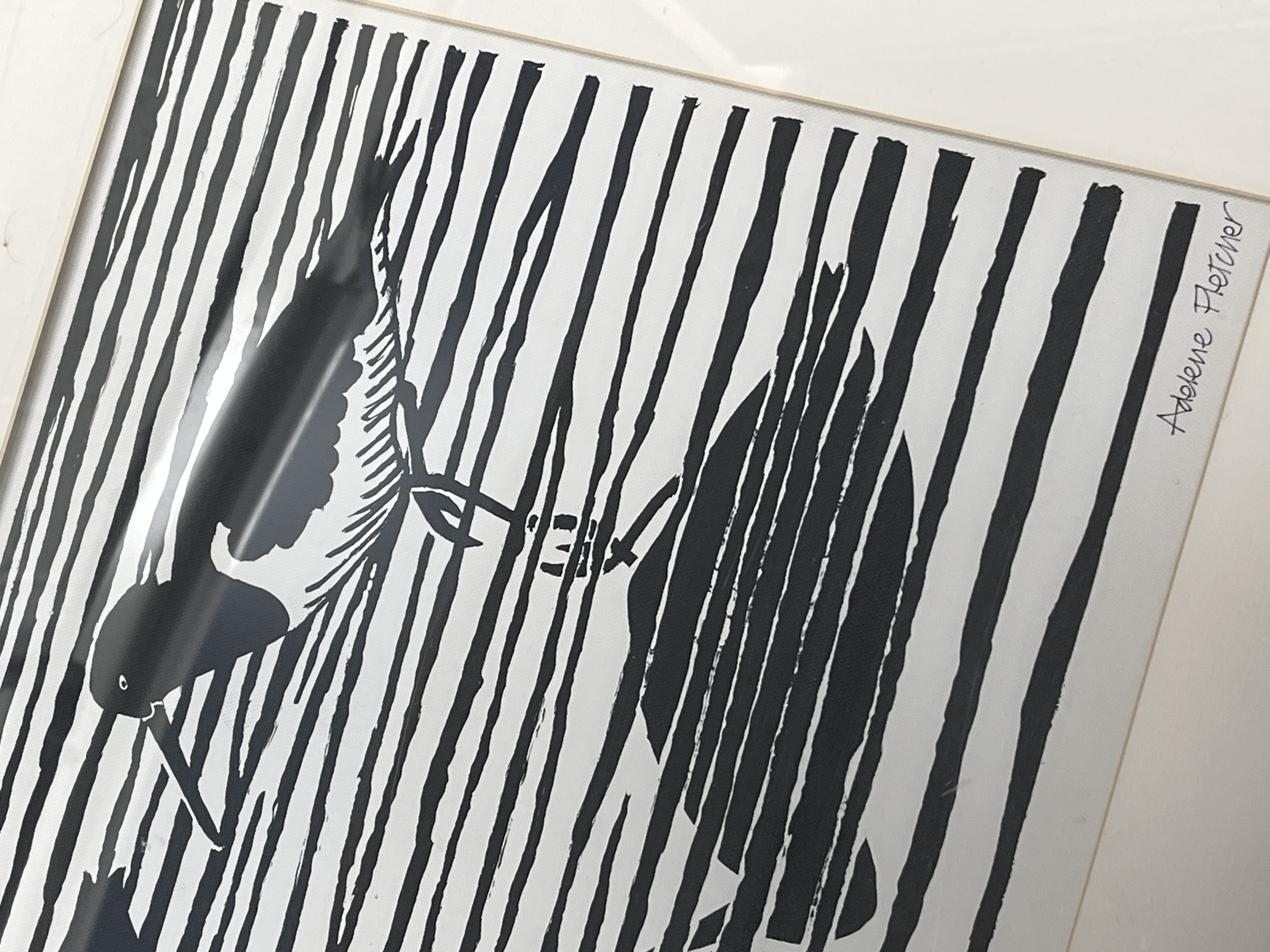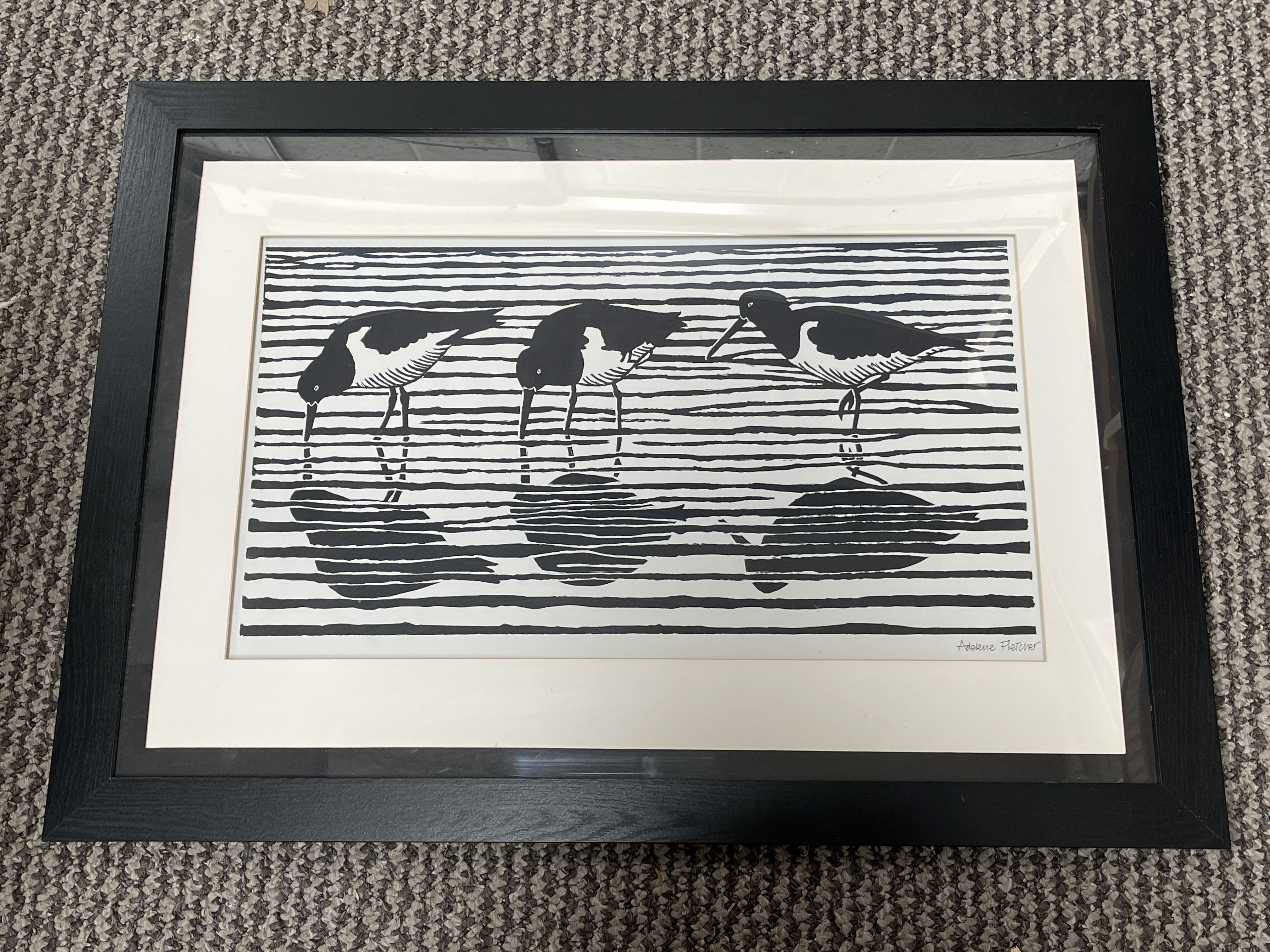 Adelene Fletcher, a modern graphic print depicting three oystercatchers standing in water. The composition is rendered in a relief-style aesthetic, using bold horizontal black and white bands to define the forms of the birds and their reflections. This work is a commercial reproduction and does not utilize intaglio techniques such as etching or engraving; there is no plate mark or characteristic ink texture present. The impression is a high-quality commercial print with no visible plate wear or manual printing artifacts. The lower right corner features the printed signature of the artist. Information on the reverse from The Wight Studios for Art Marketing identifies the artist as a Manchester-trained designer and member of the Society of Botanical Artists. No edition numbering or publisher marks are present on the face of the work. The print is housed in a modern black frame with a white mount.