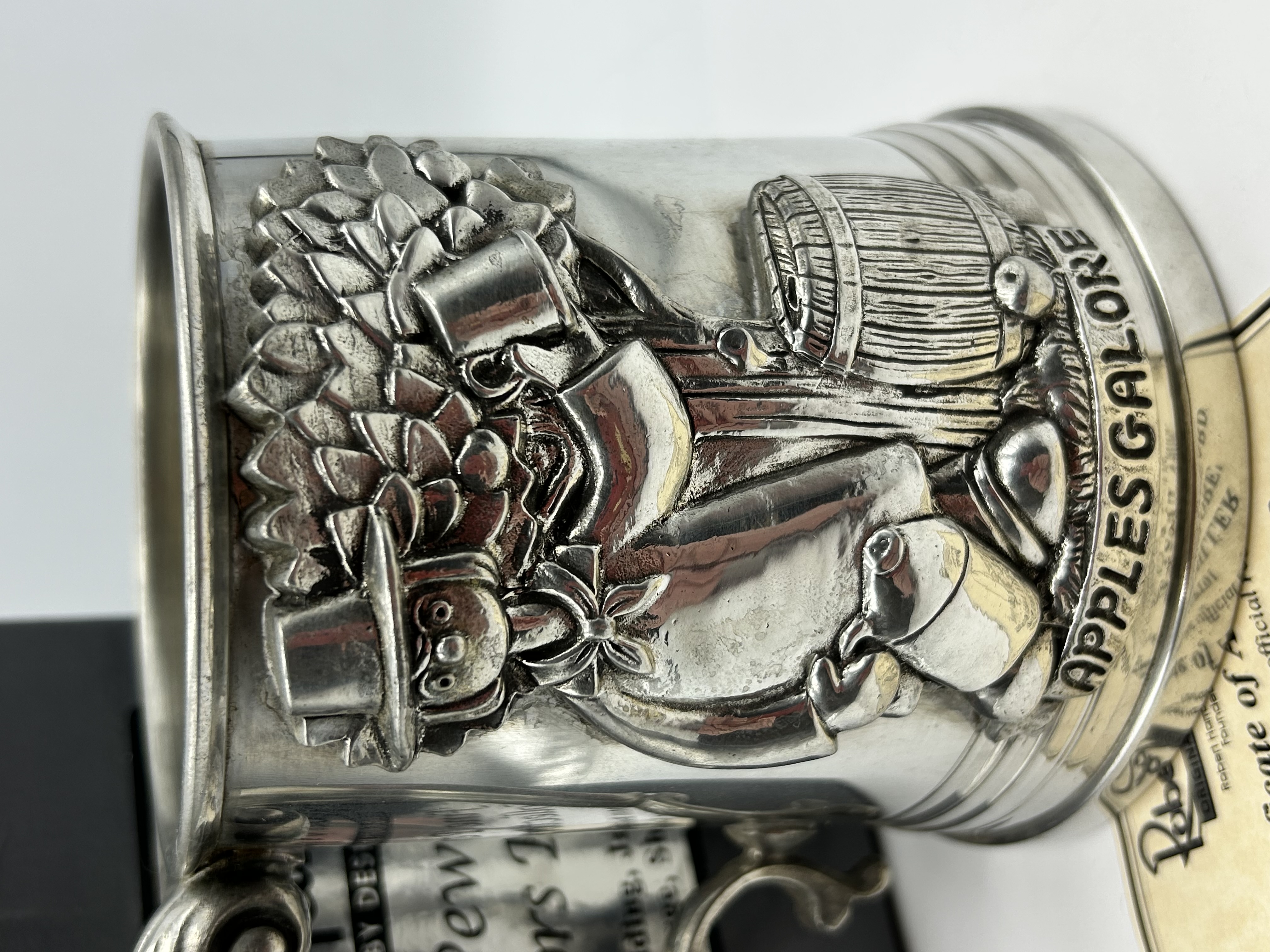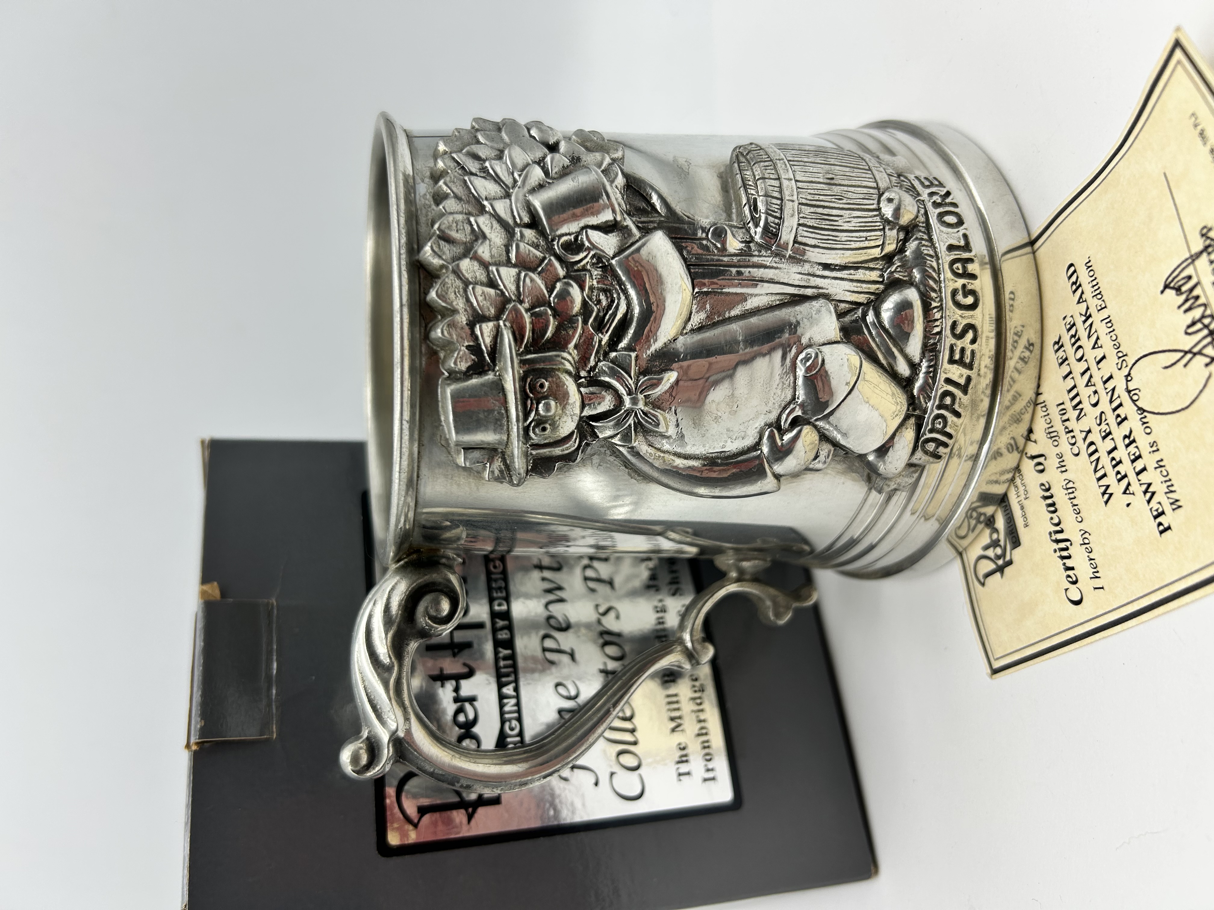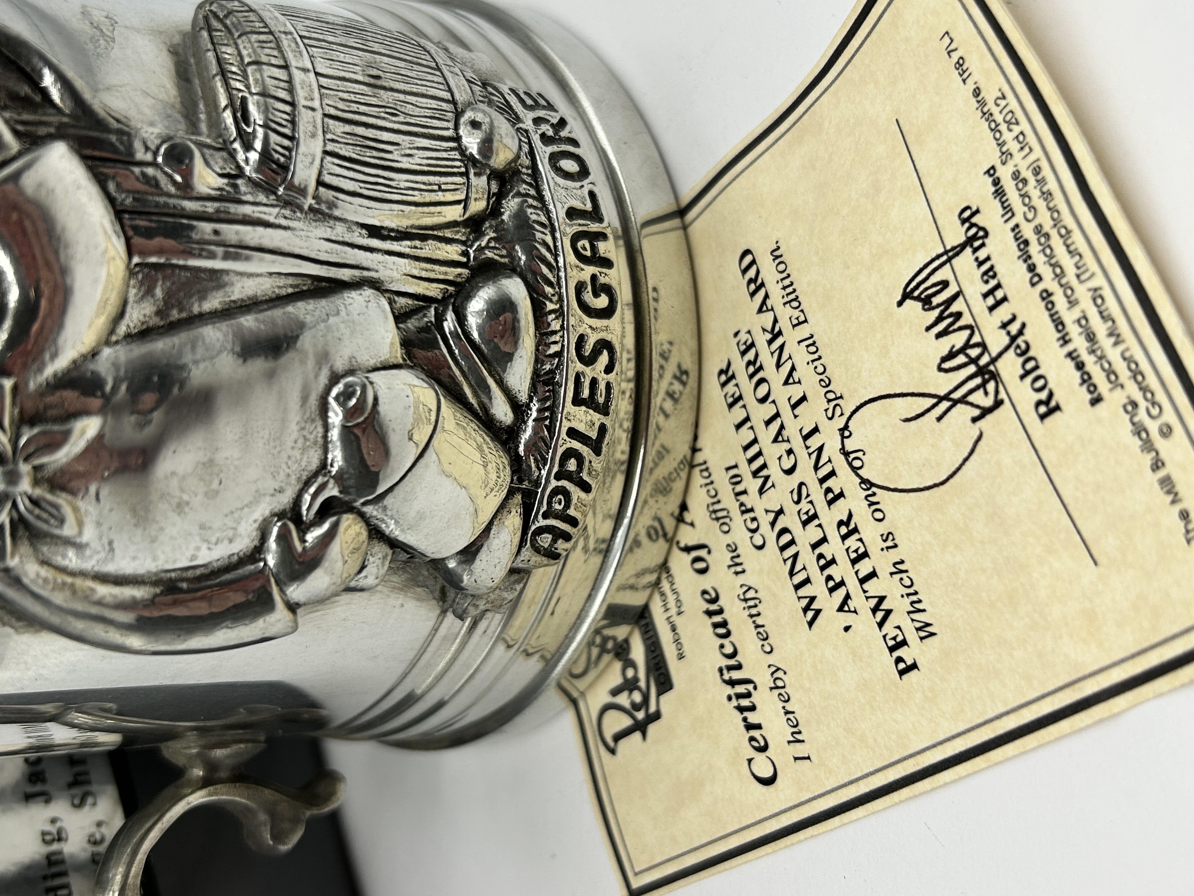 A commemorative pewter pint tankard by Robert Harrop Designs Limited, featuring the character Windy Miller from the children’s television series Camberwick Green. The body is cast with a high-relief moulded scene titled Apples Galore, depicting the character alongside an apple tree, a cider barrel, and a press. The vessel is designed with a flared rim, a stepped base, and a decorative S-scroll handle. The side of the tankard bears the raised inscription APPLES GALORE. A label to the underside of the base is marked Robert Harrop, ORIGINALITY BY DESIGN, Pewter, Collectors Club, CGPT01, and includes the manufacturer’s Shropshire address. The item is accompanied by its original cardboard box and a Certificate of Authenticity signed by Robert Harrop, identifying the piece as a Special Edition with model number CGPT01 and a 2012 copyright date.