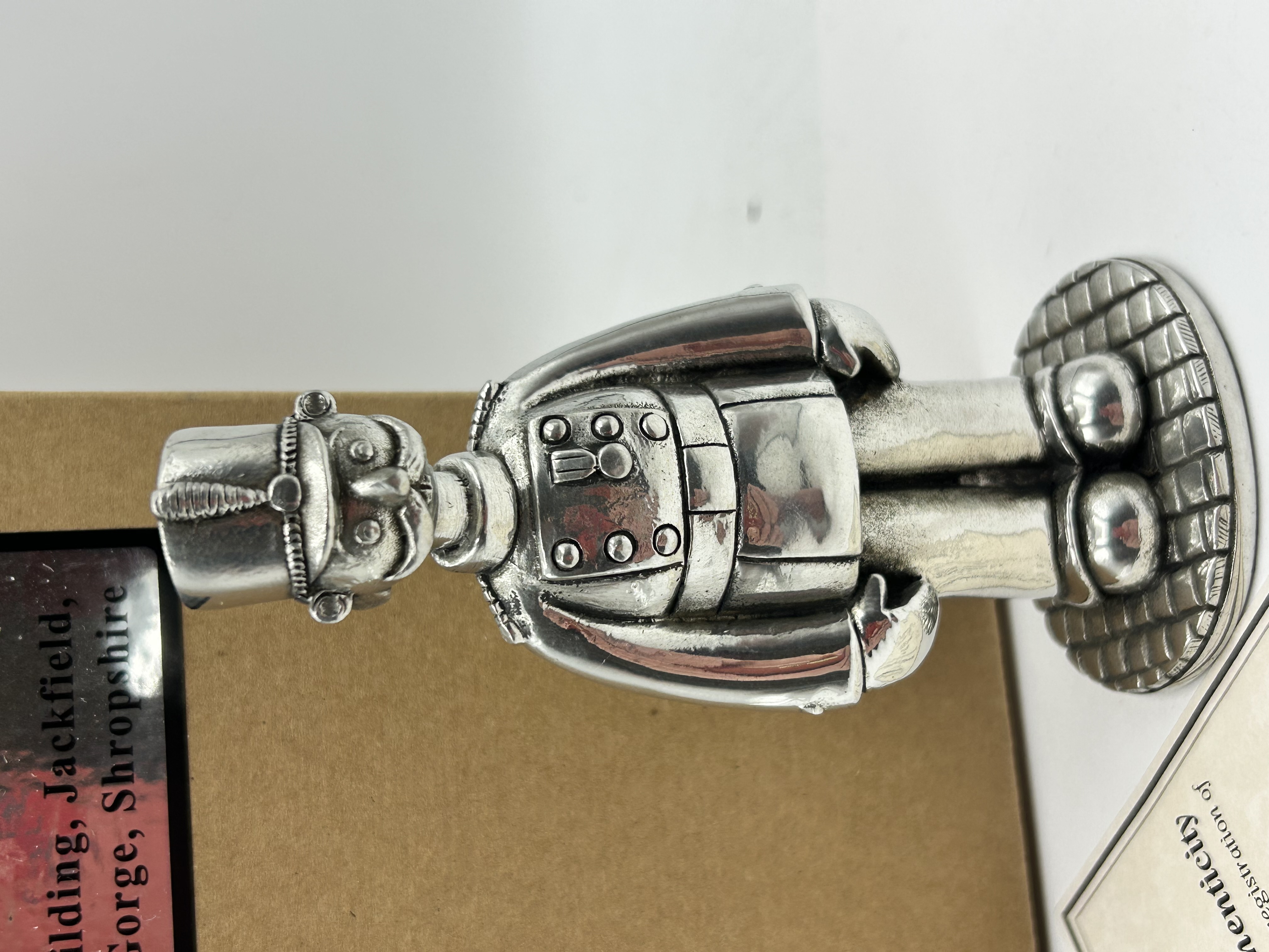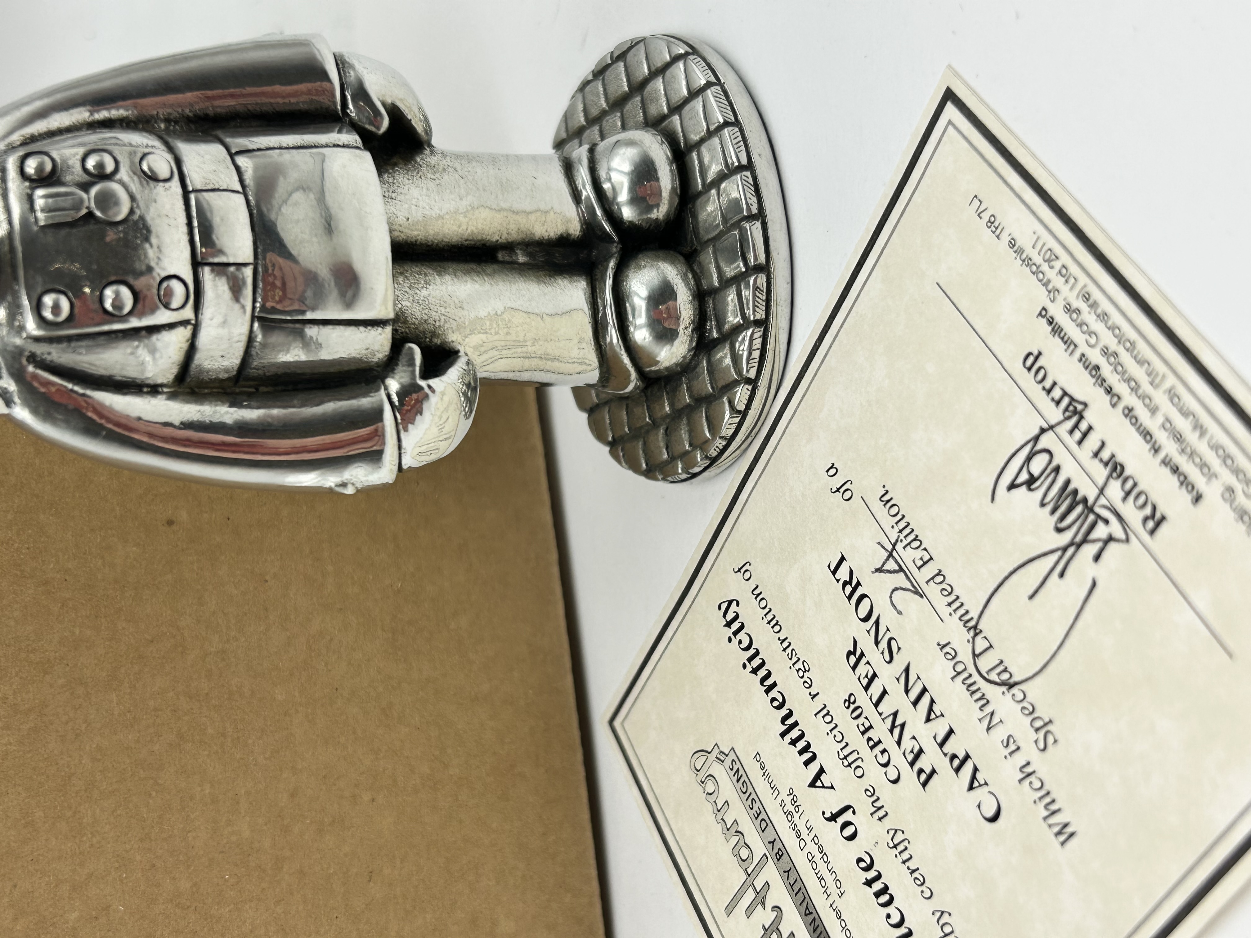 A limited edition fine pewter figurine produced by Robert Harrop Designs, depicting the character Captain Snort from The Bash Street Kids. The figure is rendered in a formal military-style uniform, including a pillbox hat and a tunic detailed with buttons and a medal. The character is posed with hands at his sides, standing upon a circular base with a cobblestone texture. The item is accompanied by its original cardboard box and a Certificate of Authenticity. The certificate identifies the model as CGPE08 and confirms this piece is number 24 of a Special Limited Edition. Manufactured in Jackfield, Ironbridge Gorge, Shropshire, United Kingdom.