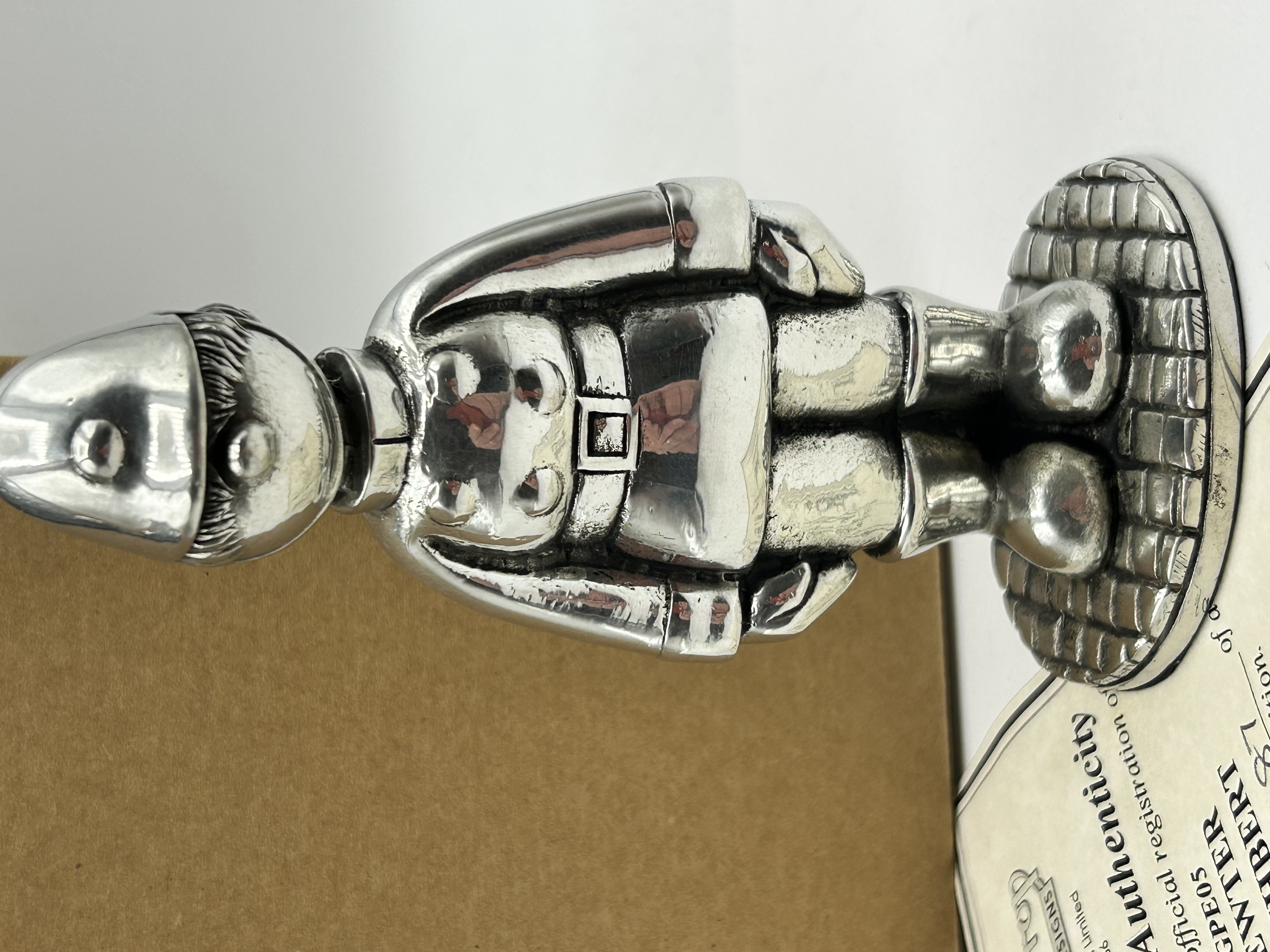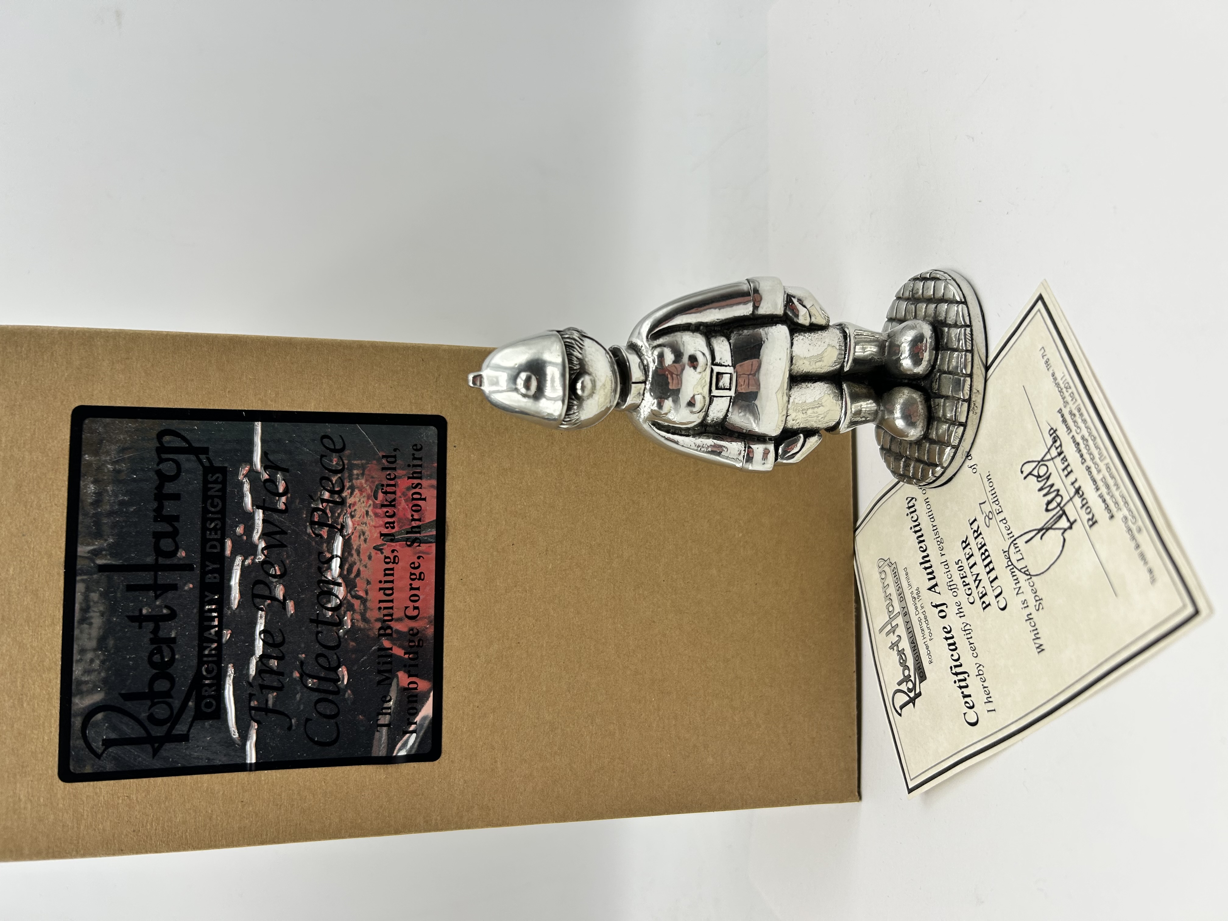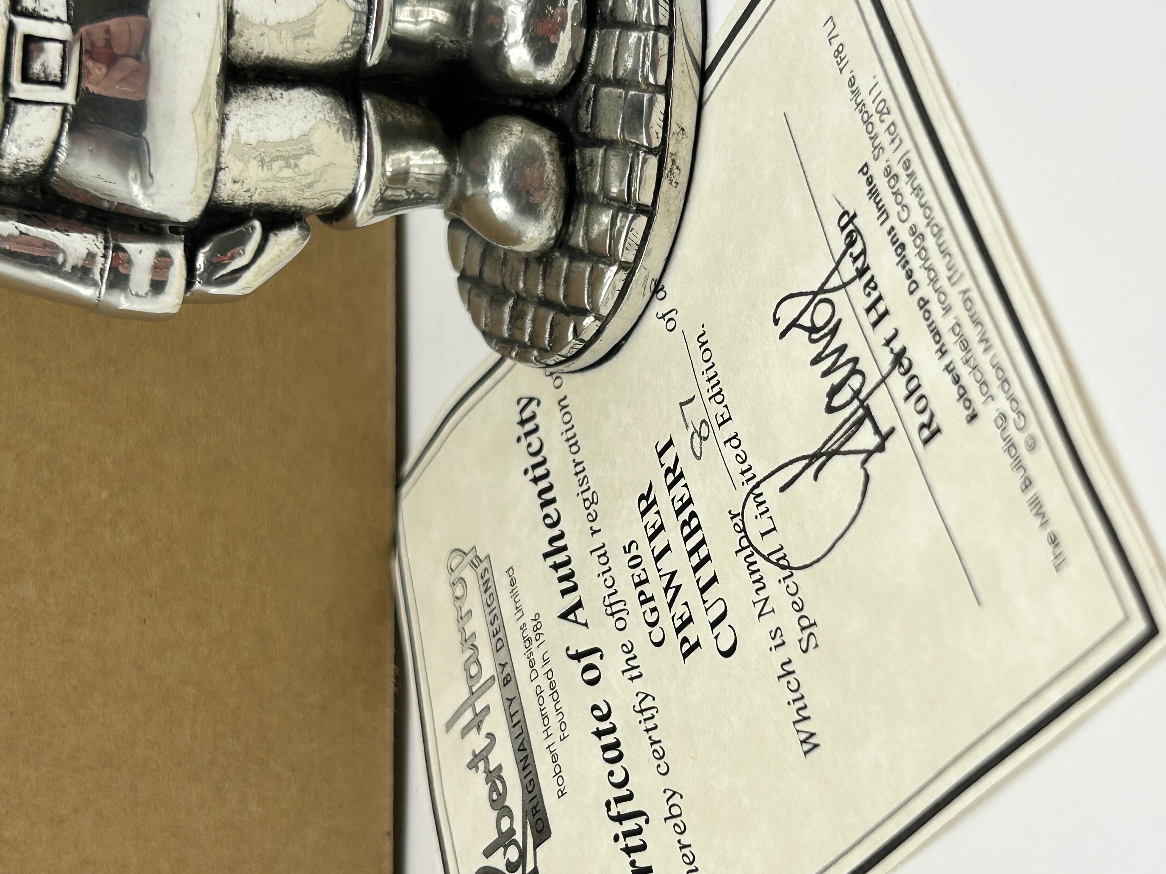 A cast and polished fine pewter figurine depicting the character Cuthbert from the Gordon Murray stop-motion television series Camberwick Green. The character is portrayed in his signature uniform, standing upon a circular base with a moulded cobblestone texture. This item was manufactured by Robert Harrop Designs Ltd at The Mill Building, Jackfield, Shropshire. The figurine is accompanied by its original cardboard packaging and a hand-numbered Certificate of Authenticity. The certificate identifies the piece as model number CGPE05 and records it as number 87 of a special limited edition.