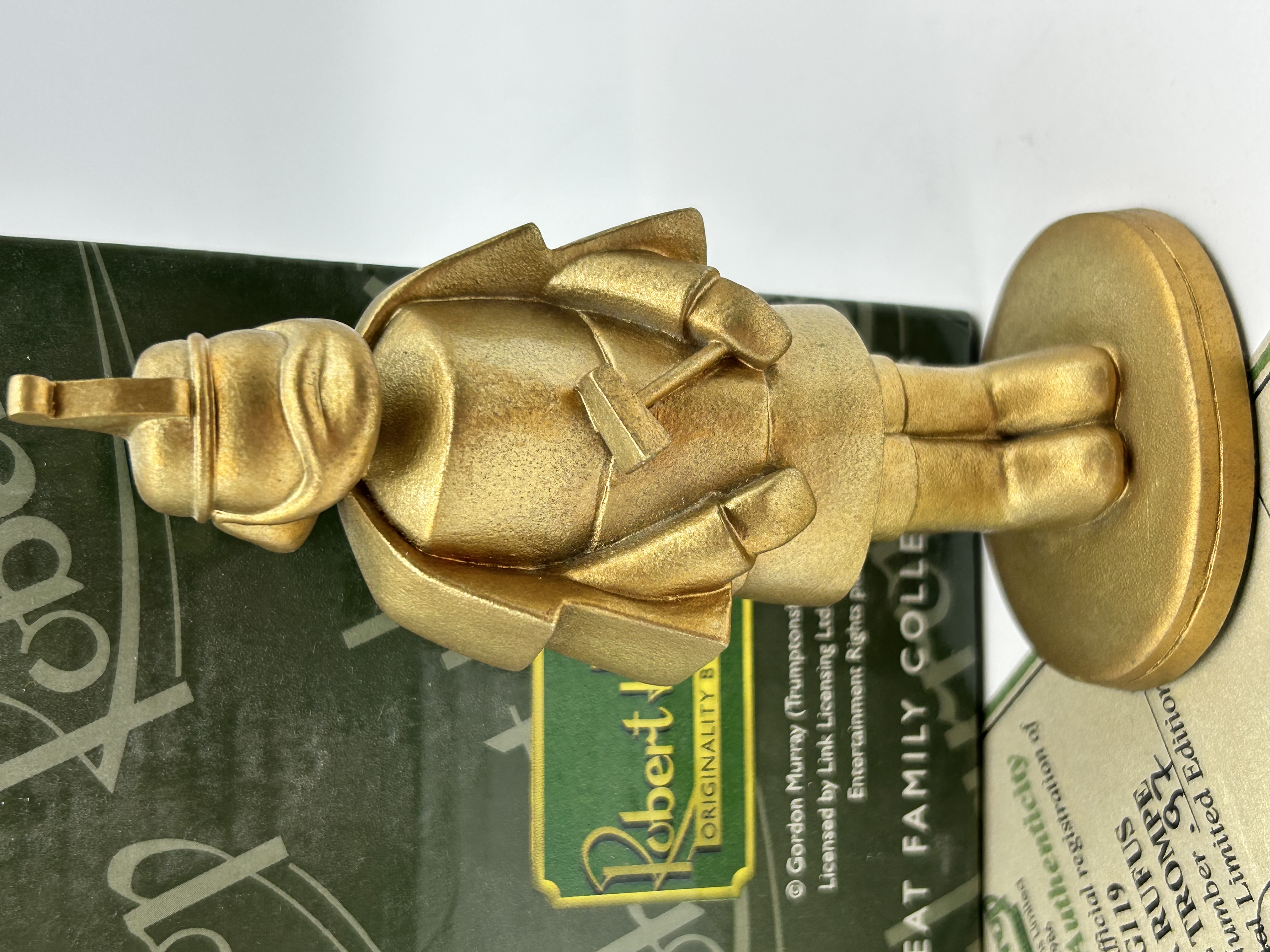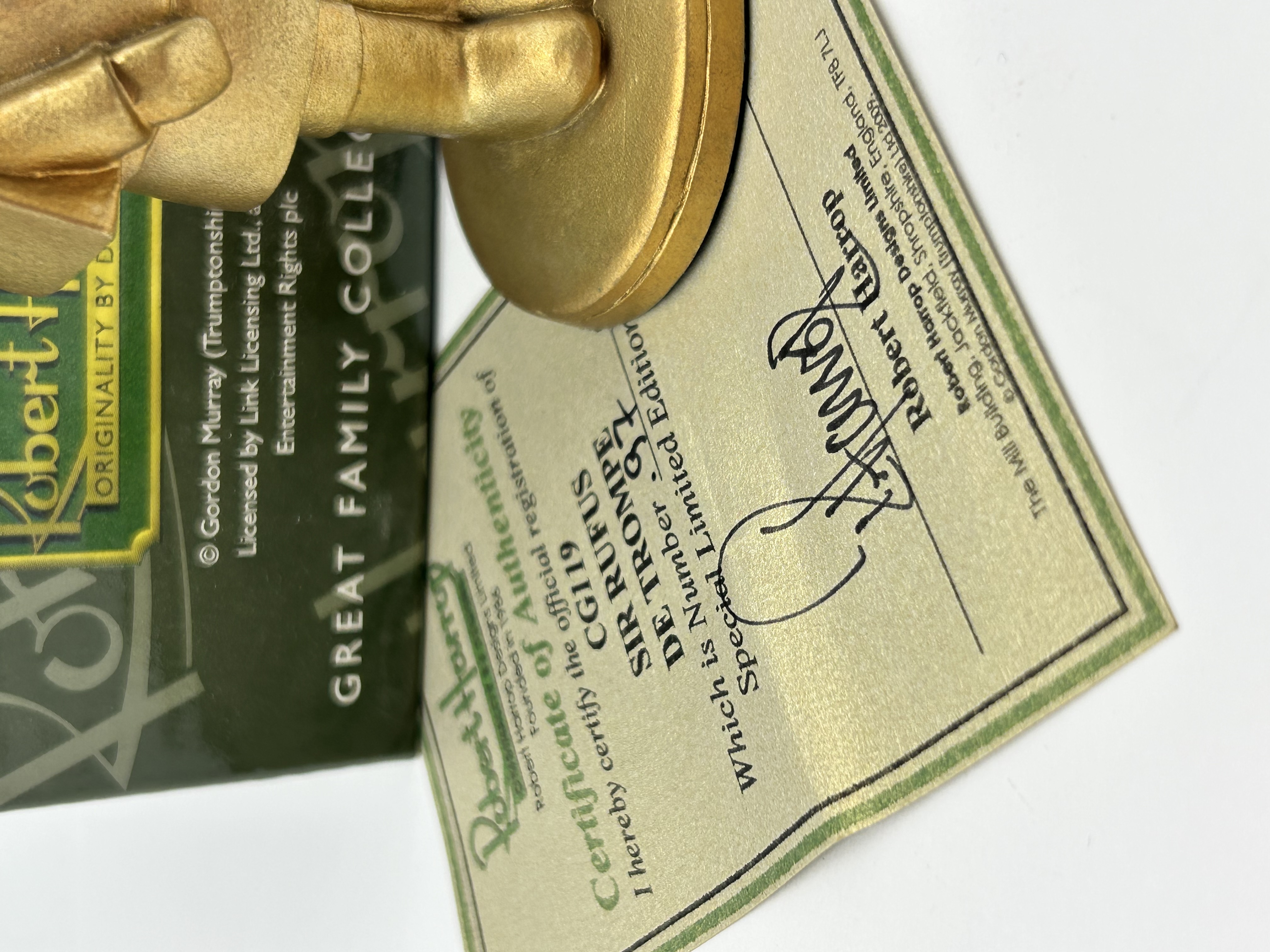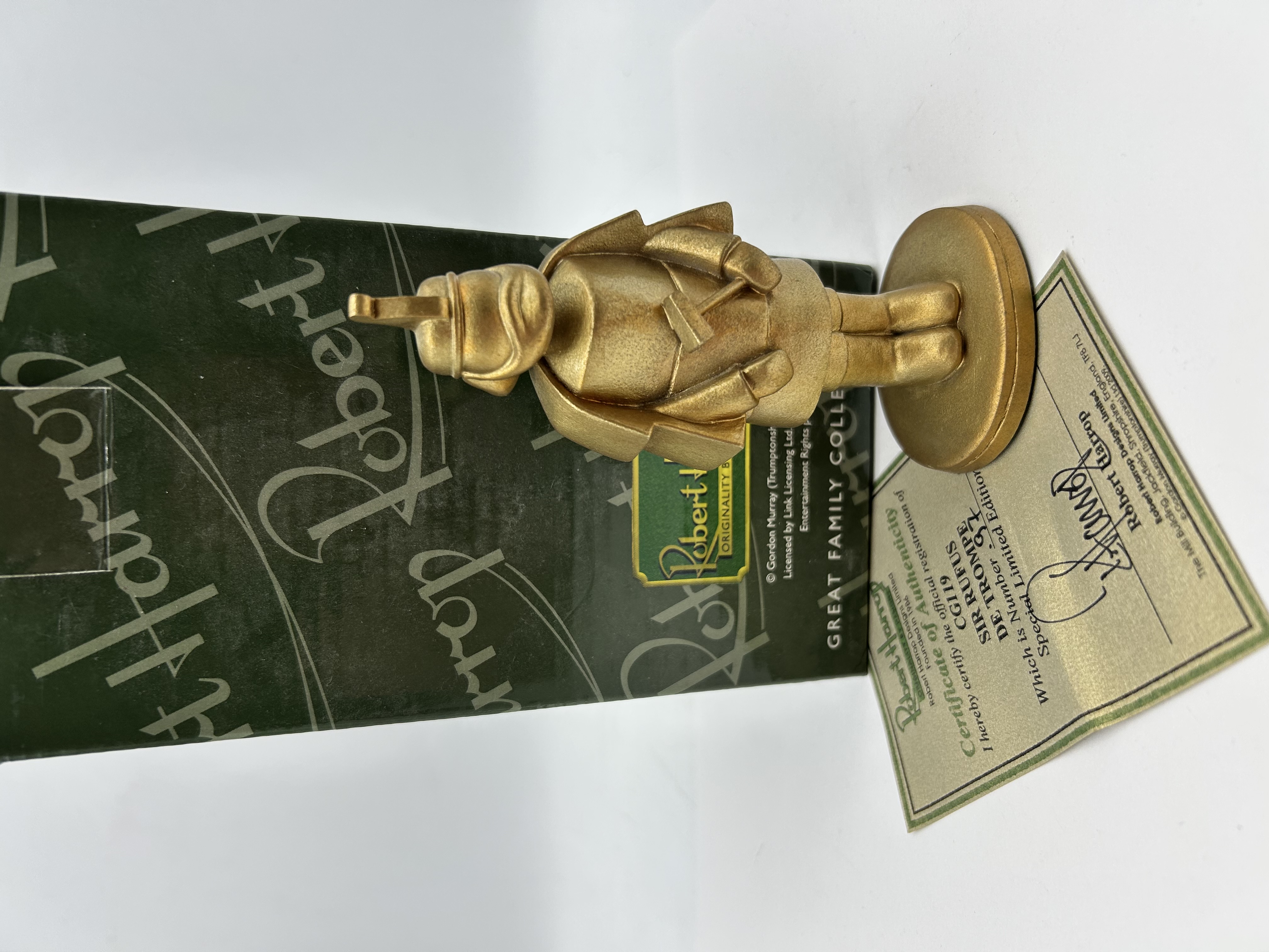 A Robert Harrop Designs limited edition figurine, model number CG119, depicting the character Sir Rufus De Trompe from the Gordon Murray stop-motion animated series Camberwick Green. The figurine is cast in resin with a matte metallic gold-toned finish. The character is portrayed in a fireman’s uniform, wearing a helmet and holding a fireman’s axe, standing upon a circular integral base. This piece is designated as number 97 of a Special Limited Edition. The lot includes the original Robert Harrop Great Family Collections cardboard packaging and a matching Certificate of Authenticity. The certificate bears the copyright Gordon Murray (Trumptonshire) Ltd 2009 and identifies the manufacturer’s location as Jackfield, Shropshire, England.
