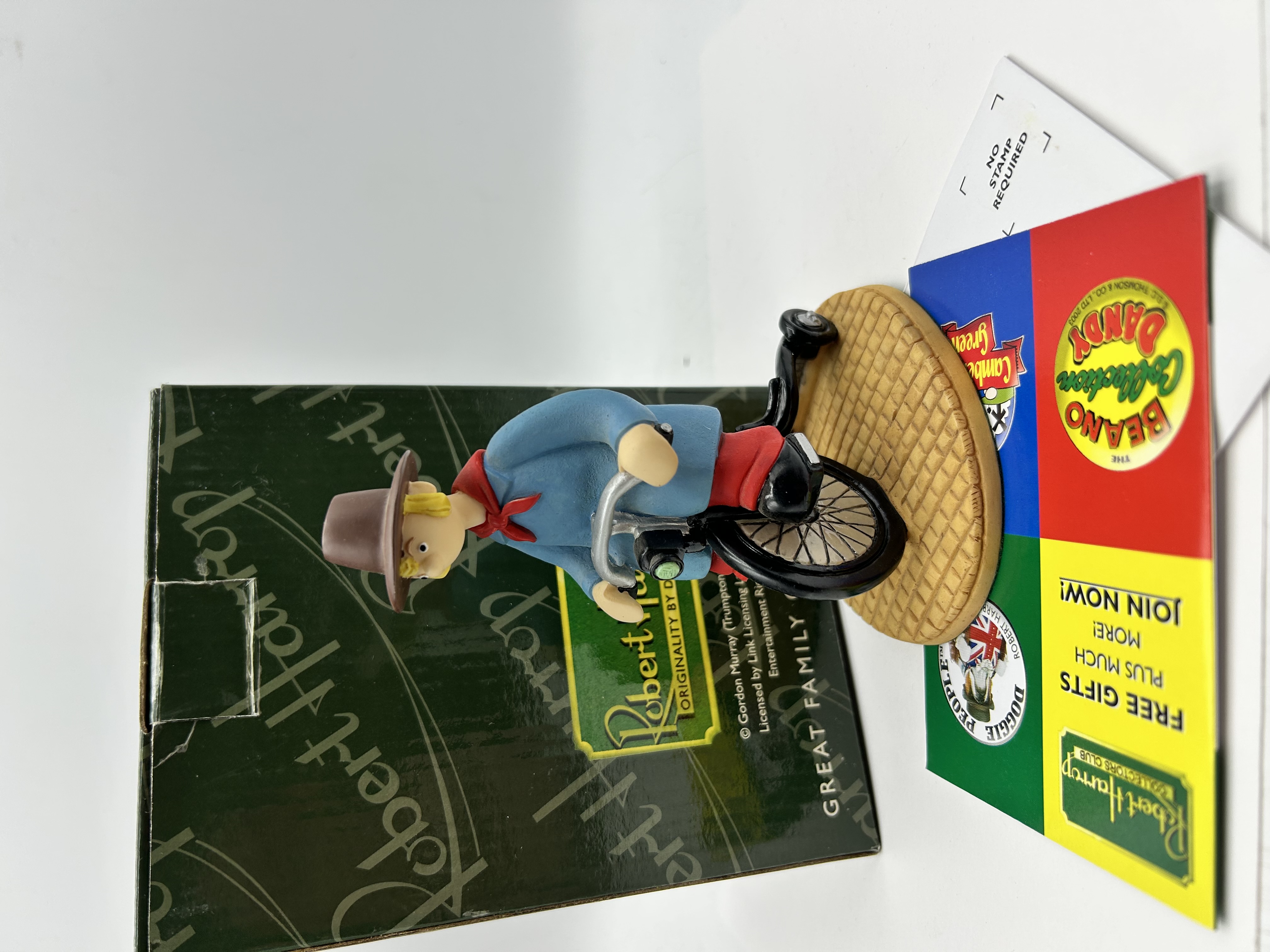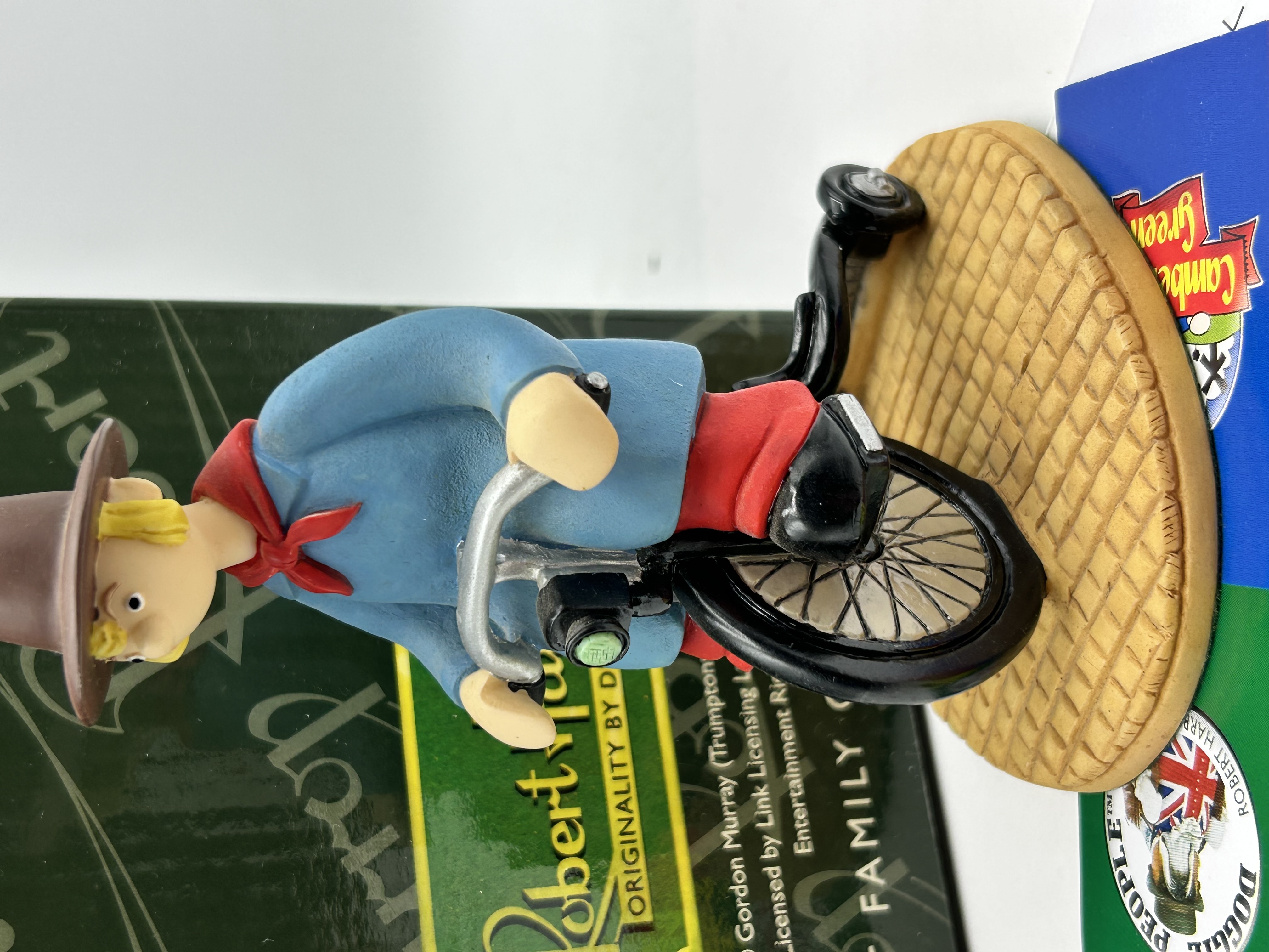 A hand-painted cast resin figurine produced by Robert Harrop Designs Ltd, depicting the character Windy Miller from the British stop-motion television series Camberwick Green. The character is portrayed riding a bicycle upon a circular base with a moulded cobblestone texture. He is dressed in his signature attire consisting of a blue smock, a red neckerchief, red trousers, and a brown wide-brimmed hat. The figurine is accompanied by its original green branded box and a Robert Harrop Collectors Club promotional card dated 2003. Legible text on the packaging and collateral includes Robert Harrop, Originality by Design, © Gordon Murray (Trumptonshire) Ltd, and Licensed by Link Licensing Ltd.