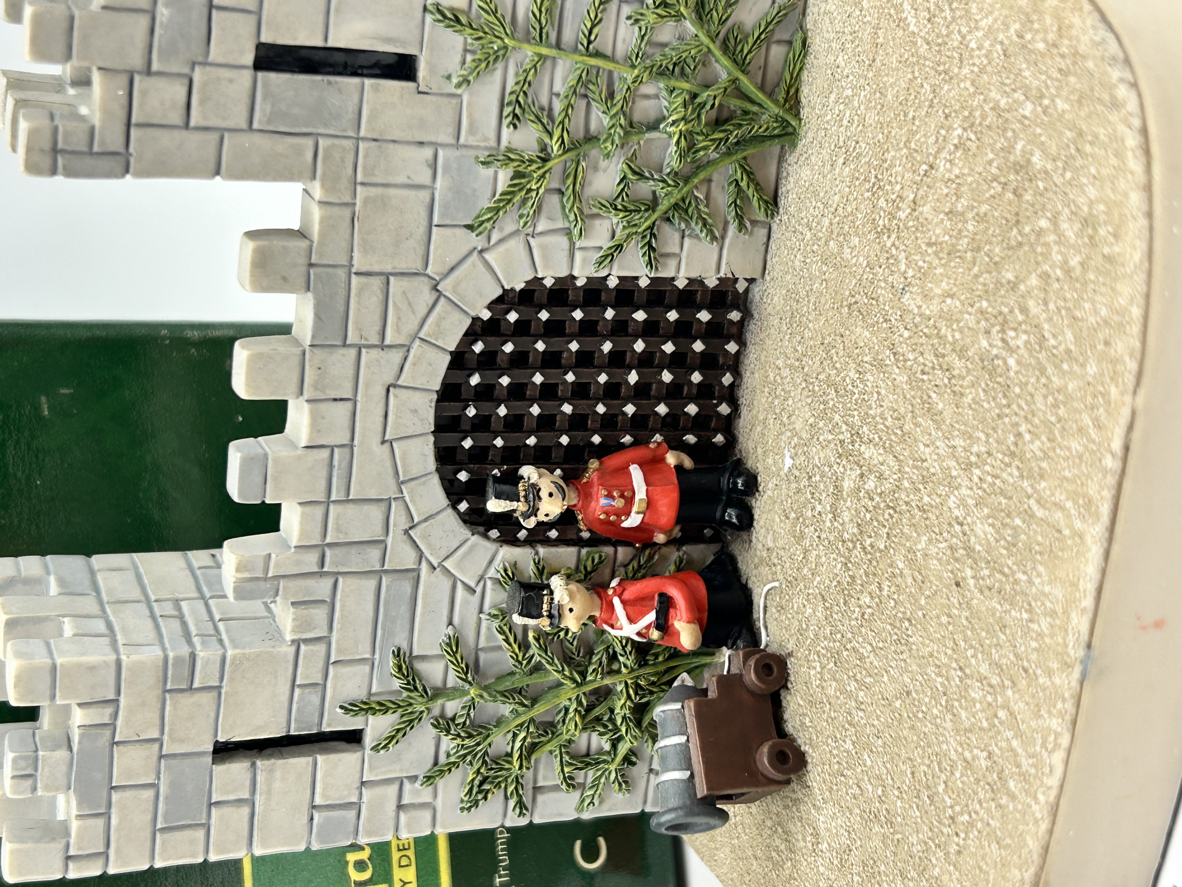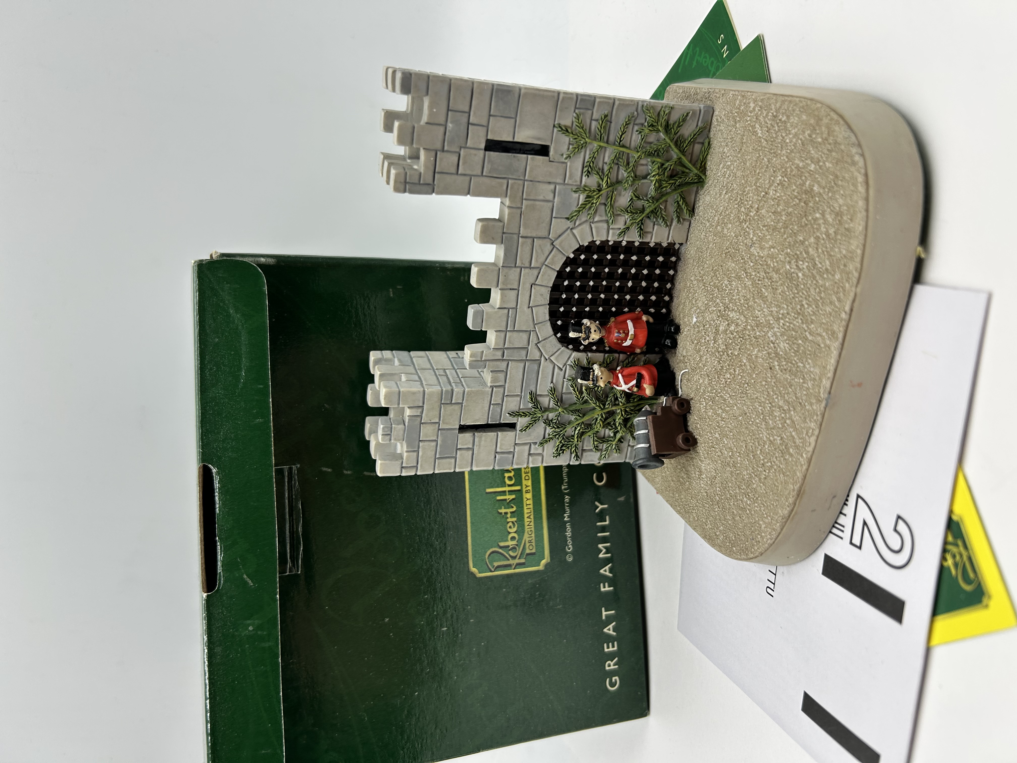 A hand-painted resin figurine titled Pippin Fort, produced by Robert Harrop Designs as part of The Camberwick Green Collection. The piece depicts the gatehouse from the British stop-motion television series Trumpton, featuring a grey stone-effect castle wall with two crenellated towers and a central portcullis. The scene includes two sentry figures dressed in red tunics and tall black headgear, positioned alongside a small cannon on a brown carriage. The base is finished with a sandy texture and includes green foliage accents. The figurine is accompanied by its original green branded box, which bears the Robert Harrop logo and copyright information for Gordon Murray (Trumps) Ltd. A circular white sticker on the box identifies the piece as Pippin Fort from The Camberwick Green Collection.