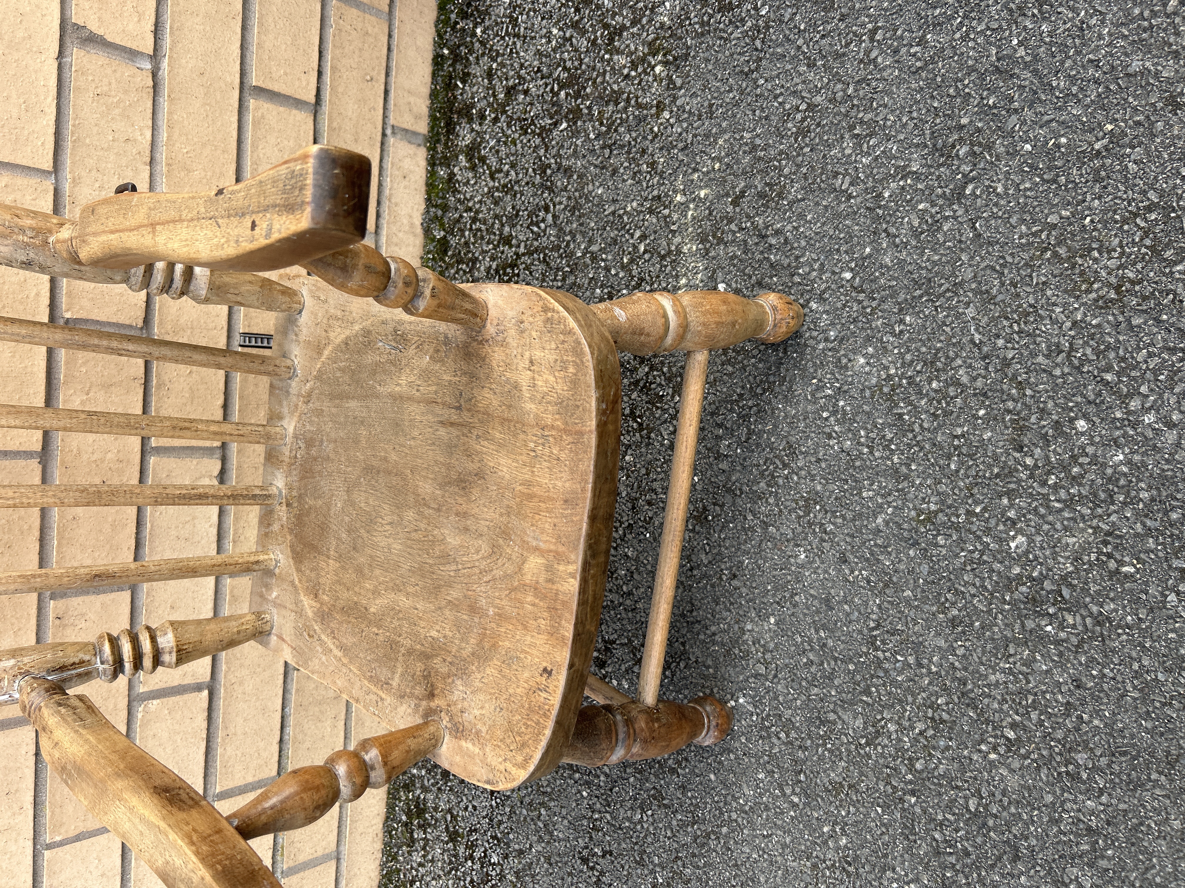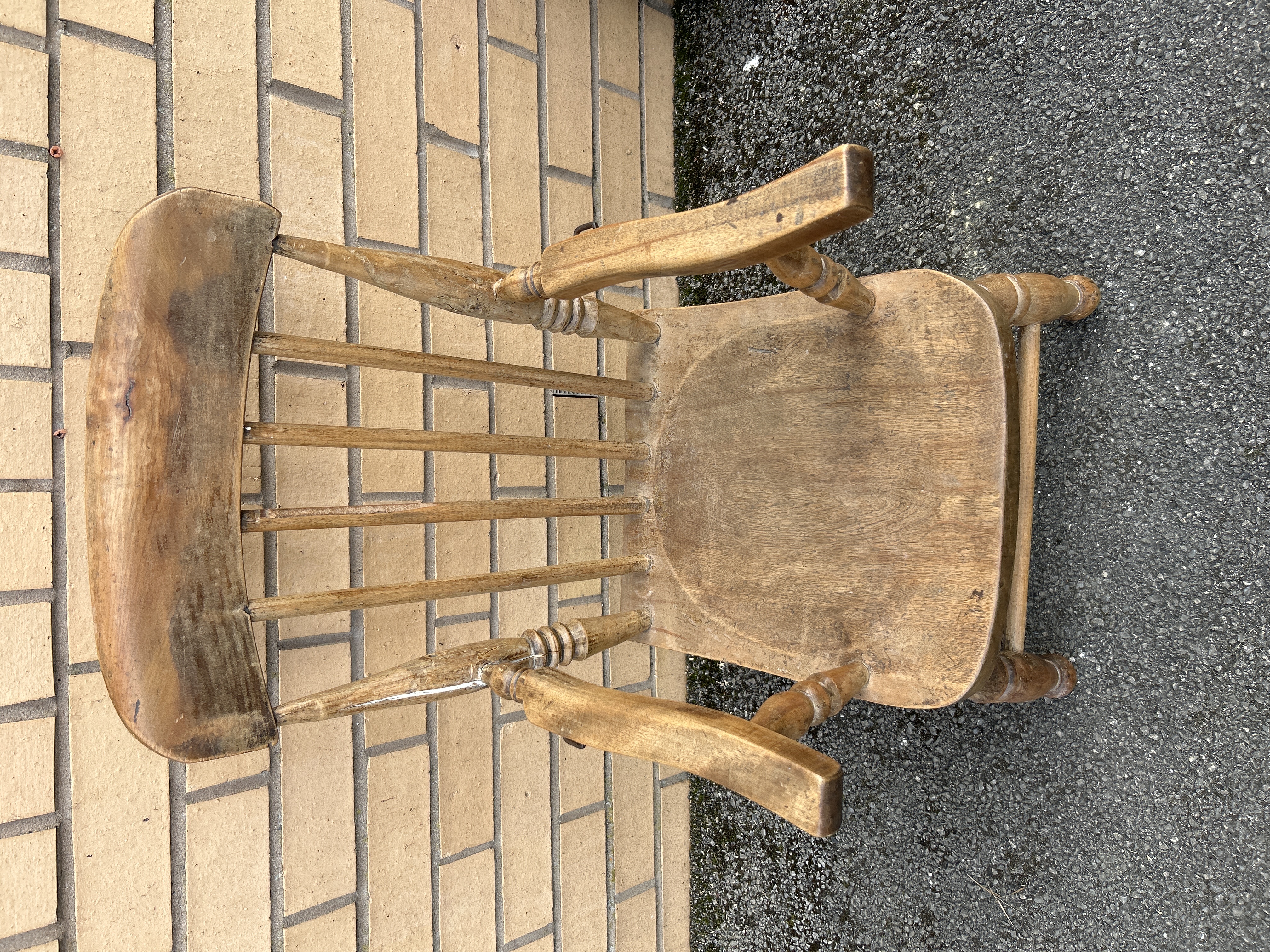 An early 20th-century Smoker’s Bow or Captain’s armchair constructed from stained beech and elm. The chair features a broad, horseshoe-shaped crest rail supported by seven turned spindles, leading to shaped arms on turned supports. It is built with a solid elm saddle seat and stands on four stout, ring-turned legs joined by a simple H-stretcher. This style is characteristic of late Victorian and Edwardian vernacular furniture. No maker’s marks, stamps, or labels are visible on the piece.