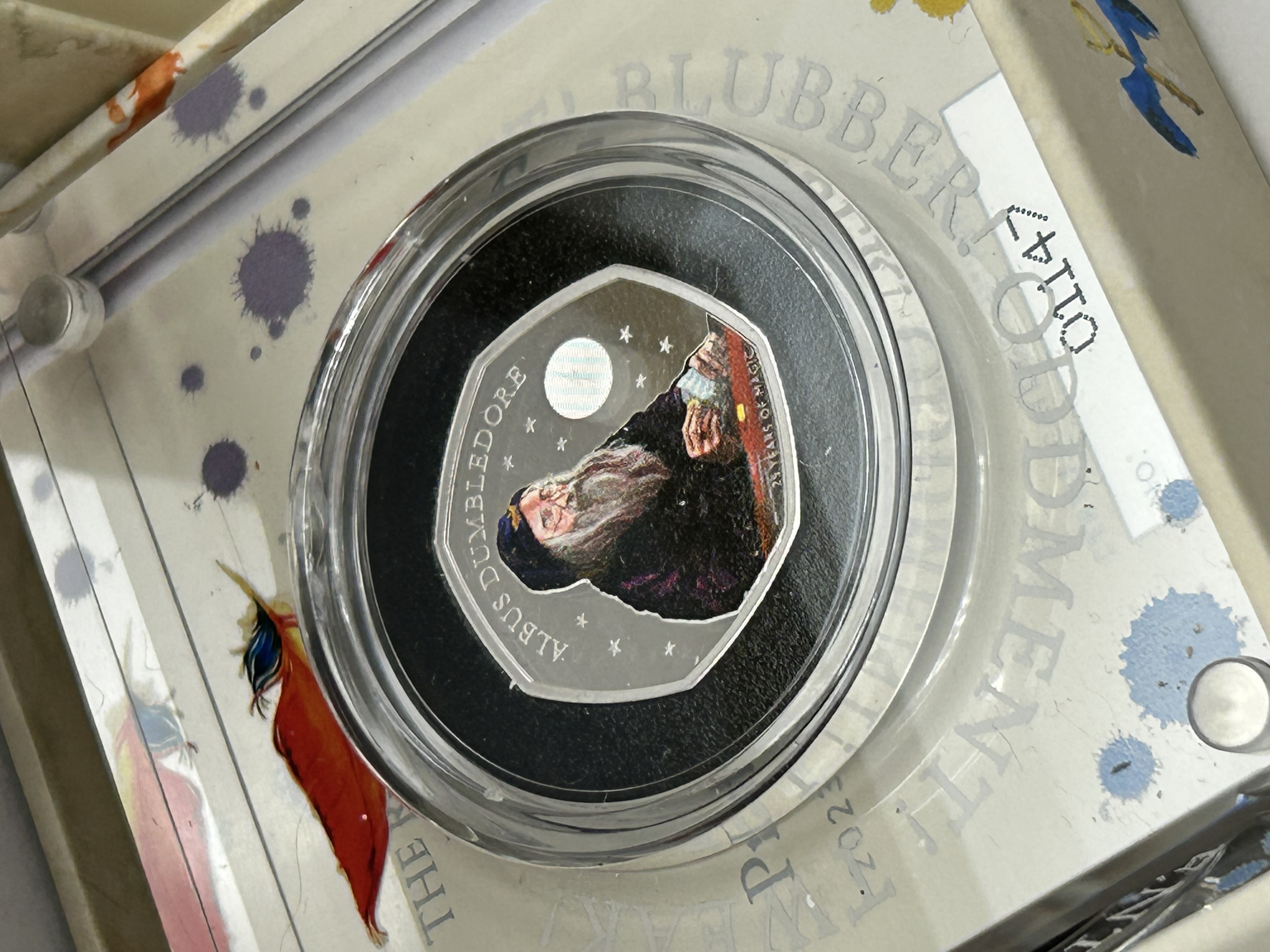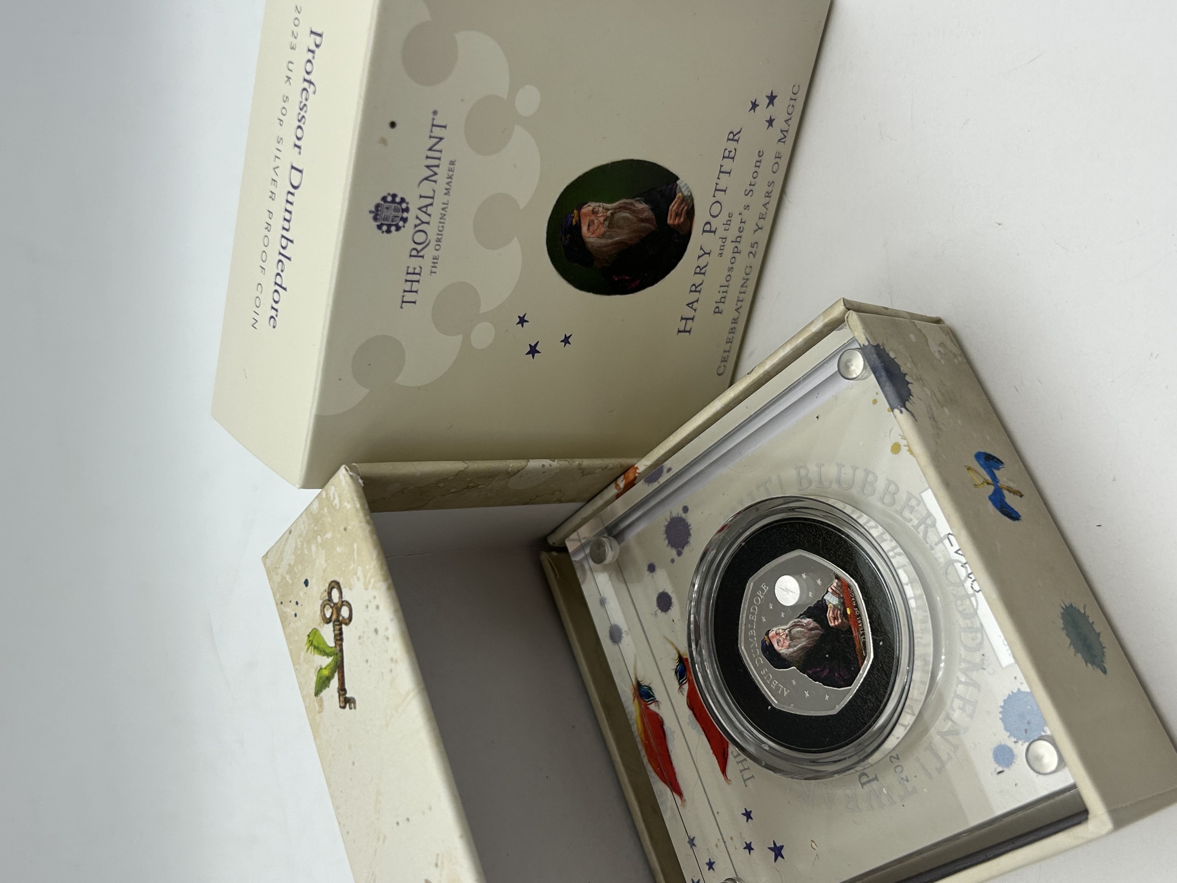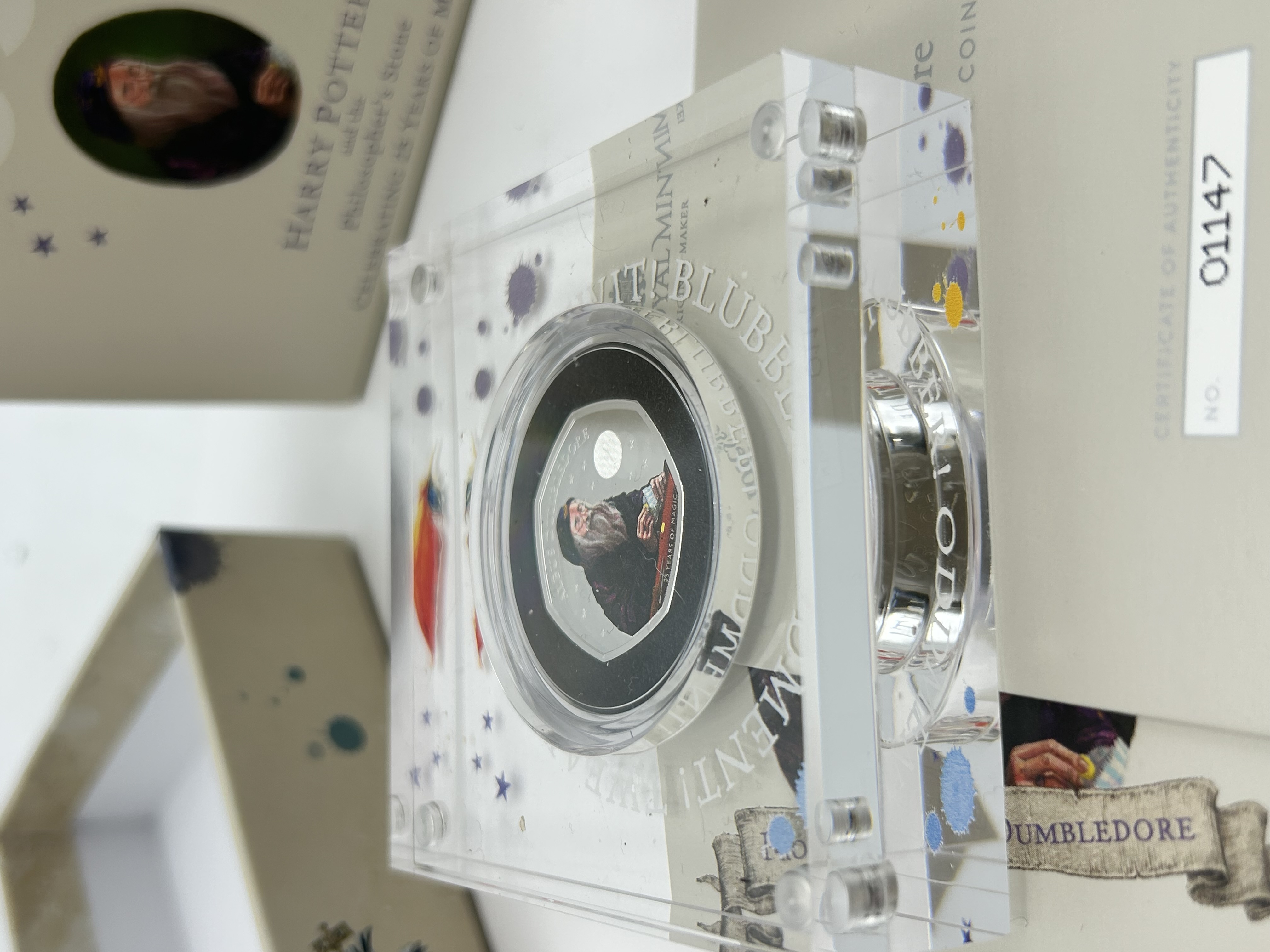 A UK 2023 Professor Dumbledore 50p silver proof coin issued by The Royal Mint. This heptagonal coin is part of the series celebrating 25 years of Harry Potter and the Philosopher’s Stone. The reverse features a colourised portrait of Professor Albus Dumbledore with the inscriptions ALBUS DUMBLEDORE and 25 YEARS OF MAGIC. A circular latent security feature alternates between a lightning bolt and the number 25. The obverse bears the official coinage portrait of King Charles III. Struck in silver with a proof finish and a plain edge. The item is housed in its original Royal Mint acrylic display block and illustrated outer box, accompanied by Certificate of Authenticity number 01147. This series represents the first time characters from the Harry Potter stories have appeared on official UK coinage.