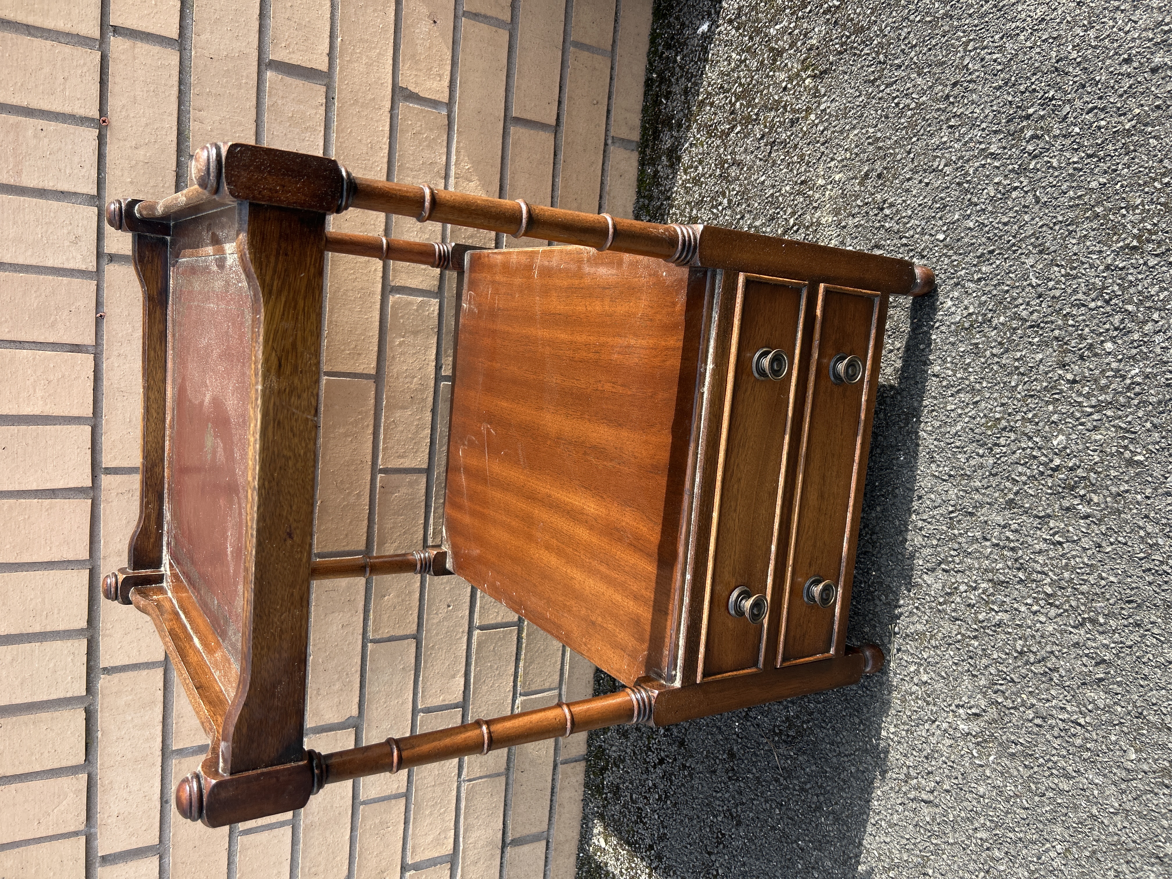 A Regency style side table of 20th-century manufacture, constructed from stained hardwood with a mahogany finish. The rectangular top features an inset leather surface with gold-tooled borders, set within a raised gallery rail. The table is designed with an open mid-tier supported by four faux-bamboo turned uprights. The base section contains two short drawers, each fitted with two circular metal ring pulls. The piece is supported by four legs terminating in small bun feet. No maker’s marks or labels are visible on the exterior or base.