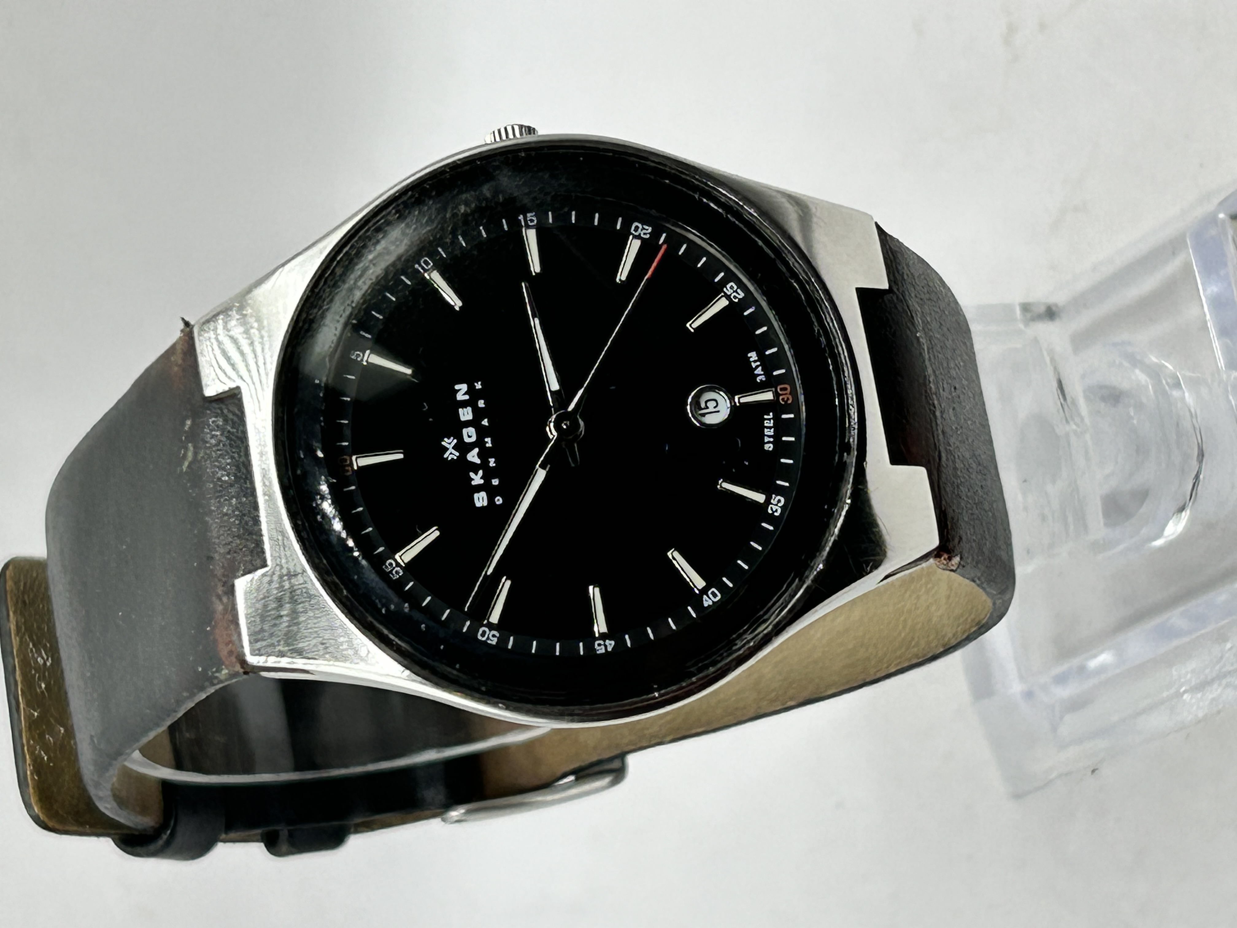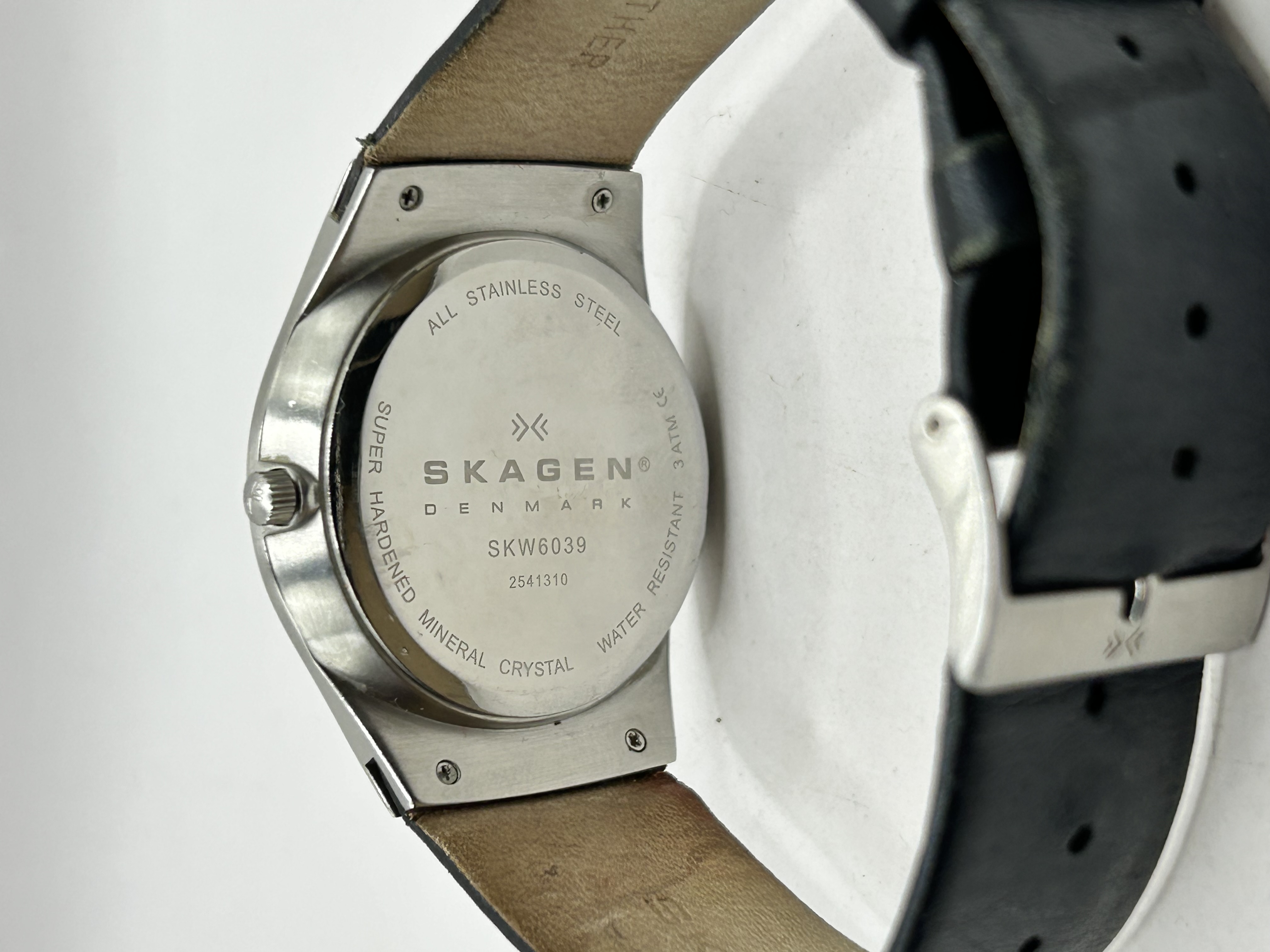 A Skagen Denmark Melbye quartz wristwatch, reference SKW6039. The timepiece features a circular stainless steel case housing a black dial with silver-tone baton hour markers and a date aperture at the 6 o’clock position. The dial includes a white printed outer minute track and a secondary inner track with numerical markers. The dial is marked with the double chevron logo above SKAGEN DENMARK, and STEEL 3ATM at the bottom. The case back is inscribed ALL STAINLESS STEEL, SKAGEN DENMARK, SKW6039, 2541310, SUPER HARDENED MINERAL CRYSTAL, and WATER RESISTANT 3 ATM CE. The watch is presented on an integrated black leather strap with a stainless steel pin buckle bearing the double chevron logo.