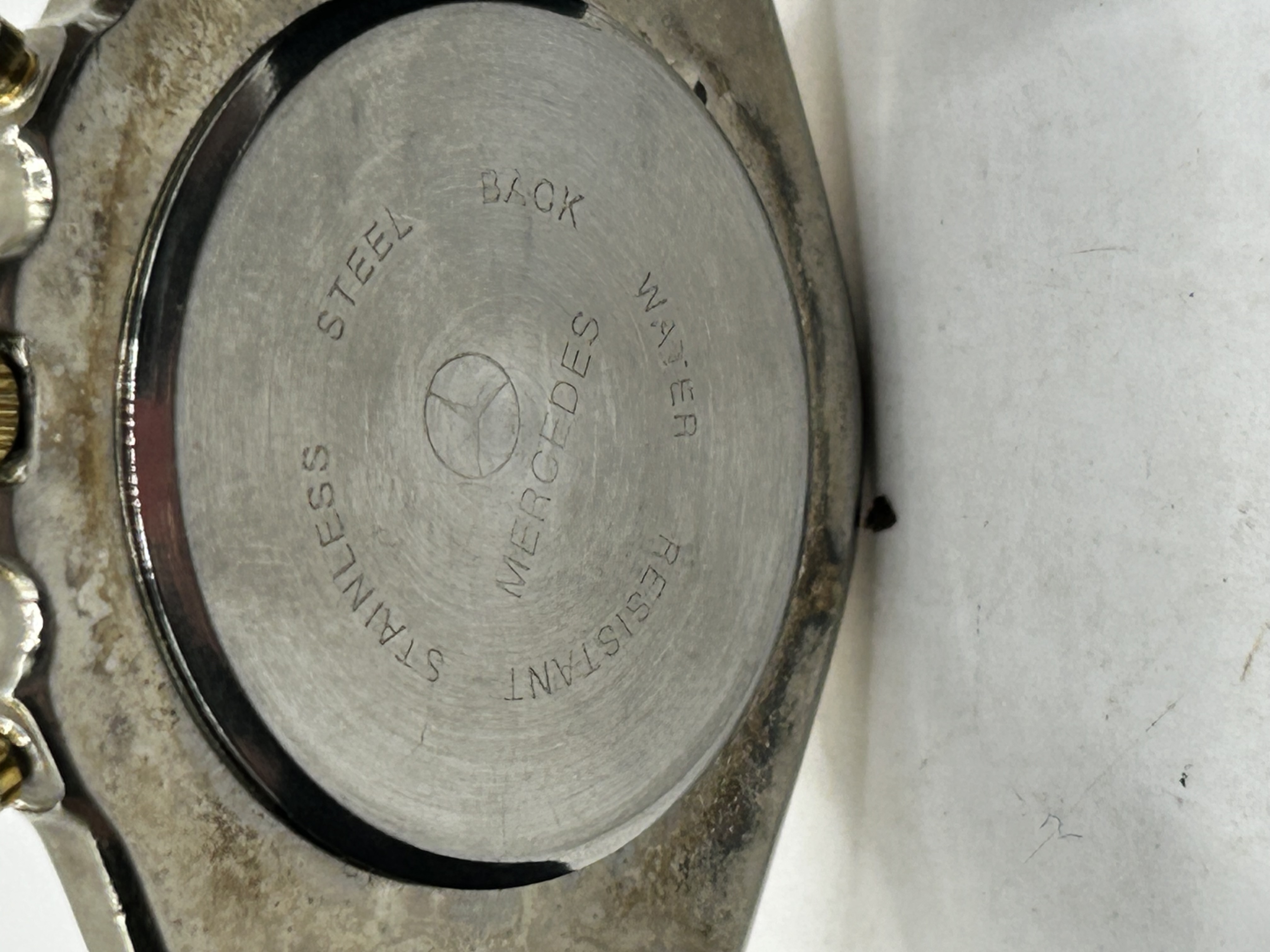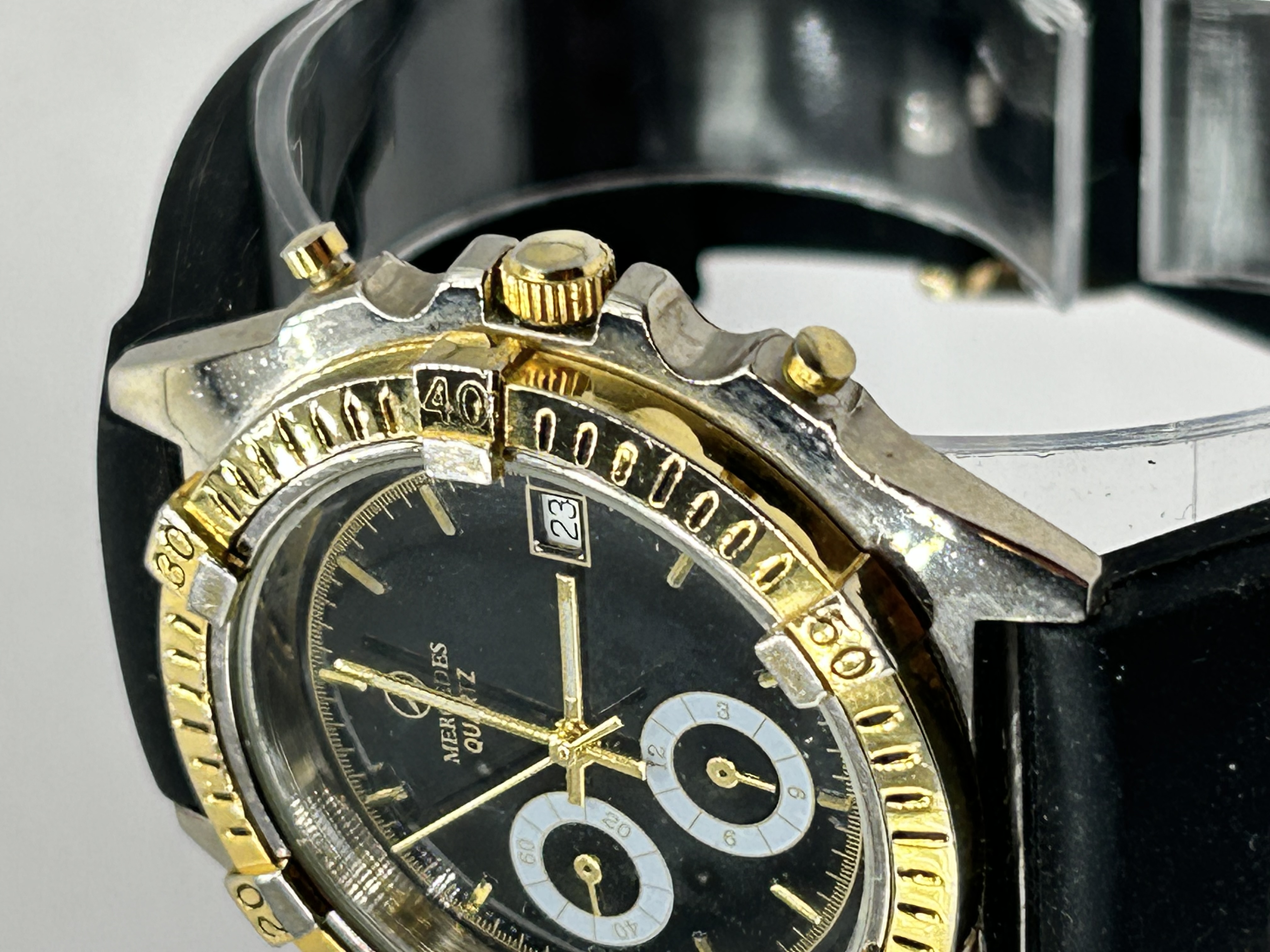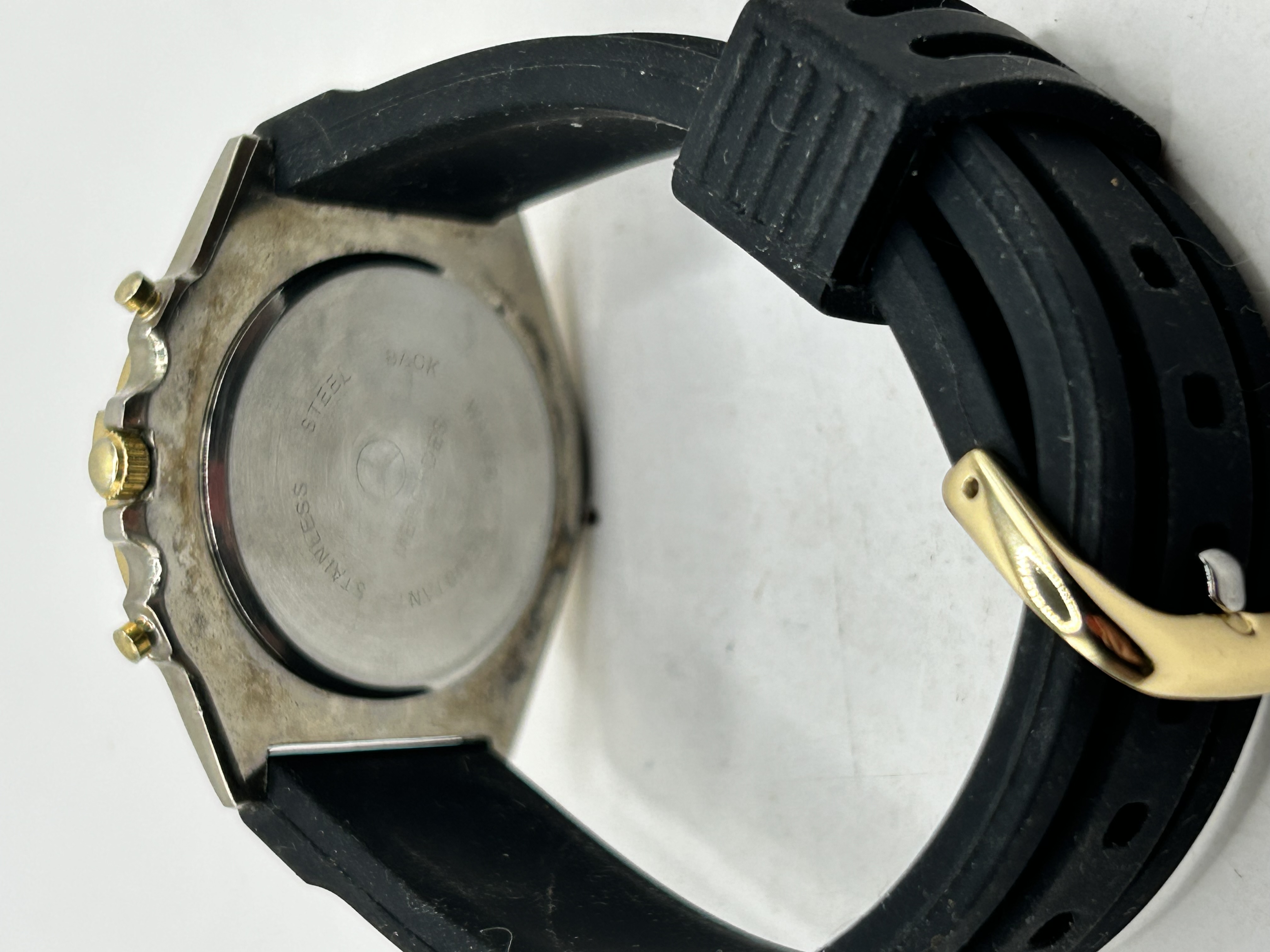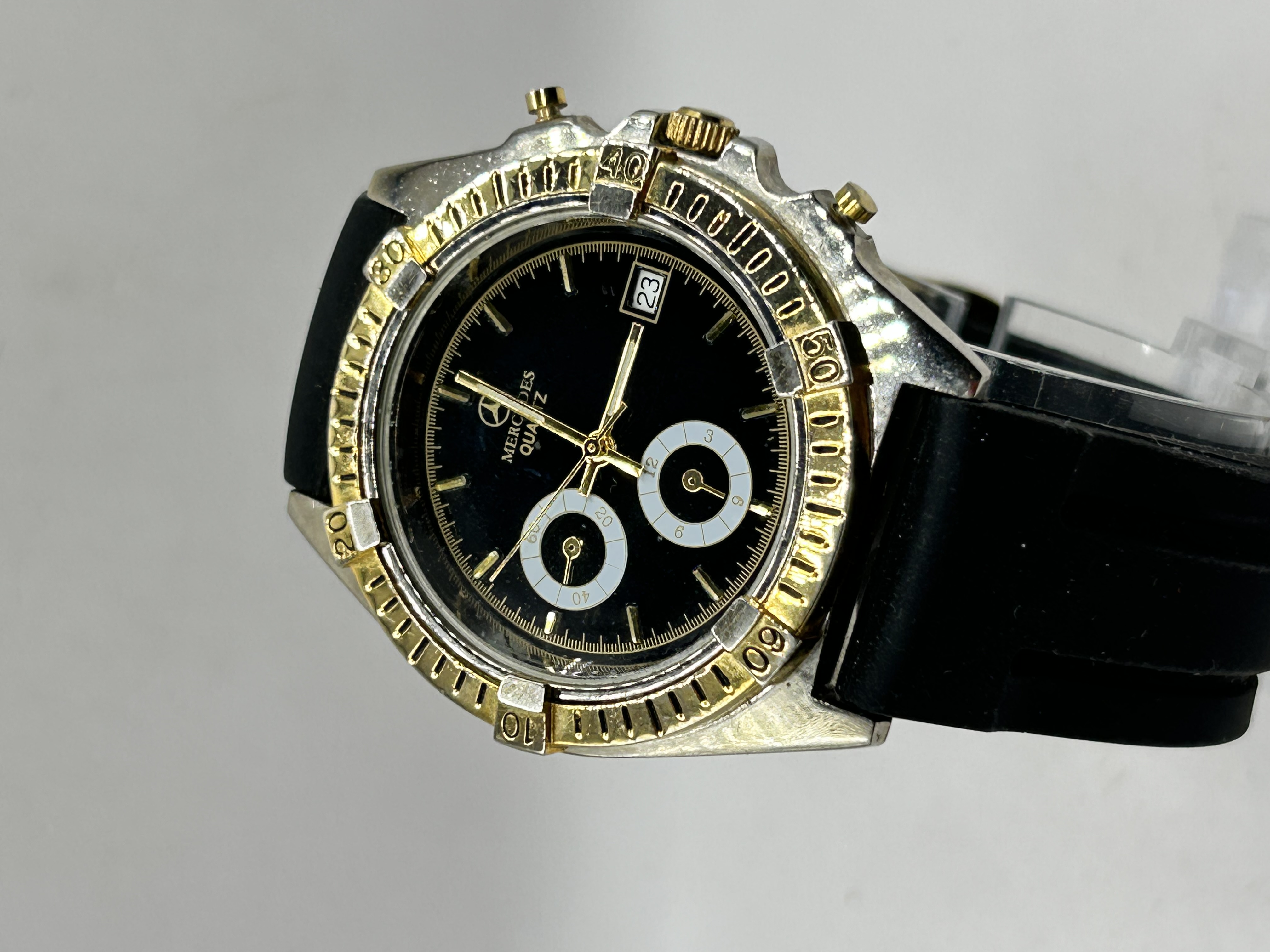 A Mercedes-Benz branded quartz wristwatch featuring a chronograph style layout. The watch features a black dial with two white sub-dials and a date aperture at the 3 o’clock position. The dial is marked with the Mercedes three-pointed star logo and the text Mercedes Quartz. The case is constructed from base metal with a gold-toned rotating bezel featuring raised rider tabs at the ten-minute intervals. The case back is stainless steel and is inscribed with the Mercedes logo, Mercedes, Stainless Steel Back, and Water Resistant. The watch is fitted with a black rubber strap and a gold-toned pin buckle.