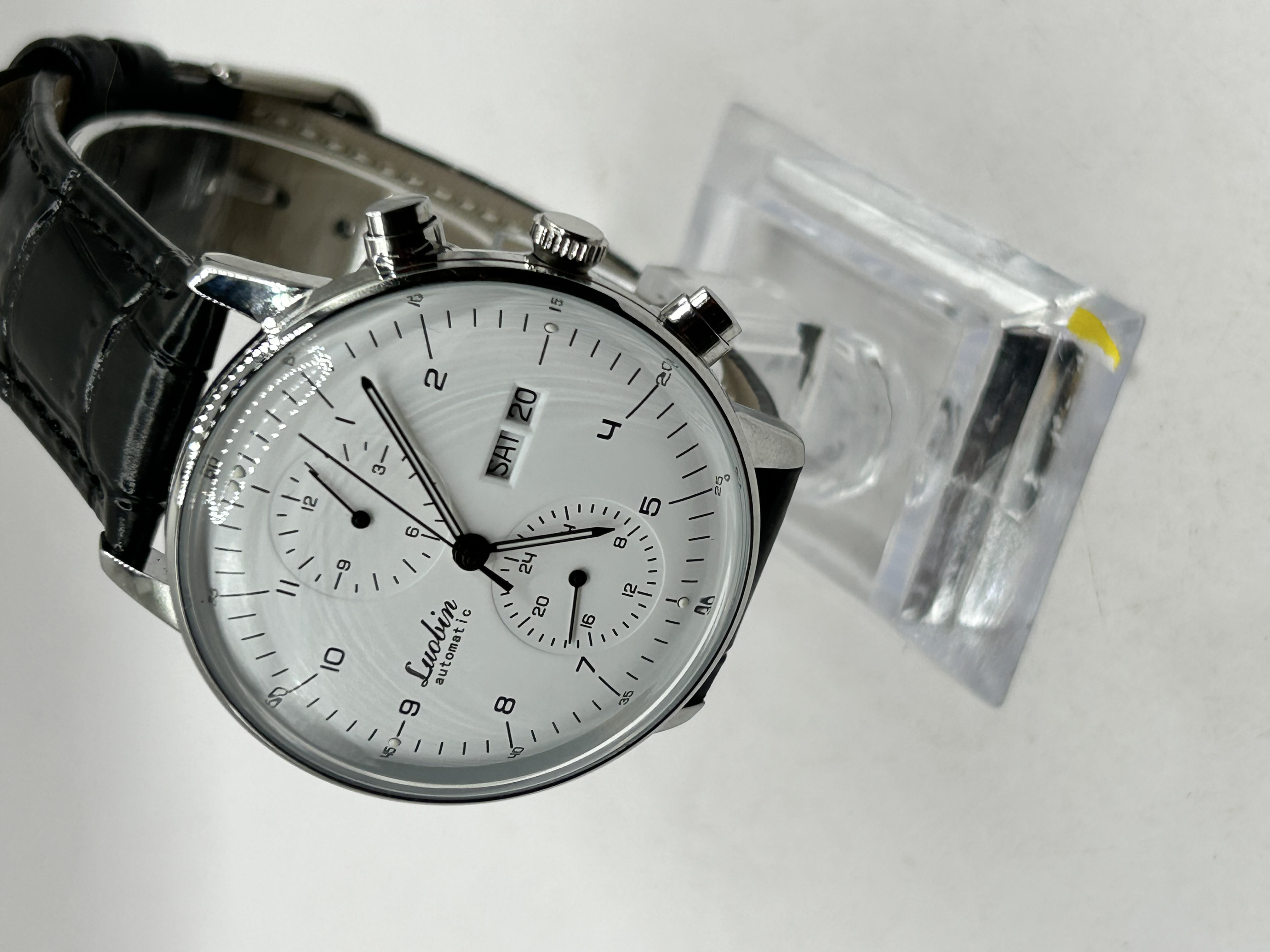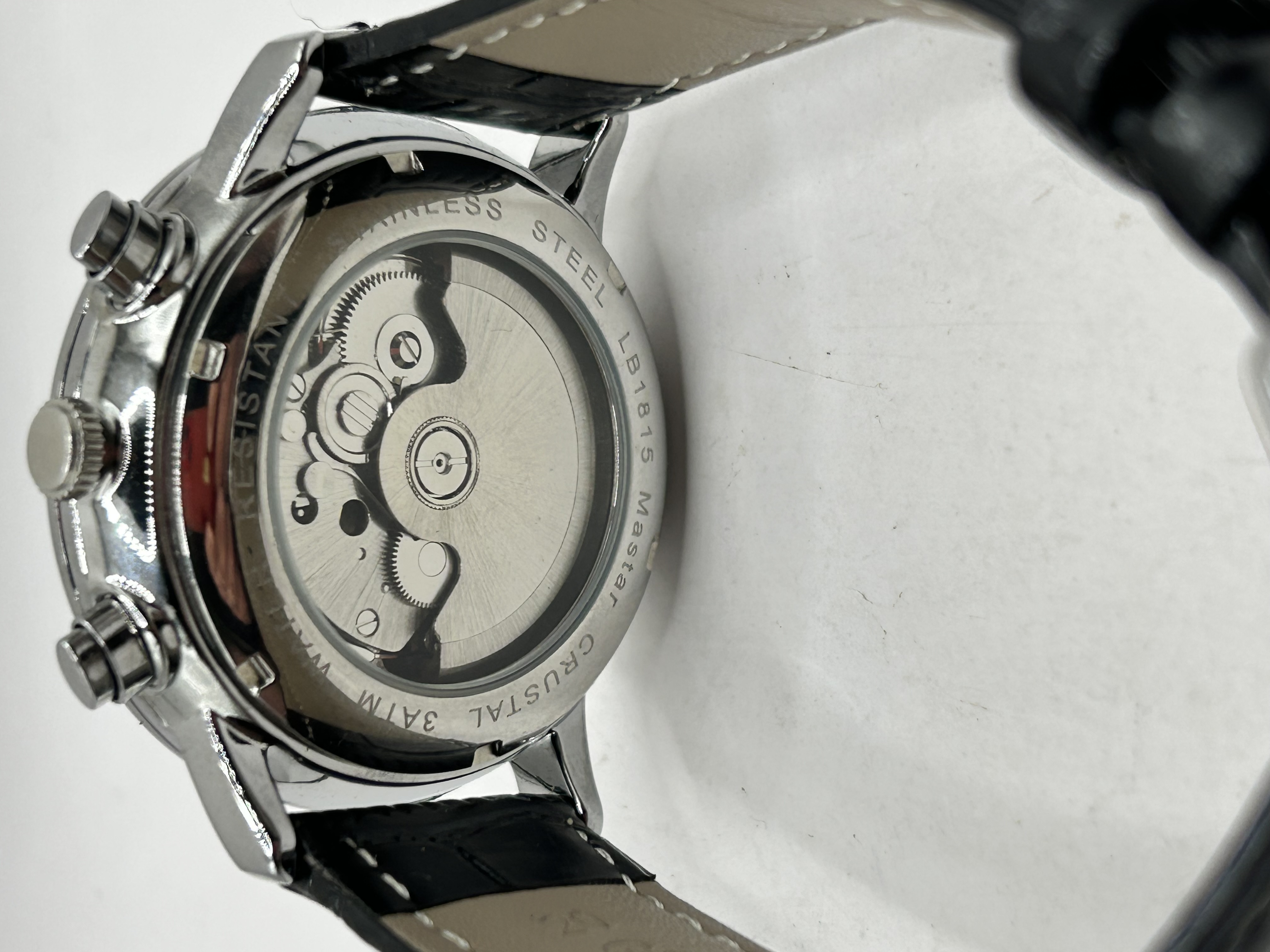A Luobin Mastar automatic mechanical wristwatch, reference LB1815. The watch features a stainless steel case with a textured white dial. The dial is configured with Arabic numeral hour markers, a day-date aperture at the 3 o’clock position, and two sub-dials providing 24-hour and 12-hour indications. It is fitted with an automatic mechanical movement which is visible through an exhibition case back. The watch is presented on a black leather strap with a crocodile-embossed pattern and a silver-tone pin buckle. The dial is marked Luobin automatic. The case back is inscribed STAINLESS STEEL, LB1815, Mastar, CRUSTAL, and 3ATM RESISTANT. Note the spelling of crystal as CRUSTAL on the case back.
