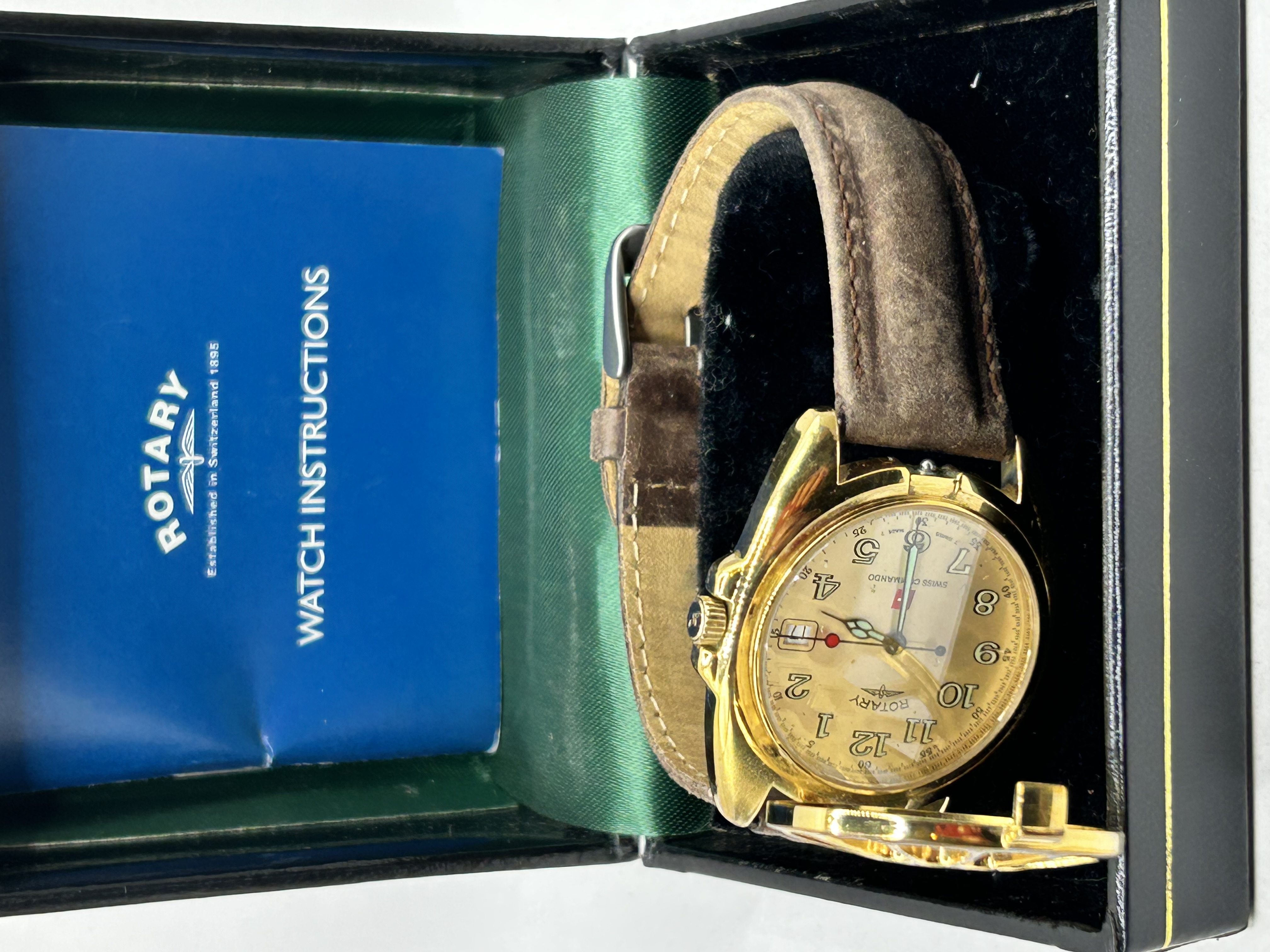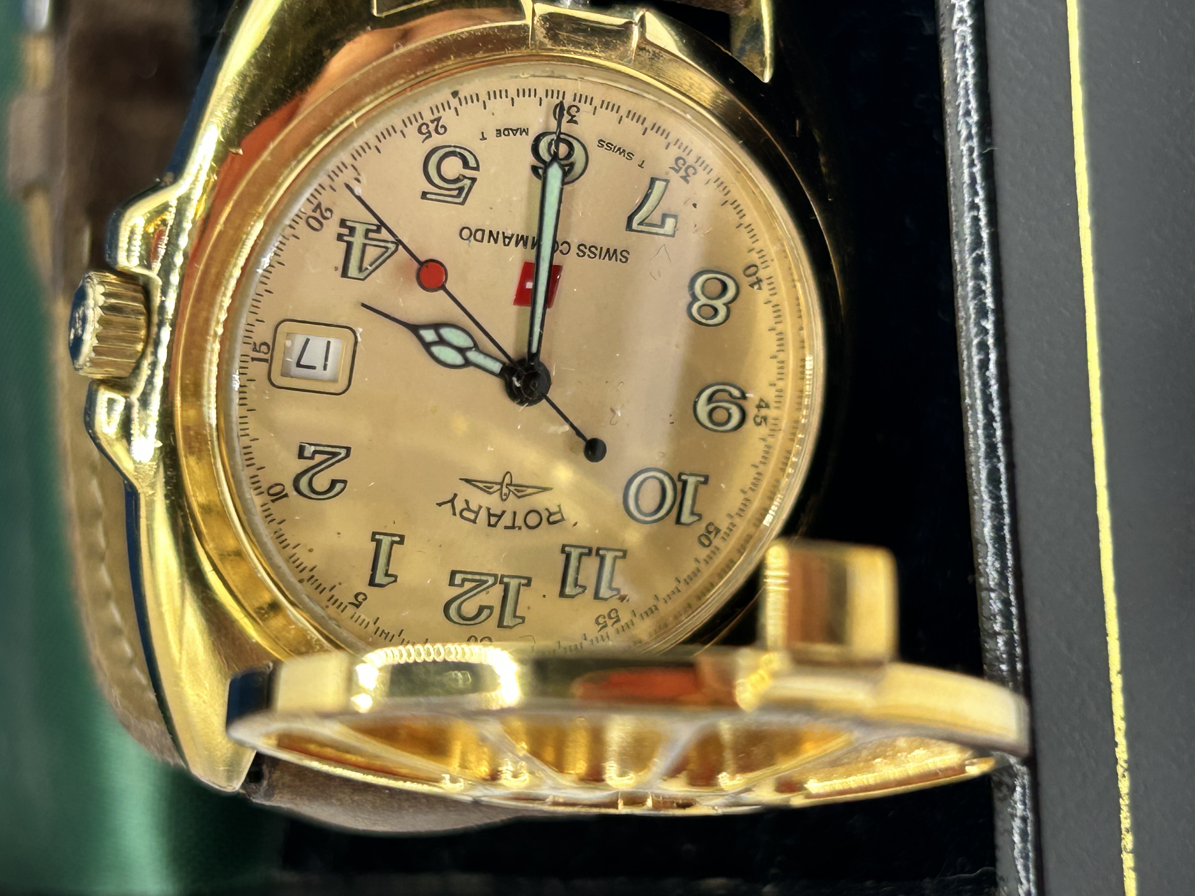 A Rotary Swiss Commando wristwatch featuring a gold-tone case and a distinctive hinged, skeletonised protective cover over the crystal. The champagne dial is set with Arabic numeral hour markers, a date aperture at the 3 o’clock position, and luminous hands with a red-tipped sweep second hand. The dial is signed with the Rotary winged logo and Swiss Commando, with T SWISS MADE T at the bottom edge. The winding crown also bears the Rotary logo. The watch is fitted with a brown leather strap and a pin buckle. Accompanied by the original Rotary presentation box and a watch instructions booklet.