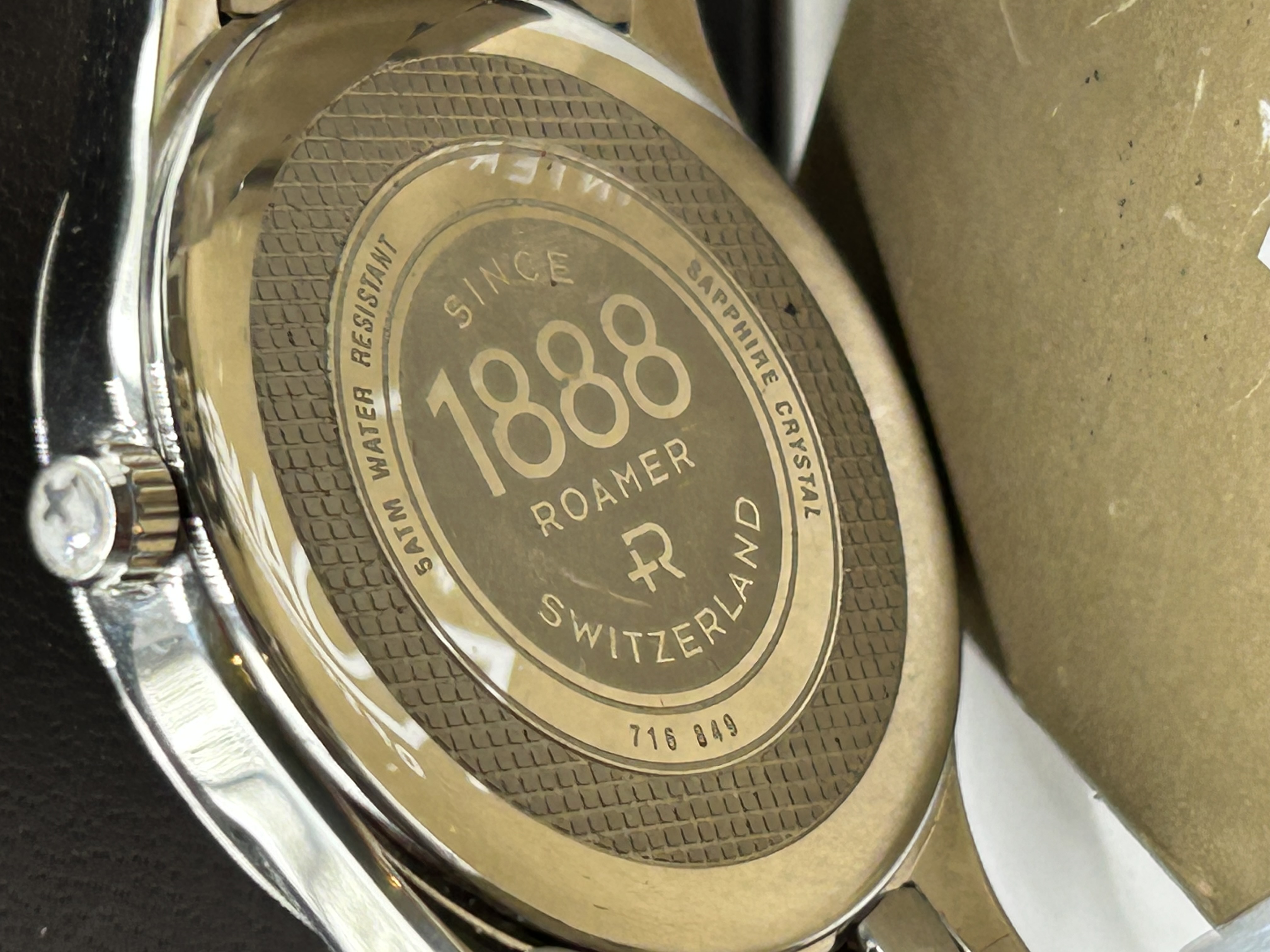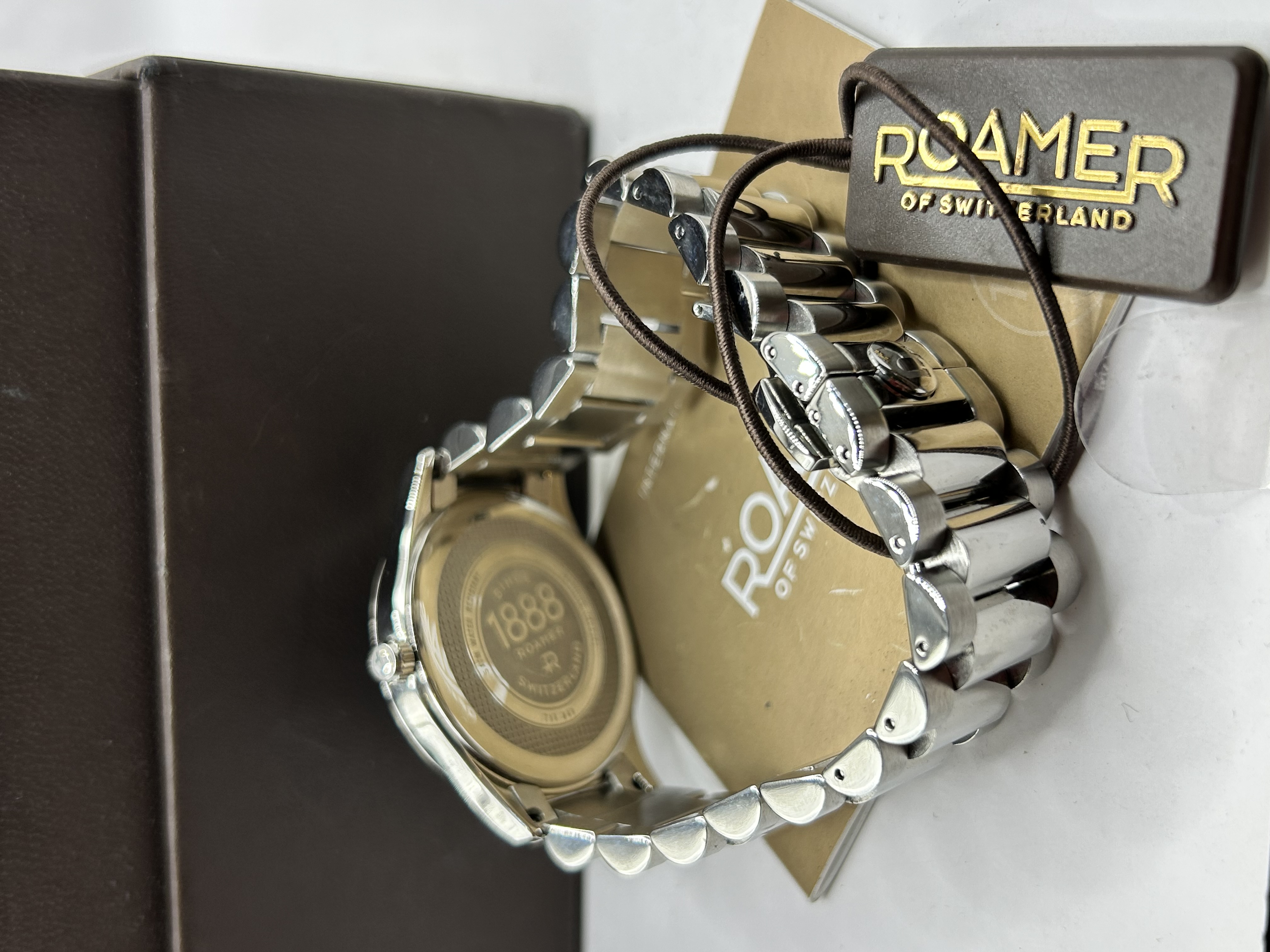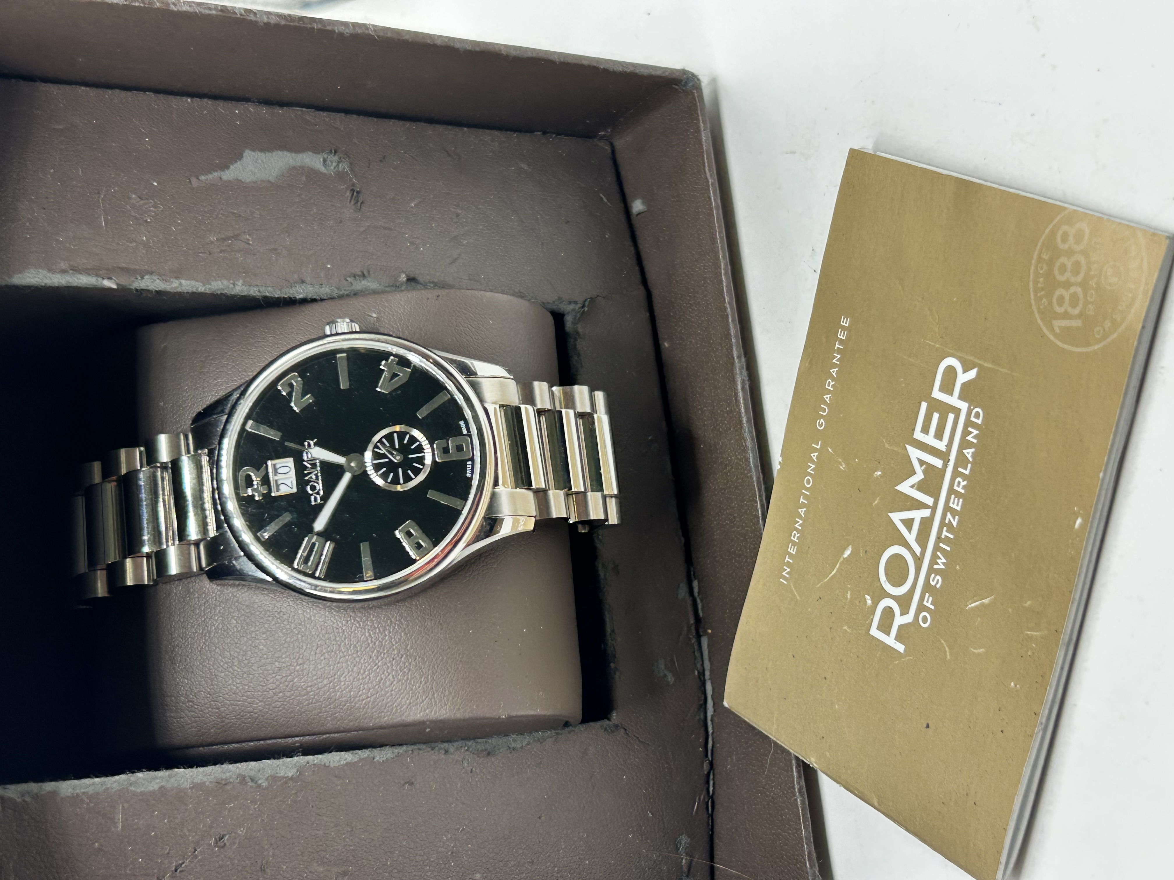 A contemporary Swiss-made stainless steel wristwatch by Roamer, reference number 716 849. The watch features a circular stainless steel case with a black dial, silver-tone baton hour markers, and Arabic numerals at the even positions. The dial is configured with a big date double-aperture at the 12 o’clock position and a small seconds sub-dial at the 6 o’clock position. It is fitted with a sapphire crystal and an integrated-style three-link stainless steel bracelet with a deployment clasp. The dial is signed ROAMER and SWISS MADE. The case back is inscribed with 5ATM WATER RESISTANT, SINCE 1888, ROAMER, SWITZERLAND, SAPPHIRE CRYSTAL, and the reference number 716 849. The crown is embossed with the brand logo. This lot is accompanied by the original presentation box, an International Guarantee booklet, and a branded hang tag.