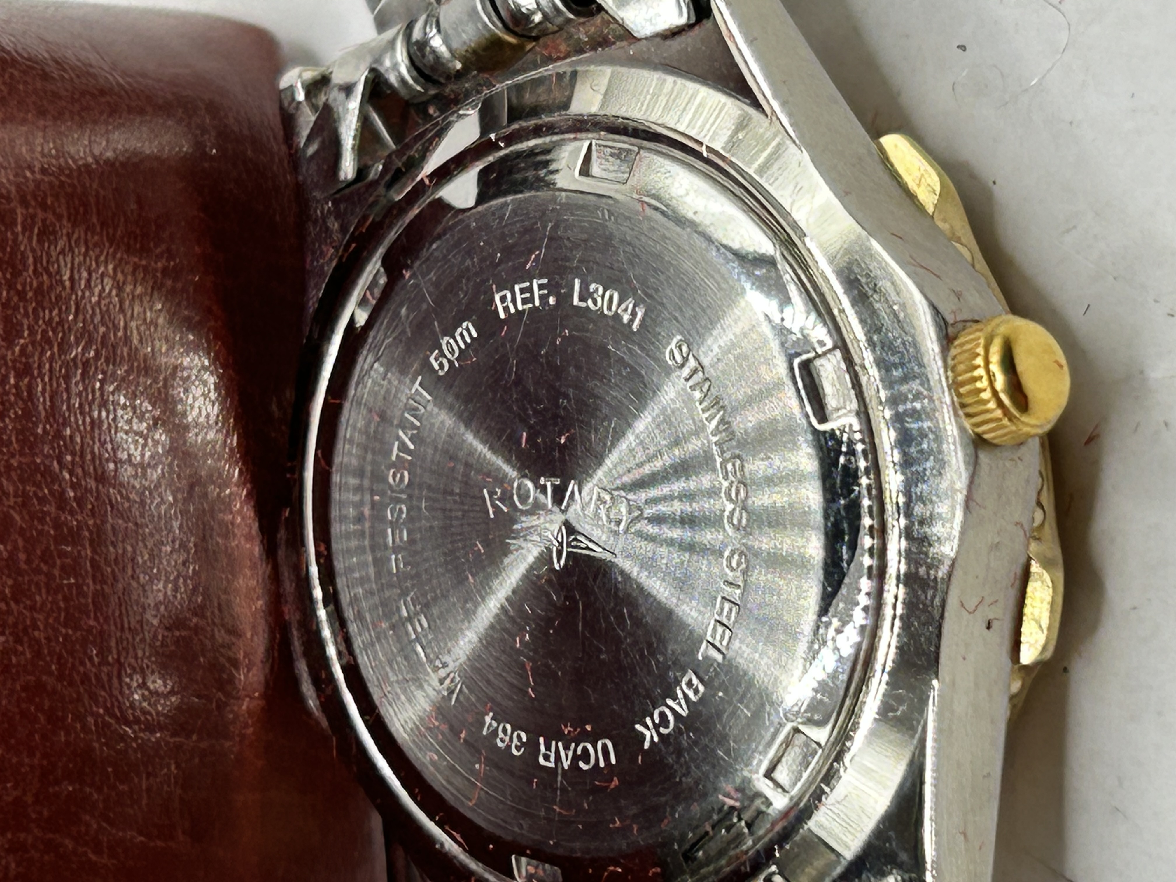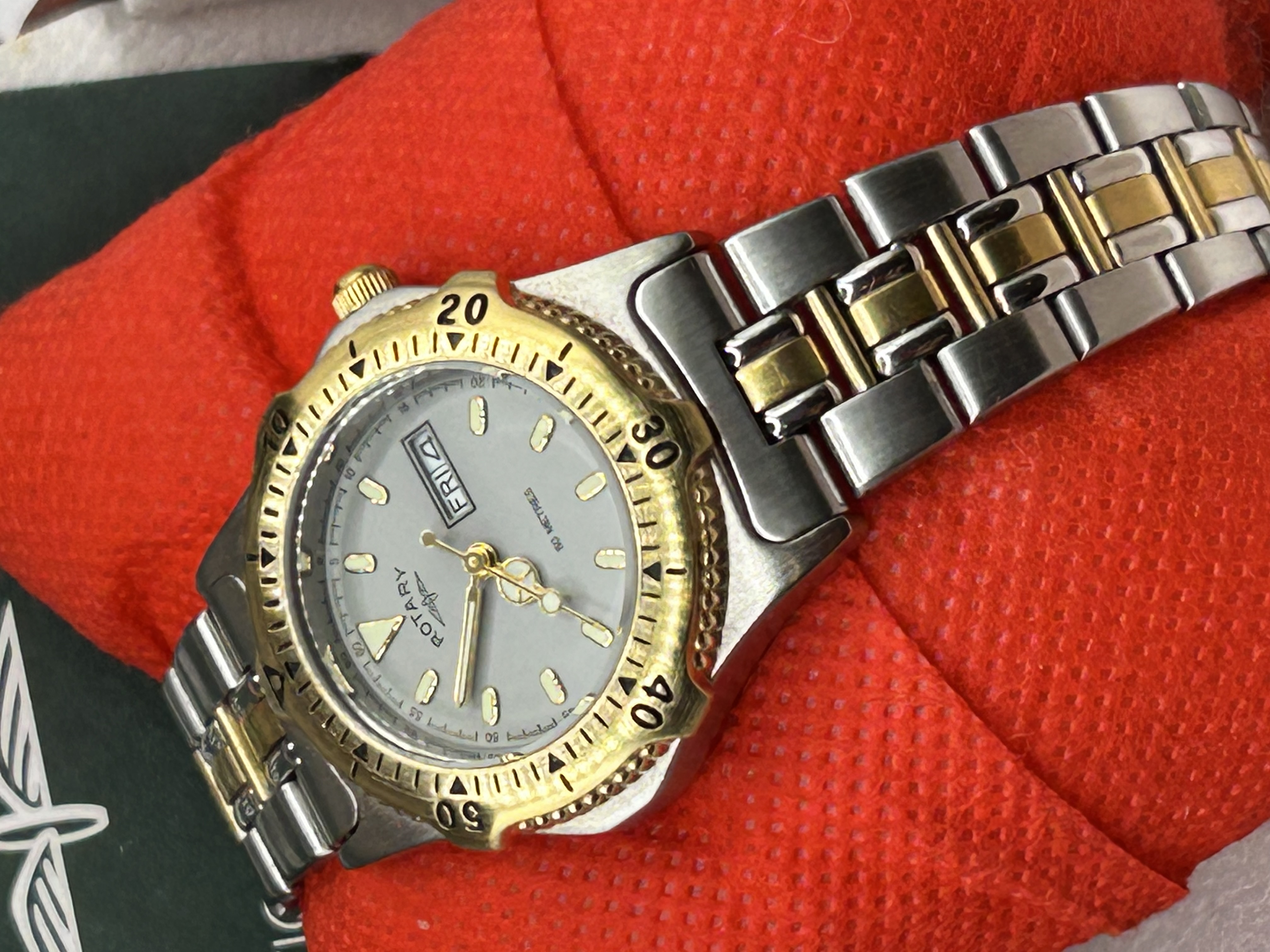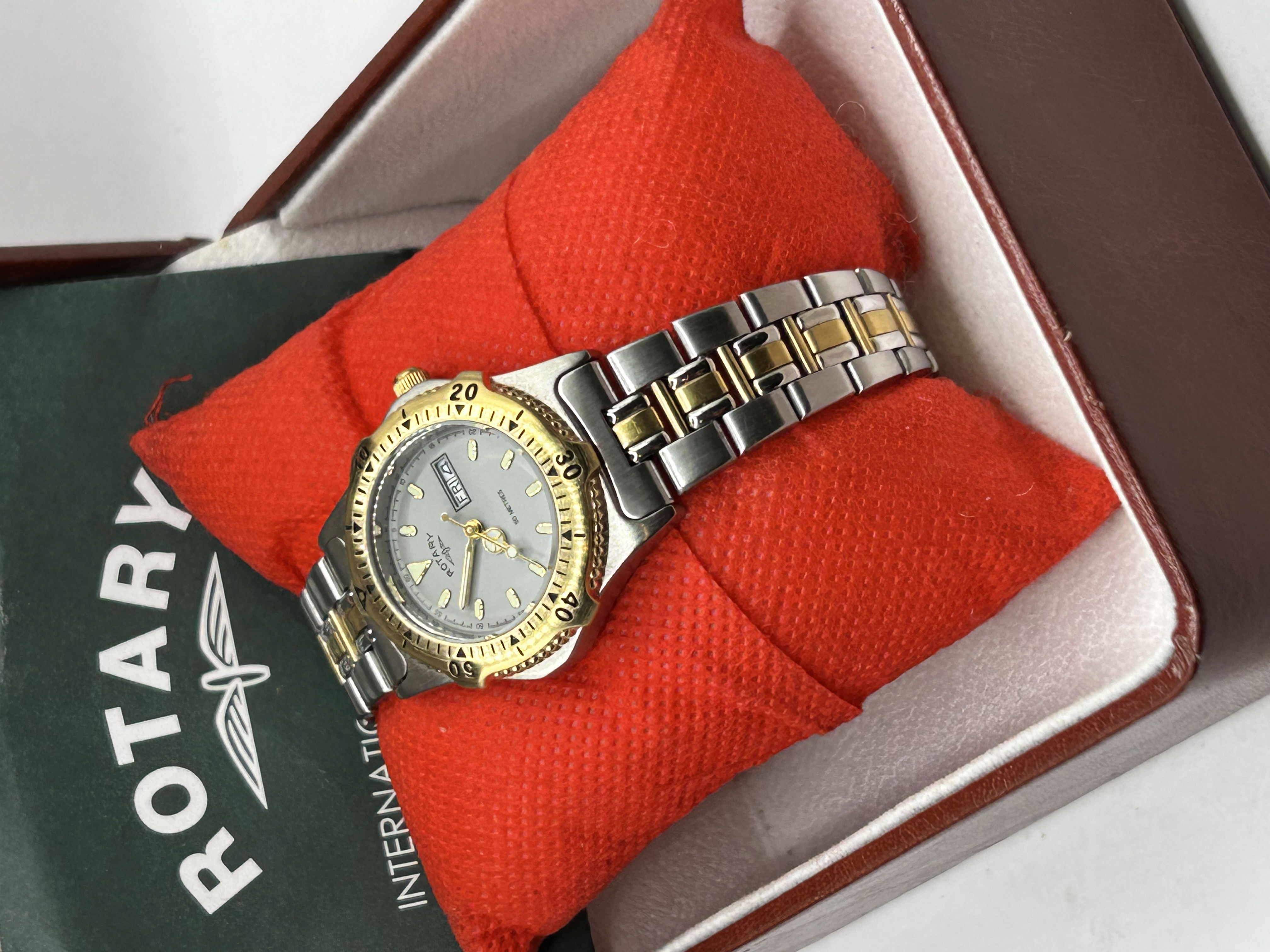 A Rotary ladies diver style wristwatch, reference L3041. The timepiece features a bi-colour stainless steel case with a gold tone rotating bezel and crown. The silvered dial is detailed with applied luminous hour markers and a day-date aperture at the 3 o’clock position. The watch is powered by a quartz movement, indicated by the UCAR 364 battery reference on the case back. It is presented on an integrated bi-colour stainless steel and gold plated link bracelet with a folding clasp. The case back is marked Rotary, Ref. L3041, Stainless Steel Back, UCAR 364, Water Resistant 50m. This lot includes a Rotary presentation box and international guarantee booklet.