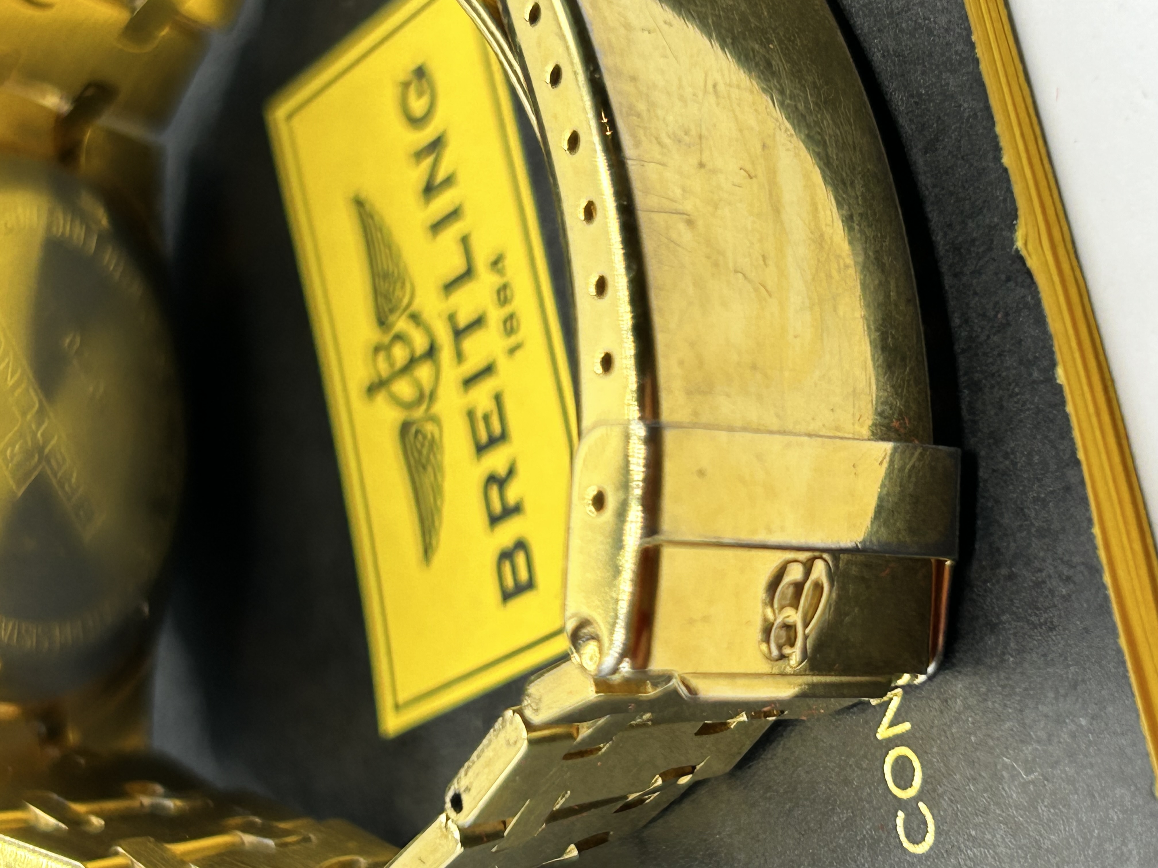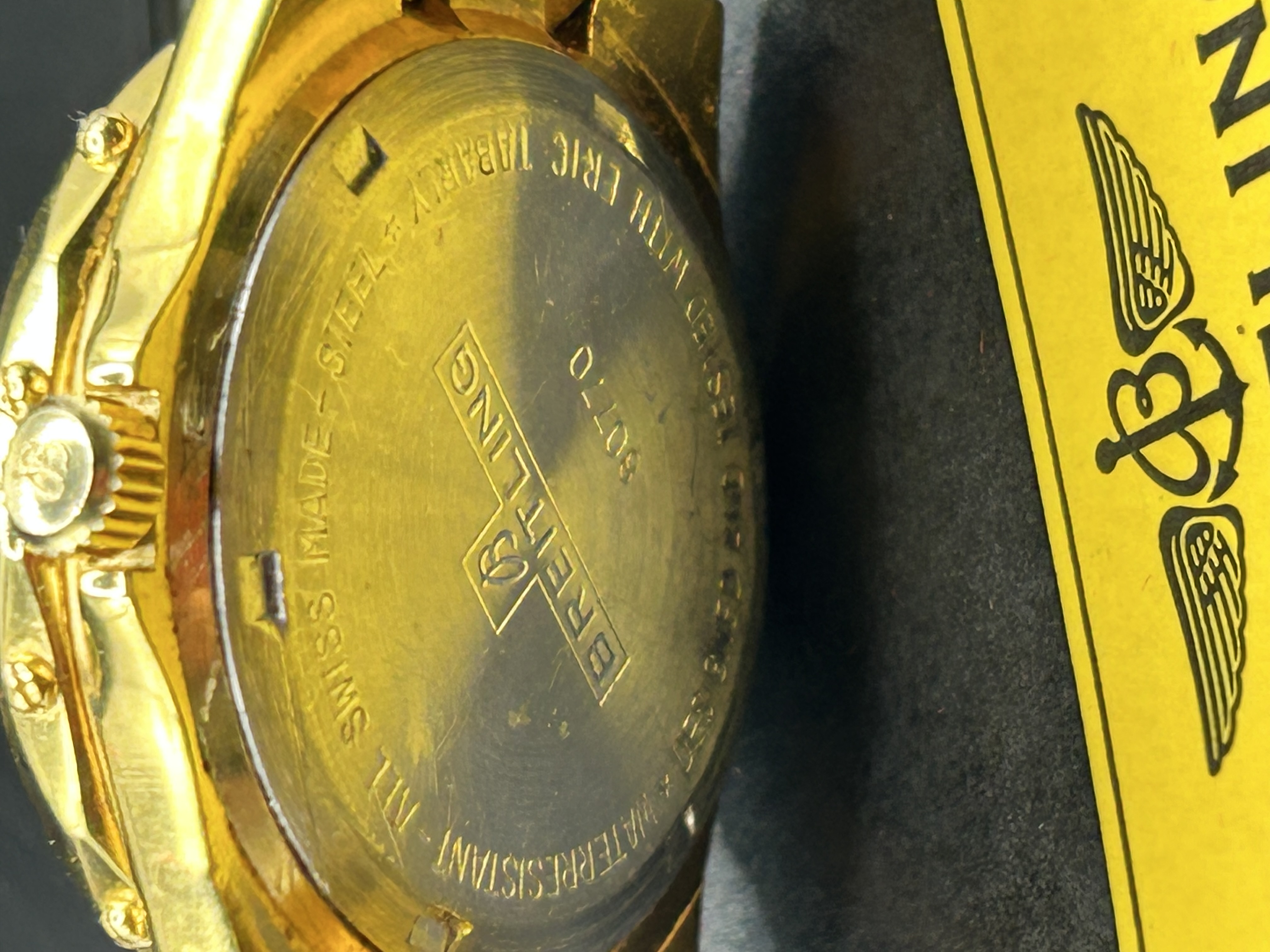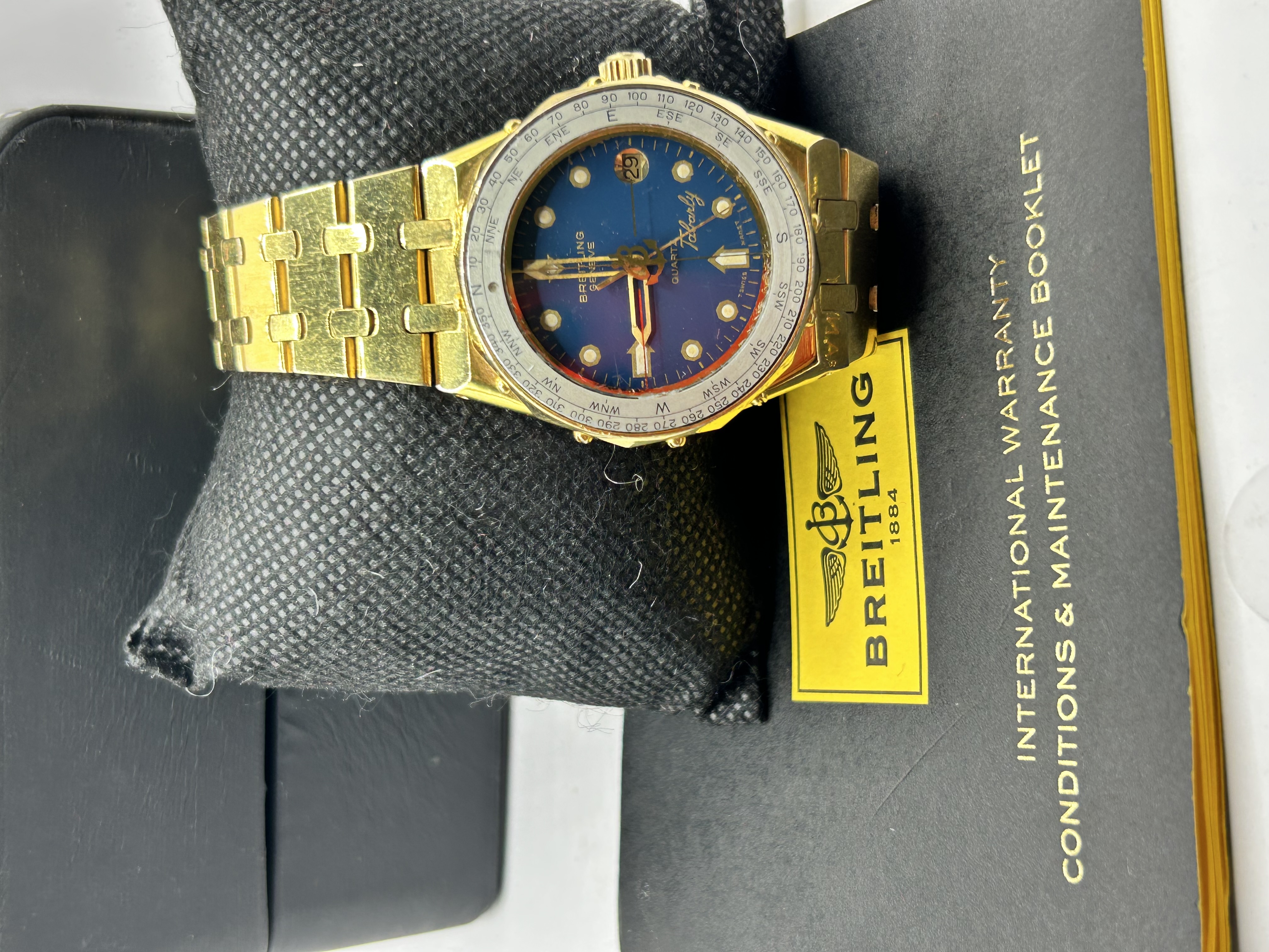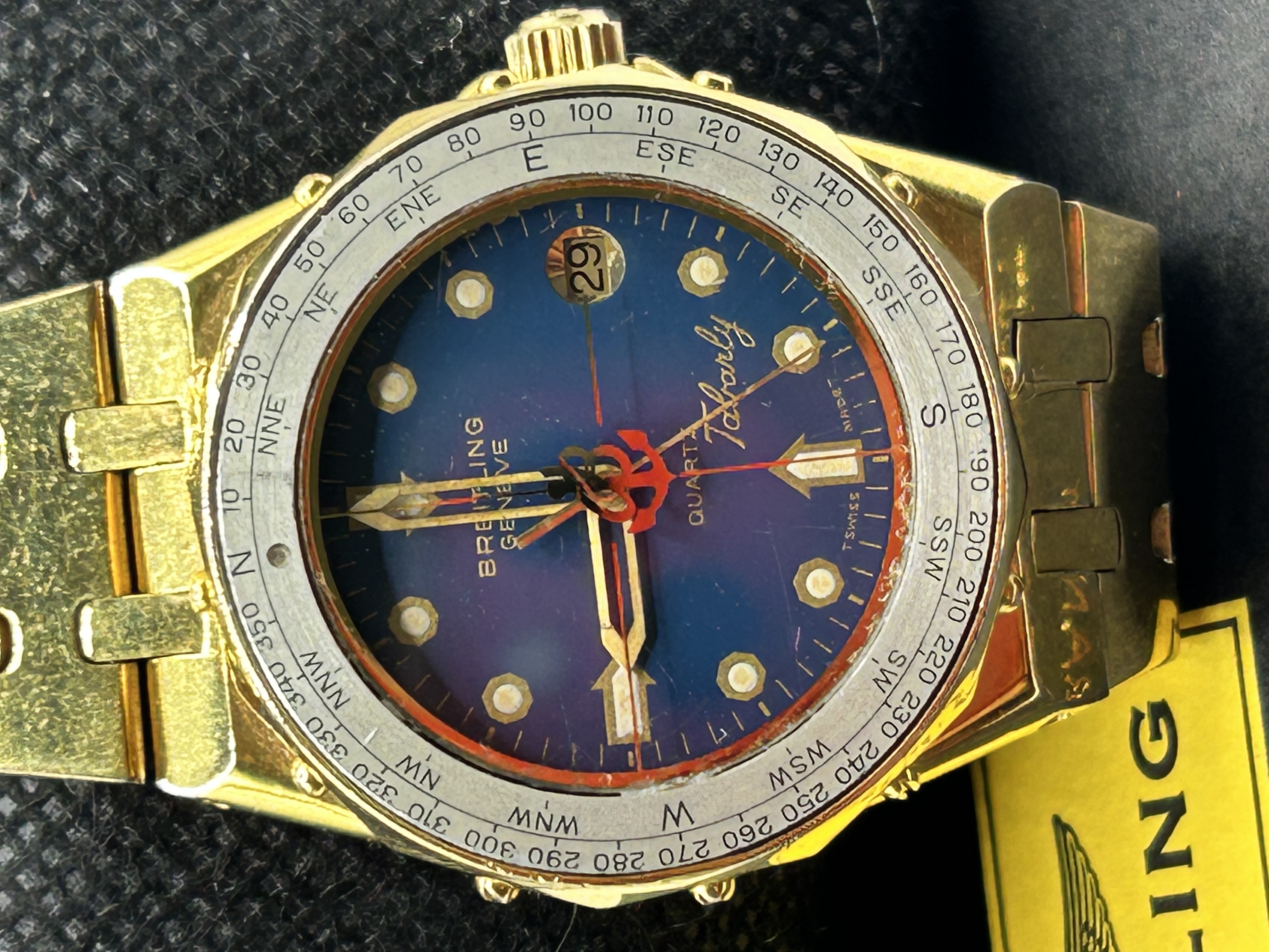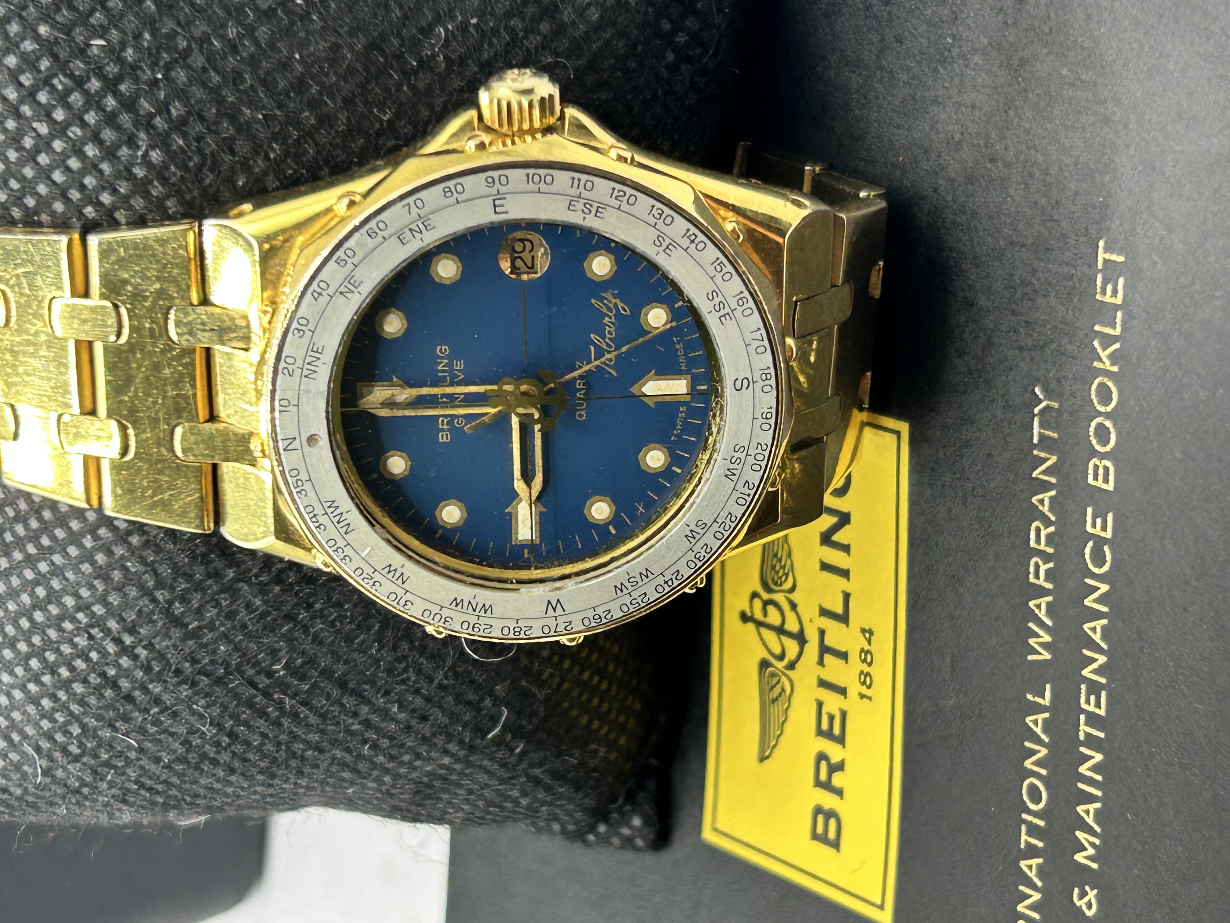 A Breitling Tabarly quartz wristwatch, reference number 80770. This model was designed in collaboration with the yachtsman Éric Tabarly. The timepiece features a gold-plated stainless steel case with a blue dial. The dial is inscribed Breitling Geneve at the nine o’clock position and Tabarly in script on the right side. It is set with gold-tone luminescent hour markers, a date aperture at the three o’clock position, and a red anchor-tipped seconds hand. The dial is further marked Quartz and T Swiss Made T. The watch is fitted with a rotating compass bezel marked with degrees and cardinal directions. It is presented on an integrated gold-plated bracelet with a folding clasp bearing the Breitling logo. The stainless steel case back is engraved with the reference number 80770 and the text Waterresistant – All Swiss Made – Steel – Designed and Tested with Eric Tabarly. The lot includes a Breitling International Warranty Conditions and Maintenance booklet and a yellow Breitling hangtag.