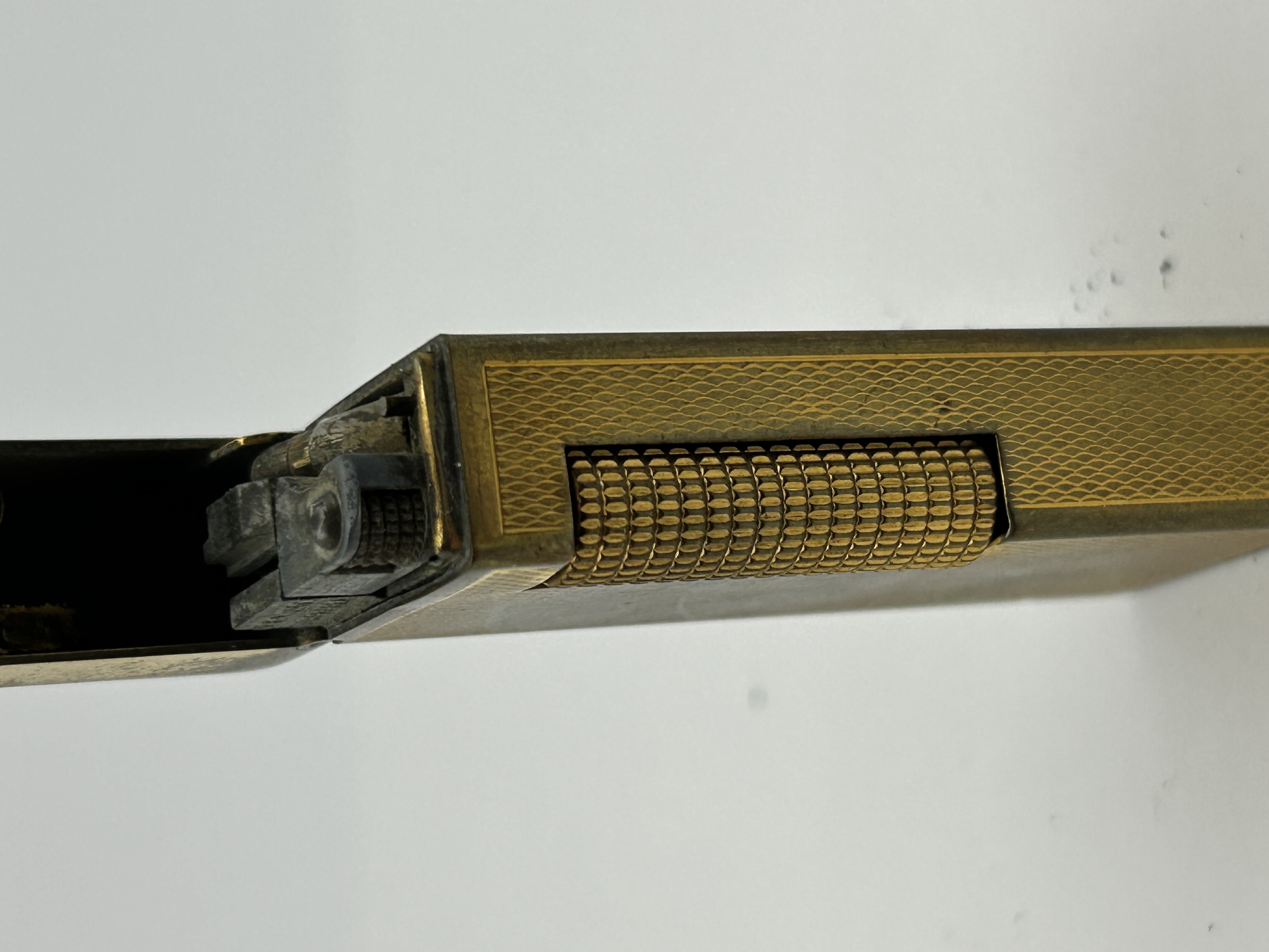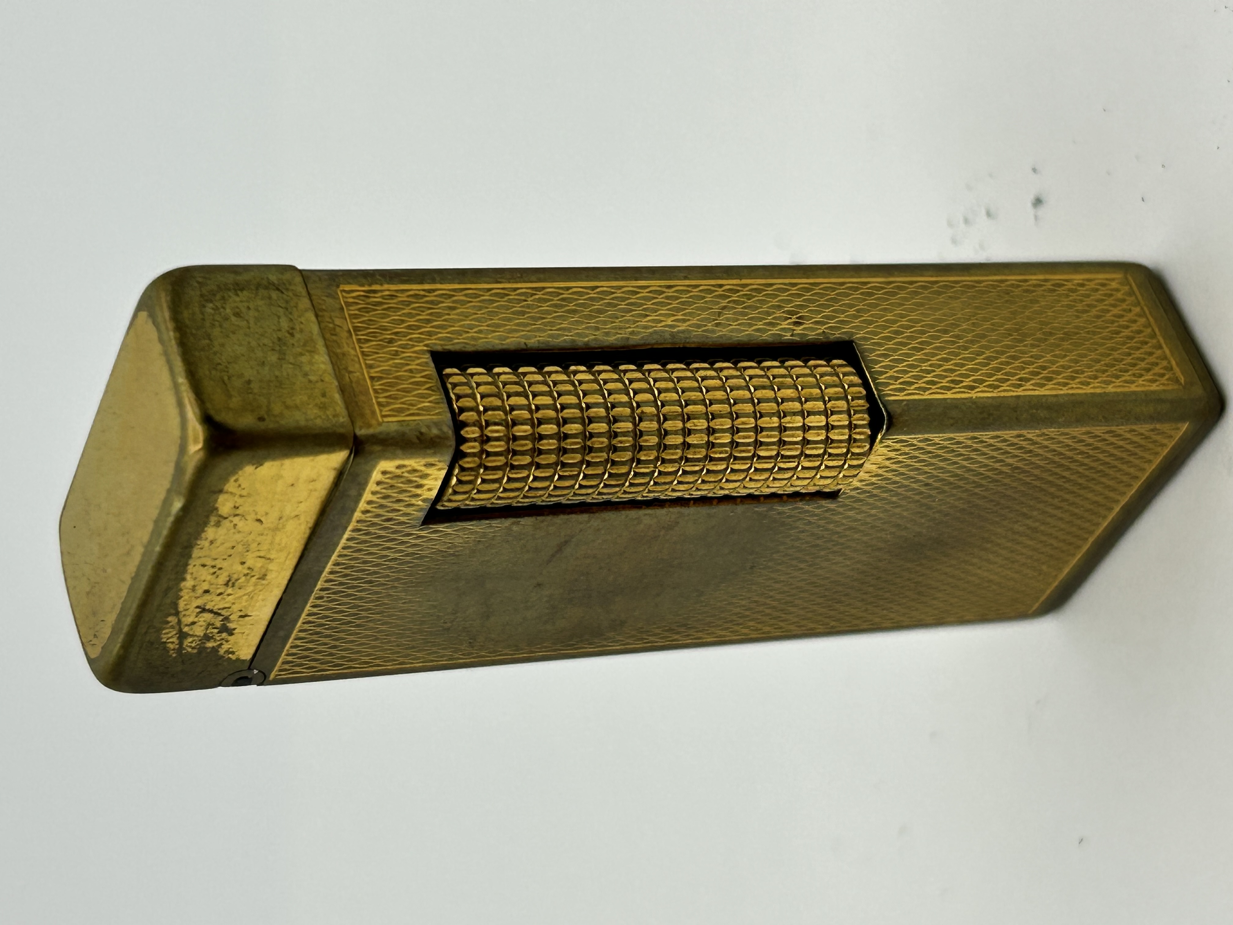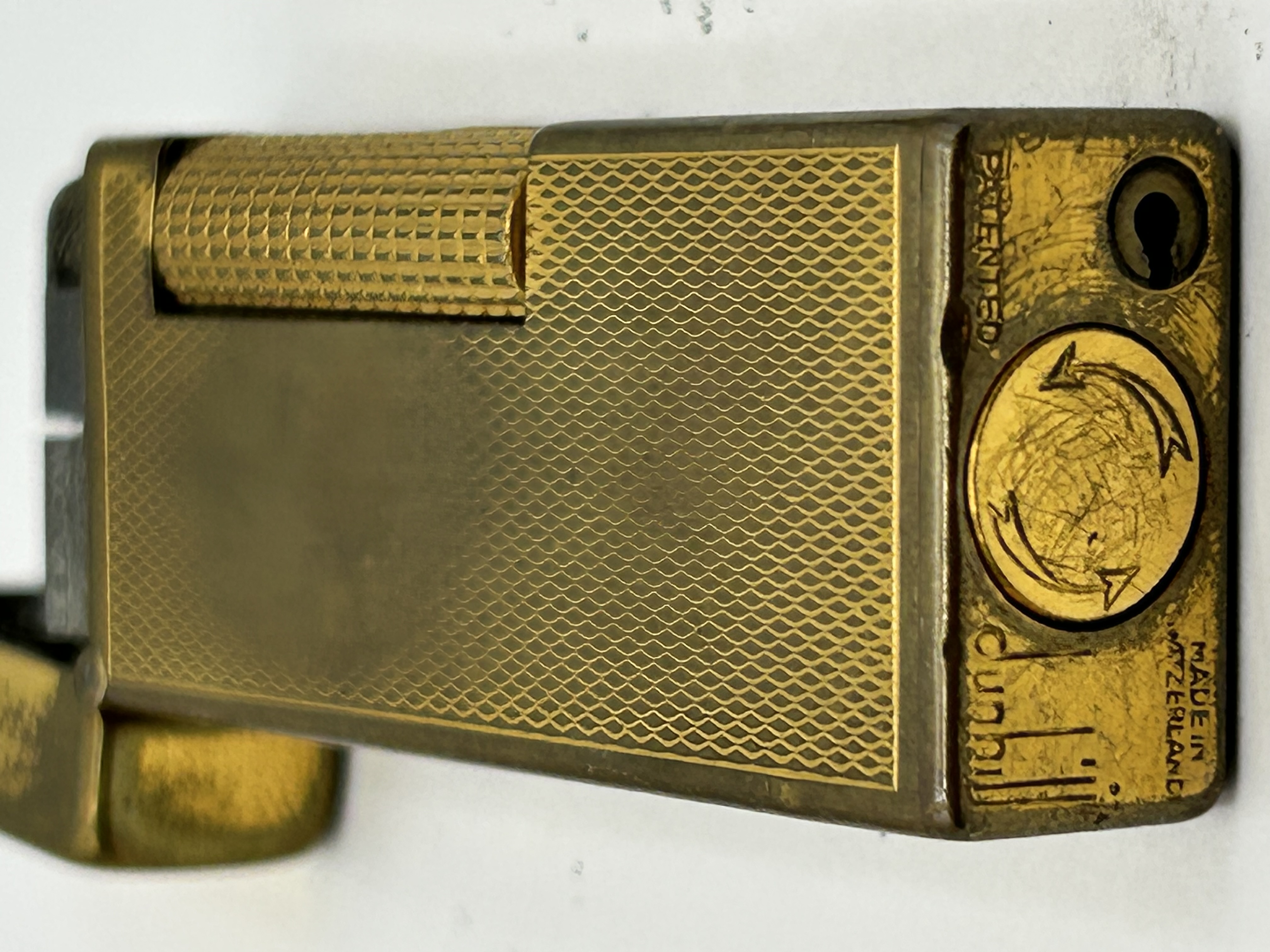 A Dunhill Rollagas gas pocket lighter featuring a gold-plated finish with an engine-turned barley pattern. The rectangular body is equipped with a side-mounted knurled roller ignition mechanism and a flip-top lid. The base of the lighter is stamped with the Dunhill maker mark in stylised lowercase lettering, along with the inscriptions MADE IN SWITZERLAND and PATENTED. The base also contains a circular gas adjustment dial marked with two curved arrows and a smaller slotted screw. This design is attributed to production during the 1960s.
