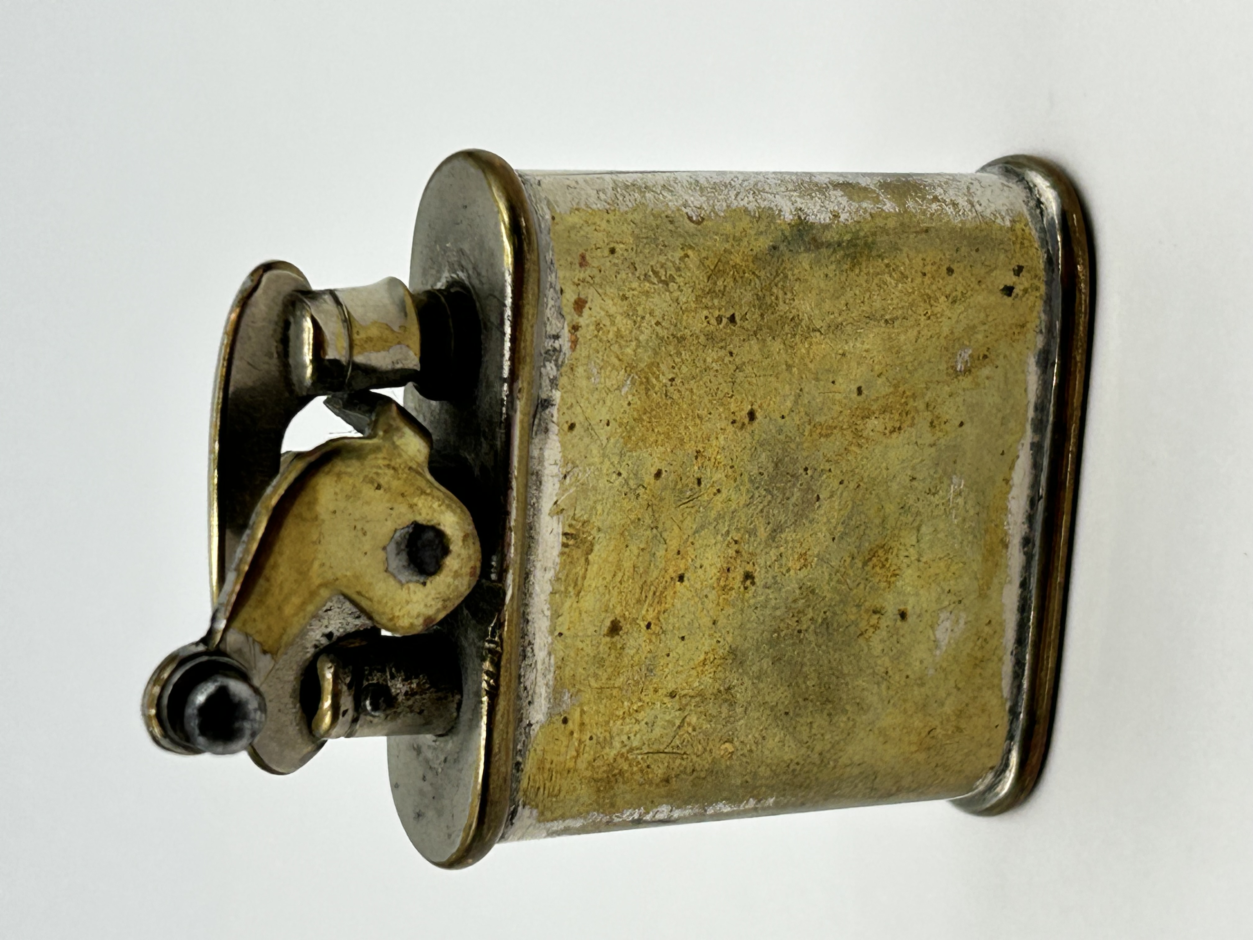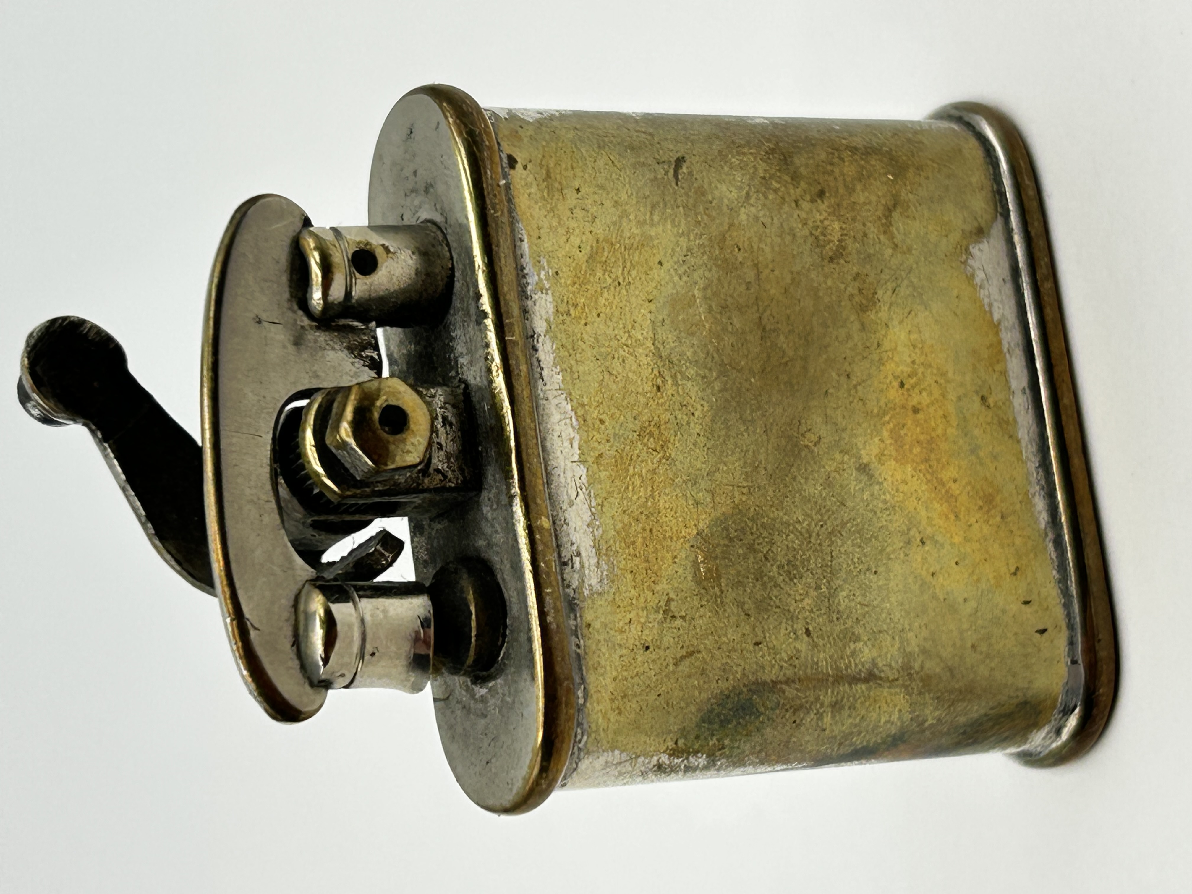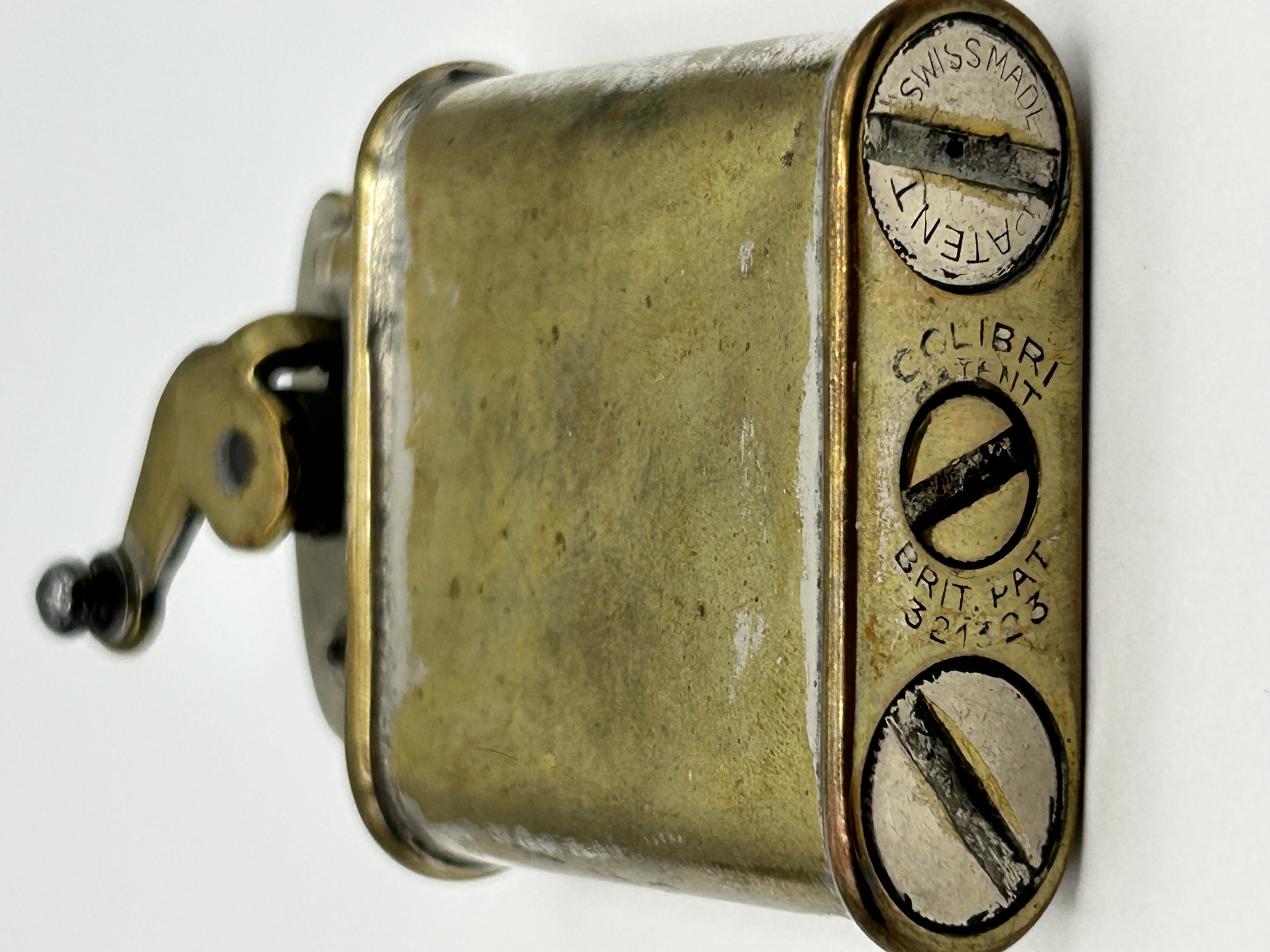 A vintage mechanical lift-arm pocket lighter manufactured by Colibri. The item is constructed from brass with evidence of original silver-toned plating. The mechanism features a kick-start lever design. The base of the lighter is equipped with three screw-down access ports. The underside bears the stamped inscriptions SWISS MADE, PATENT, COLIBRI, and BRIT PAT 321323. The British patent number 321323 is associated with Colibri designs from the late 1920s.