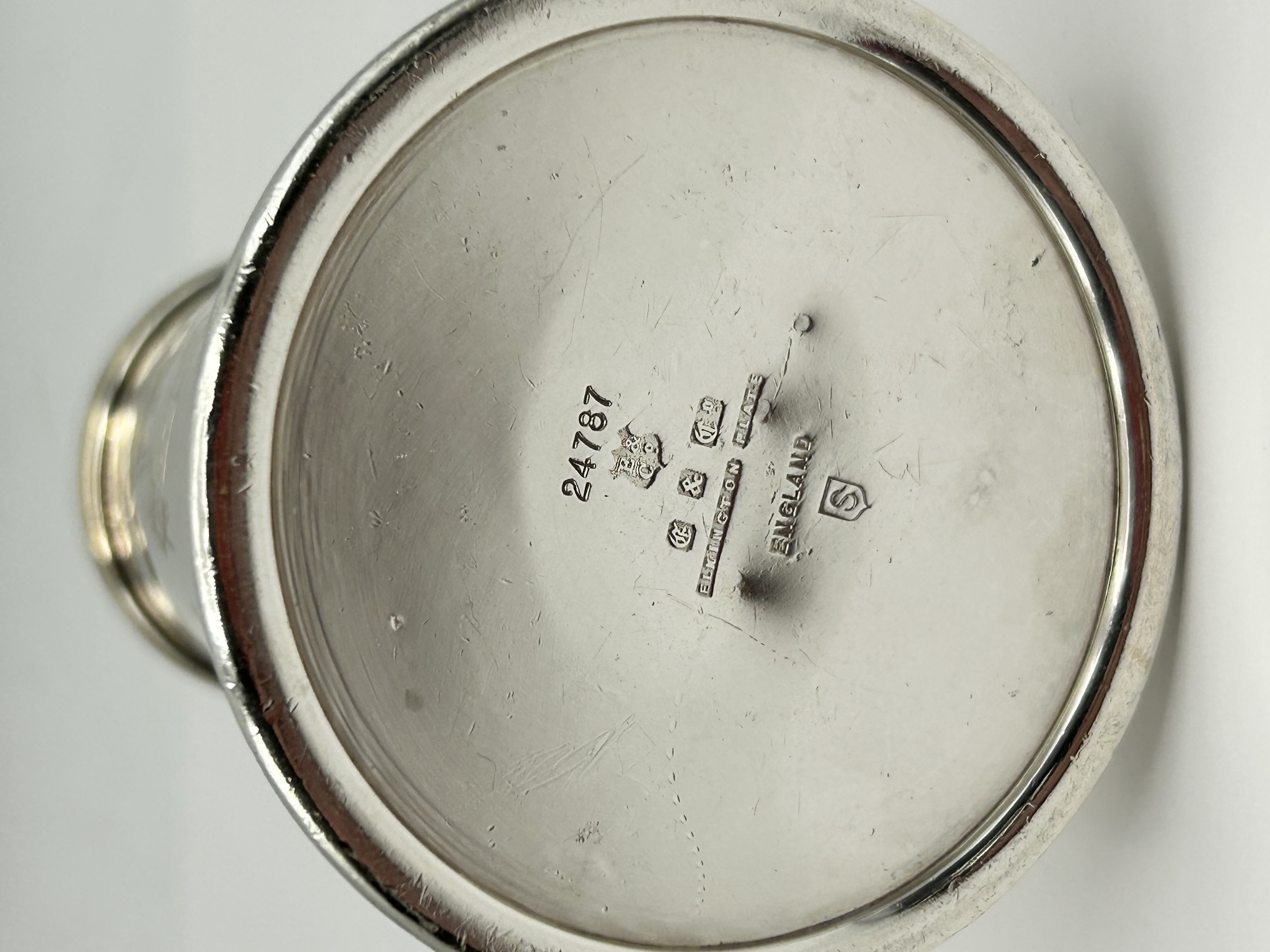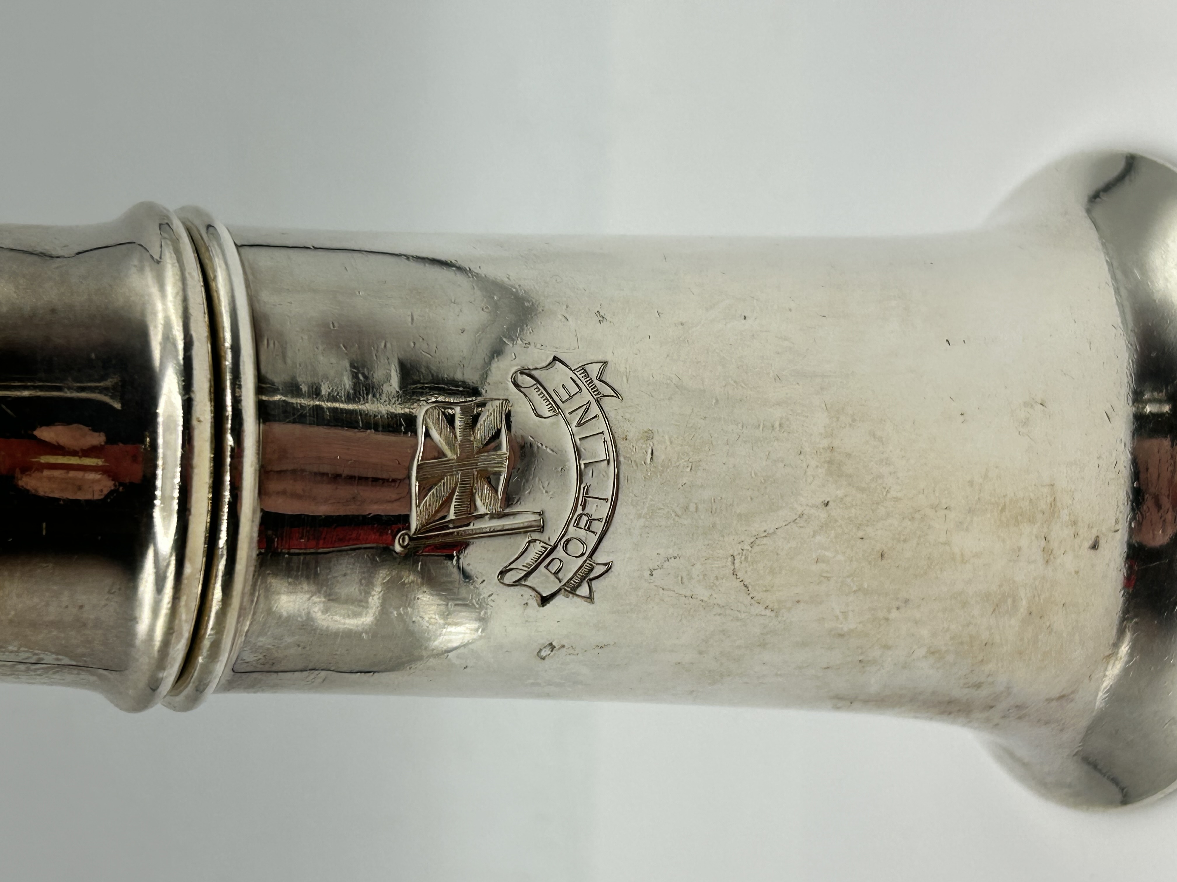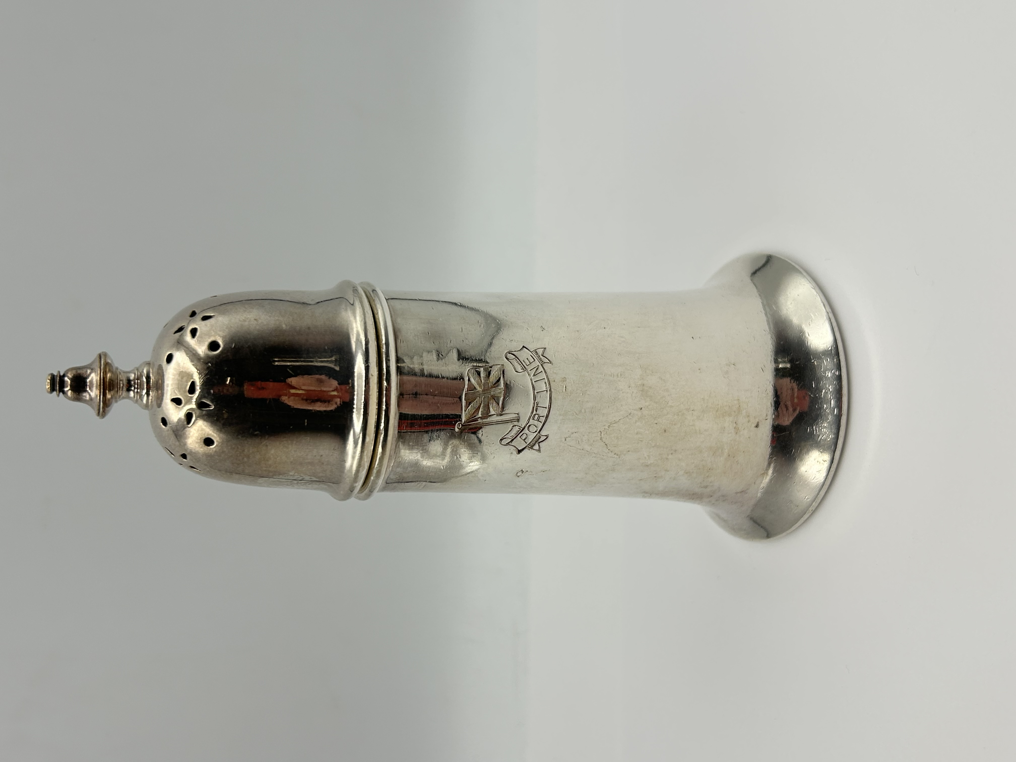 A silver-plated sugar or pepper caster of tapered cylindrical form with a flared pedestal base. The item features a detachable domed cover with decorative perforations and is surmounted by a knop finial. The body is engraved with the house flag and banner for the Port Line shipping company. The base is struck with the pattern number 24787 and a crest. Below are four individual marks in shields comprising a crown symbol, E, &, and Co. Further marks include ELKINGTON PLATE, ENGLAND, and the date letter S in a shield.