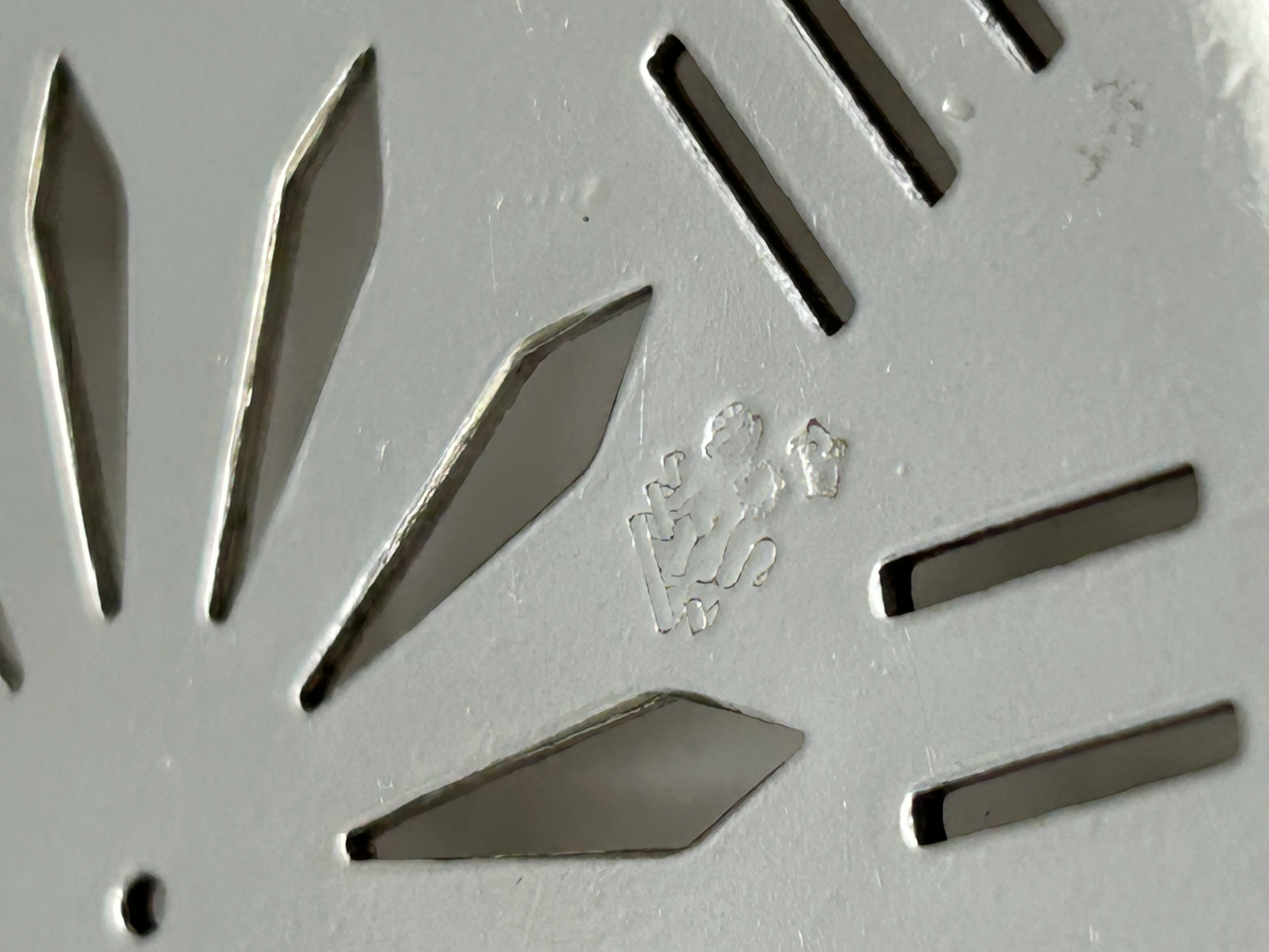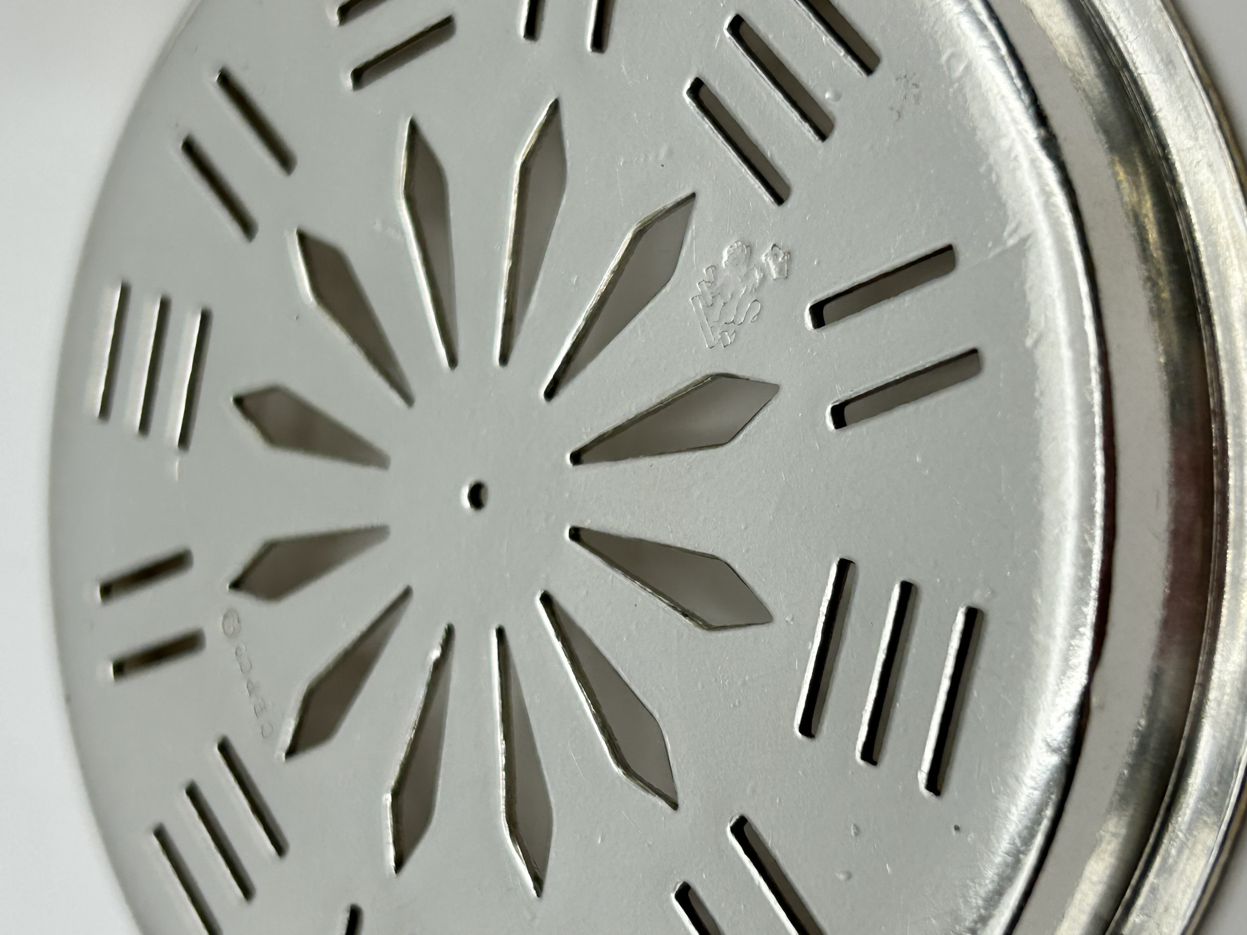 An Art Deco silver-plated butter dish of circular form, produced for the Cunard White Star Line. The piece consists of a shallow bowl with twin horizontal, stepped, and ribbed handles. It contains a removable pierced liner featuring a central geometric sunburst motif surrounded by radiating linear slots. The interior surface of the liner is stamped with the characters EPNS, indicating Electroplated Nickel Silver, alongside a pictorial mark depicting the Cunard crest of a lion rampant holding a globe.