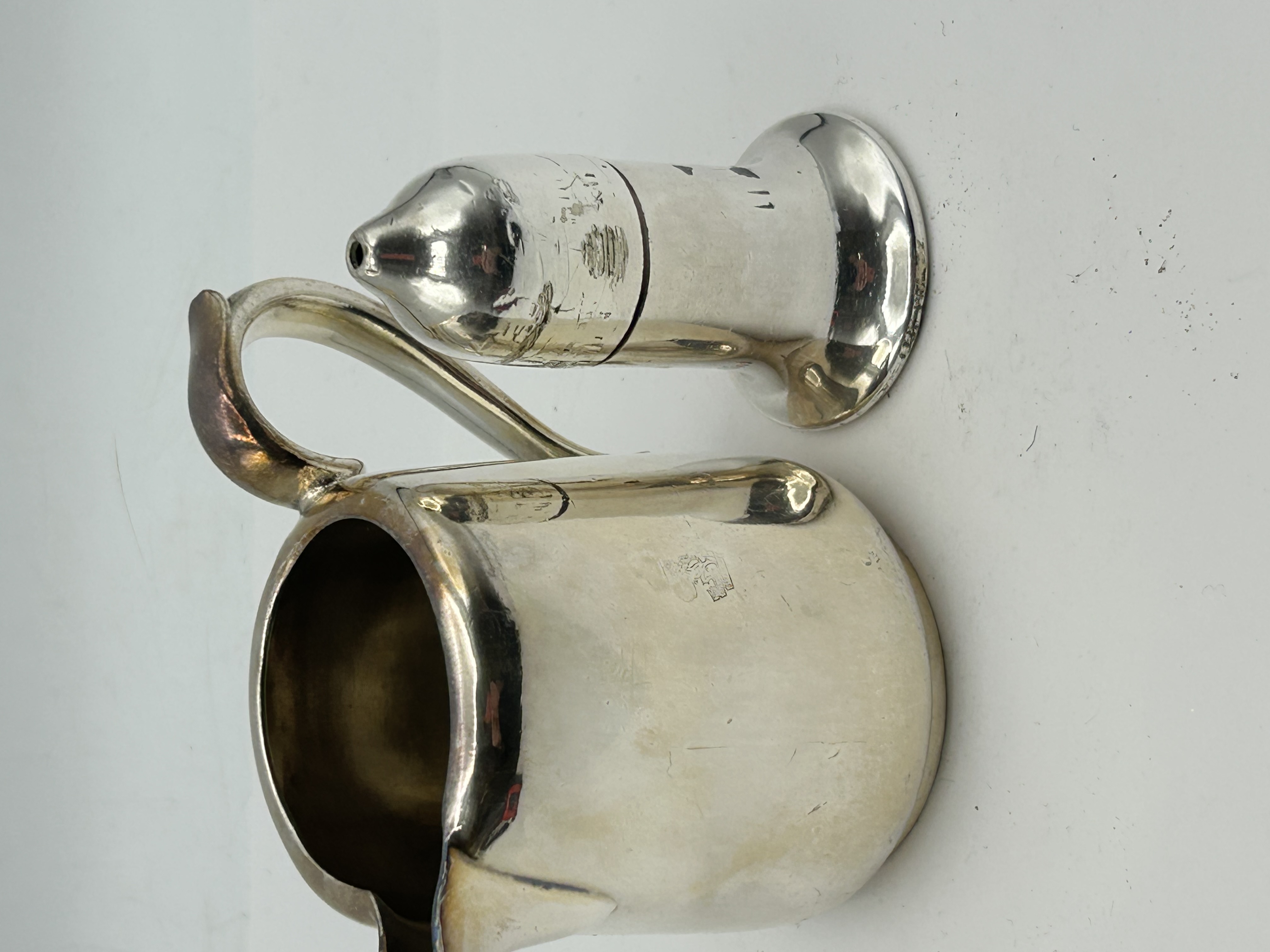 Two silver-plated tableware items manufactured by Elkington and Co. for the Cunard Line shipping company, dating to the mid-20th century. The collection consists of a caster and a cream jug. The caster features a waisted body and a push-fit domed cover with a single aperture. The base is stamped with the number 25662, ELKINGTON PLATE within a rectangular border, ENGLAND, and the letter O inside a circle, corresponding to the year 1950. It also bears the Cunard crest of a crowned lion rampant holding a globe above the word CUNARD. The cream jug is of cylindrical form with a short spout and a simple loop handle. The body is engraved with the Cunard lion crest. The base is marked with a diamond containing 57, the letter A, the number 18861, and a series of shields containing a crown, E, &, and Co. It is further marked ELKINGTON PLATE, with the letter J inside a circle, corresponding to the year 1945, and 1 1/2 P.