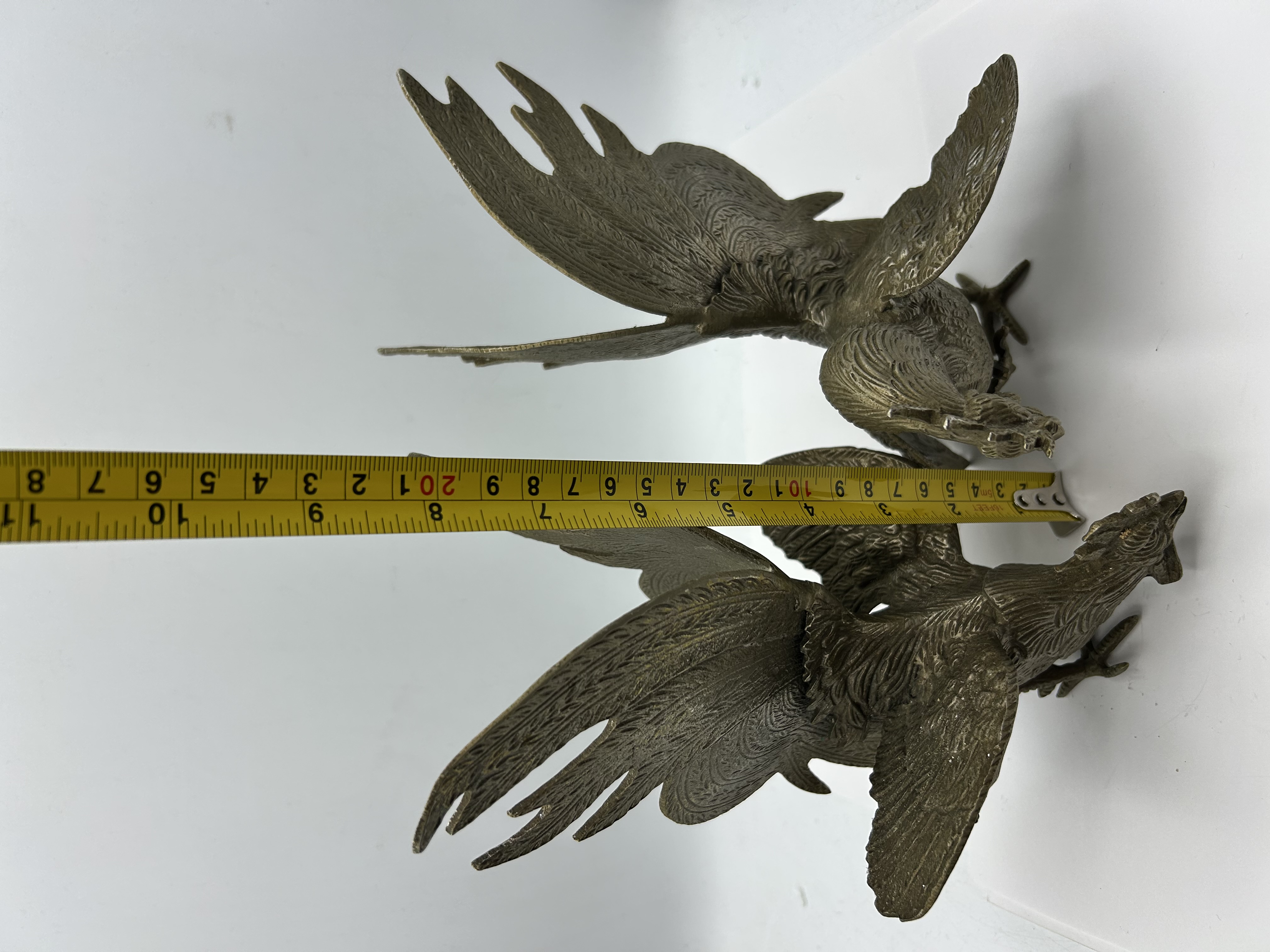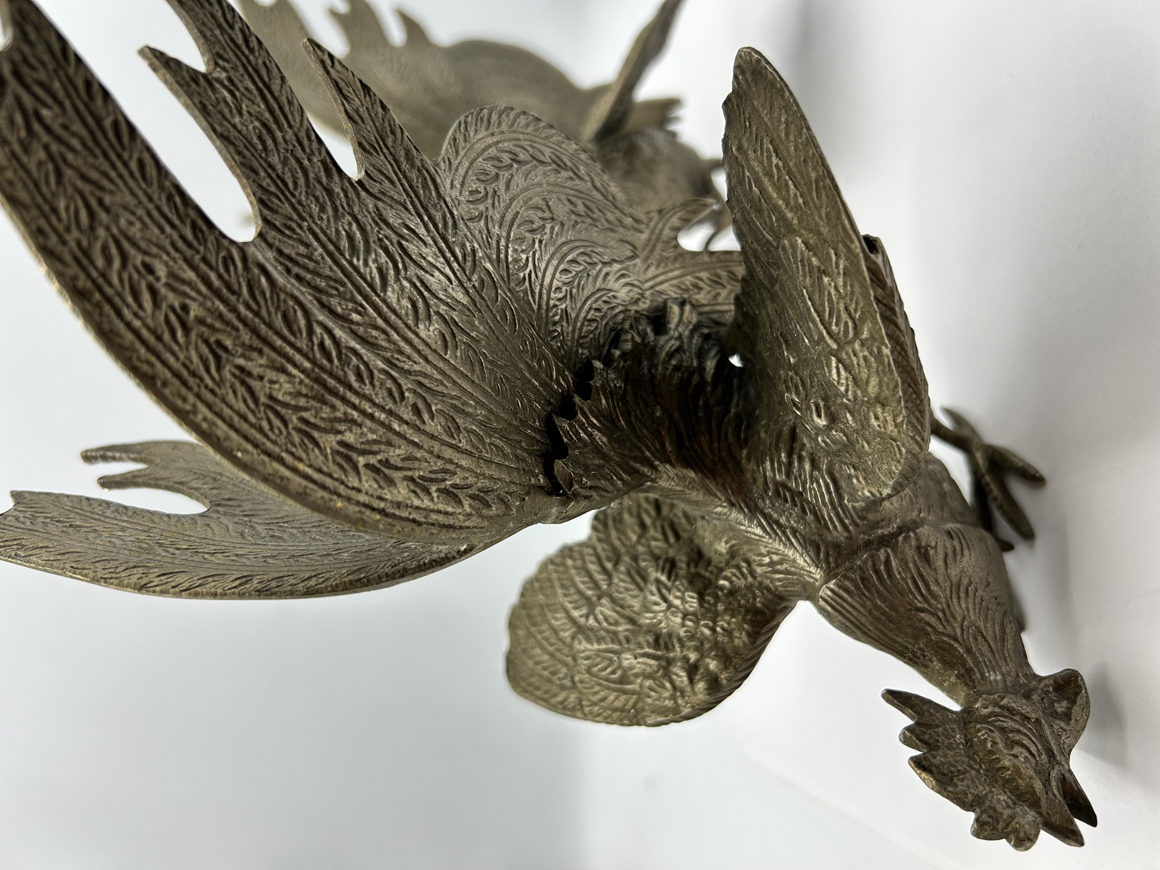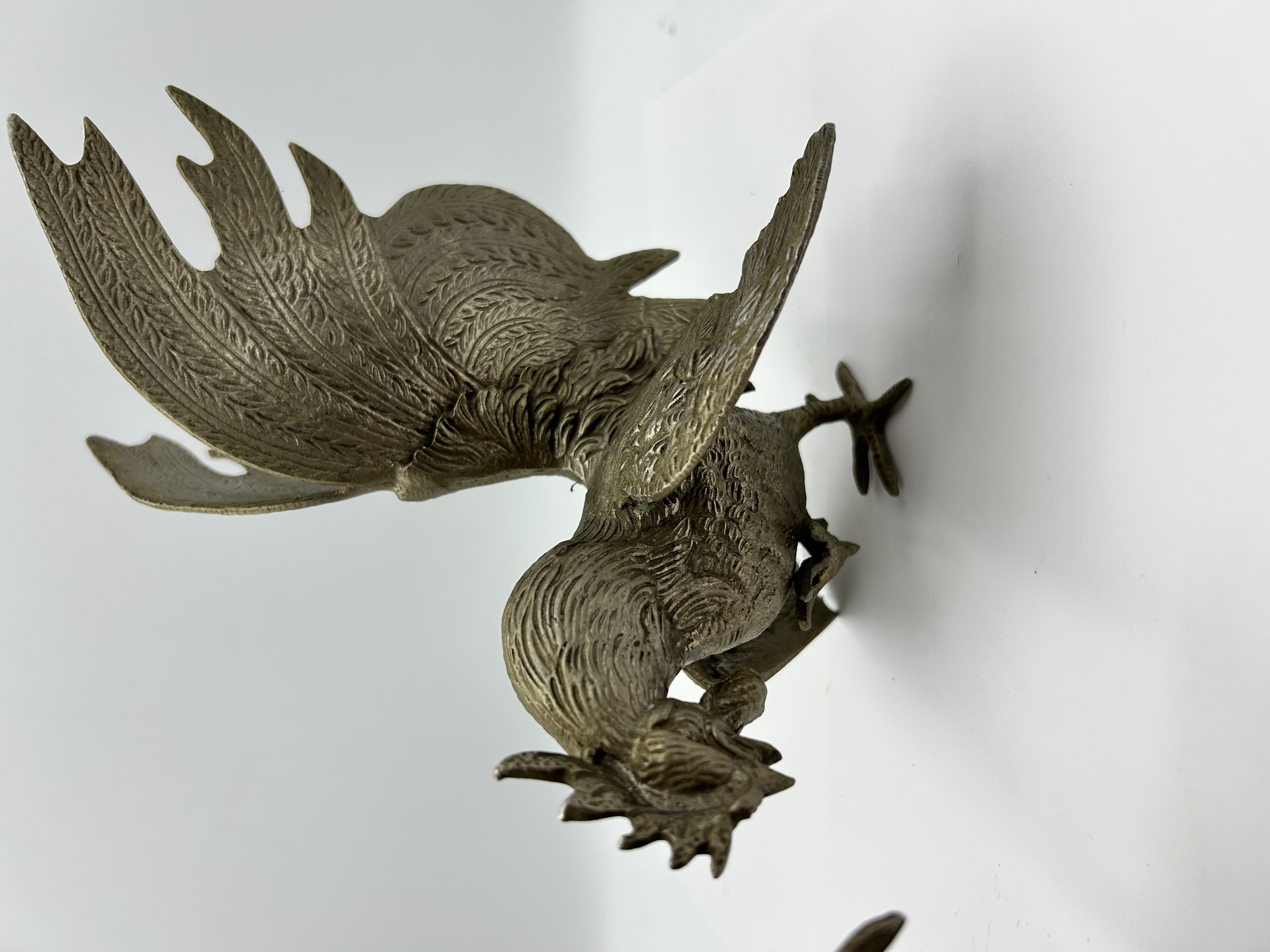 A pair of decorative fighting cock or rooster figurines, likely produced in the mid-20th century. The figures are constructed from cast metal, appearing to be brass or bronze, with a dark, aged patina. Each bird is depicted in a dynamic, naturalistic pose with wings spread and heads lowered. The casting features high-relief detailing, particularly in the textured plumage of the wings, bodies, and long tail feathers. The surface shows evidence of post-cast finishing to define the intricate feather patterns. No maker marks or signatures are visible on the exterior surfaces. Similar examples are often attributed to Japanese or European manufacture from the 1950s.