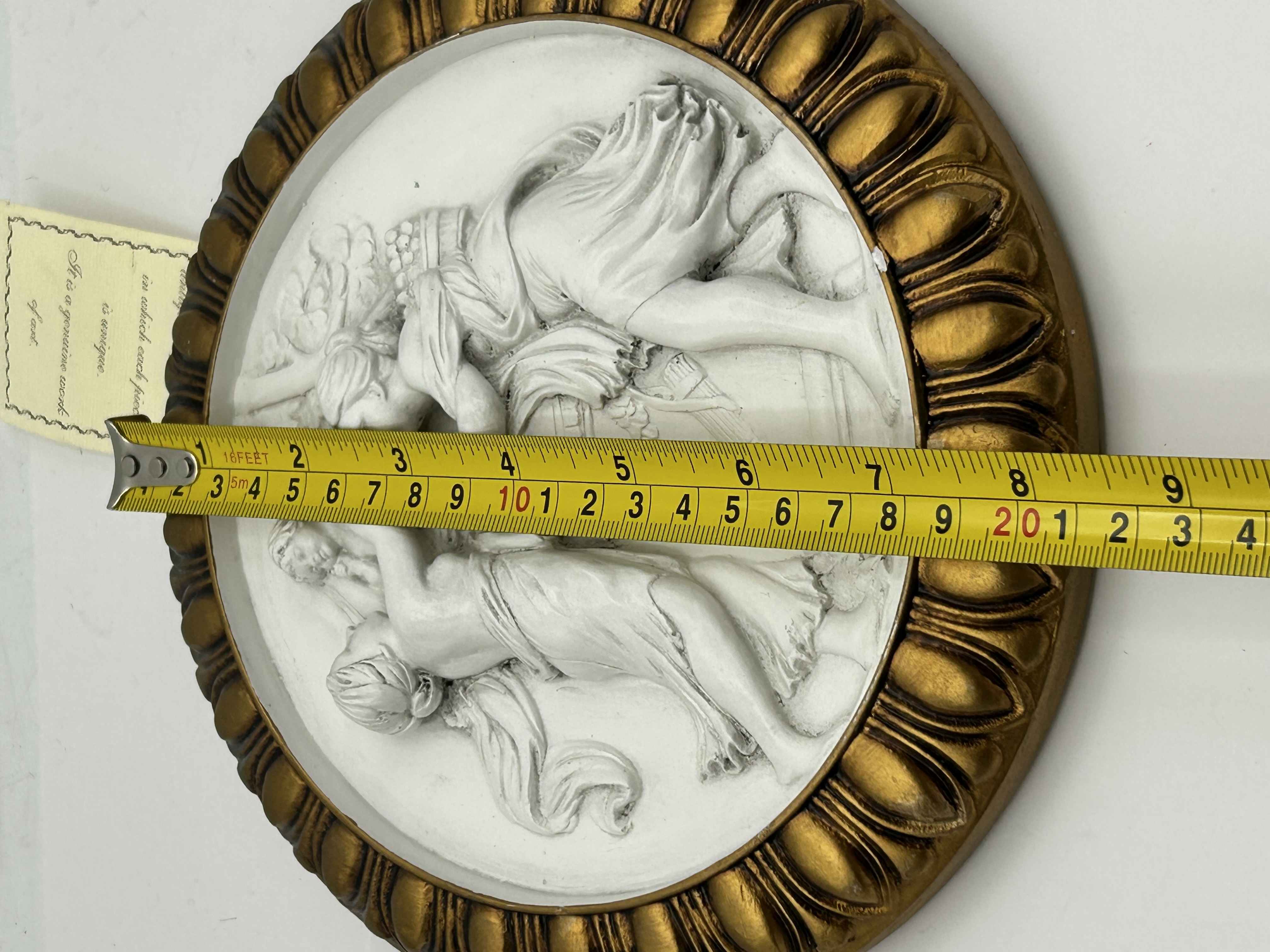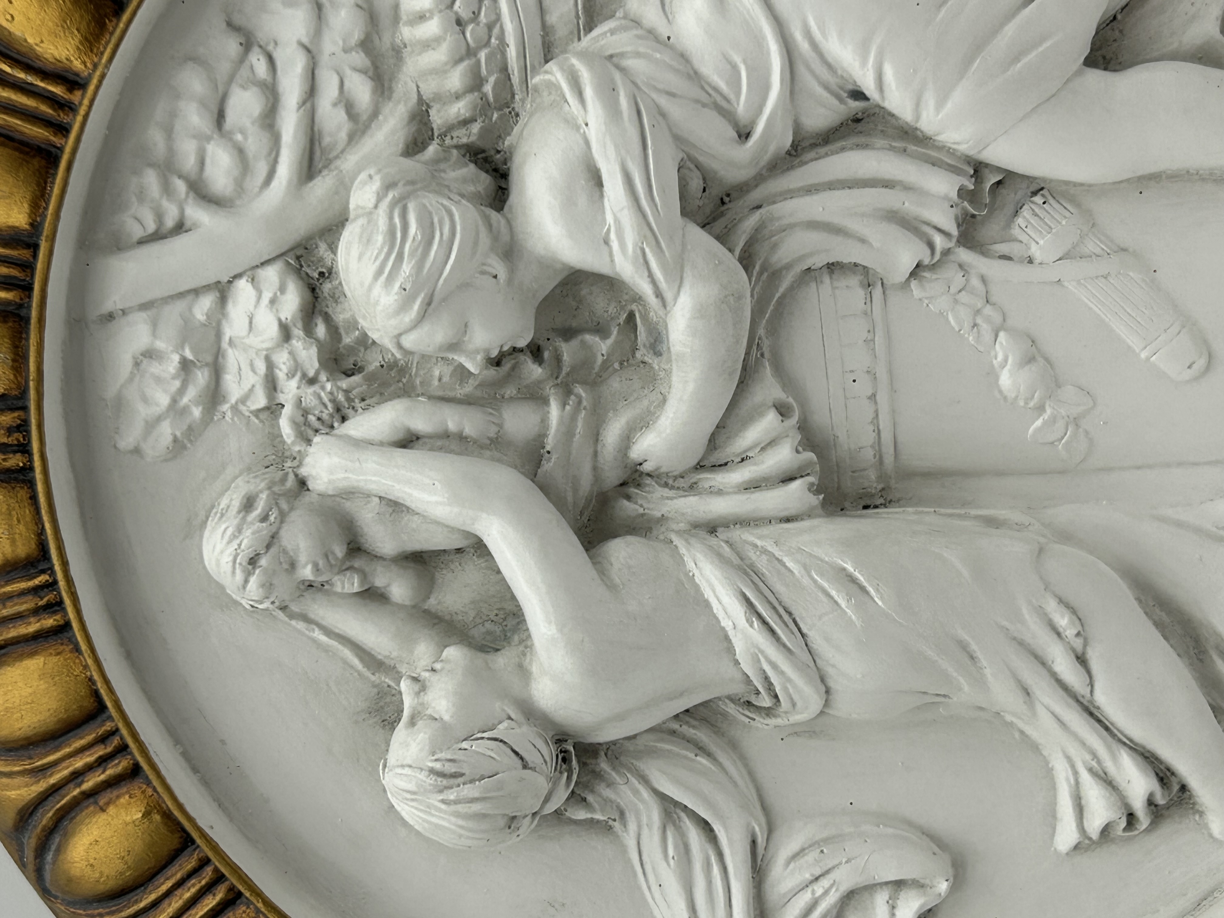 A circular wall plaque in the Neoclassical style, featuring a high-relief moulded scene in a matte white finish. The composition depicts three figures in classical drapery within a landscape setting, including a quiver of arrows and foliage. The central relief is set within a circular gilt-finished frame with a repeating gadrooned border. The construction is consistent with mid-20th-century chalkware or plaster decorative items, resembling the work of manufacturers such as Alexander Backer. No maker’s marks or signatures are visible on the face of the object.