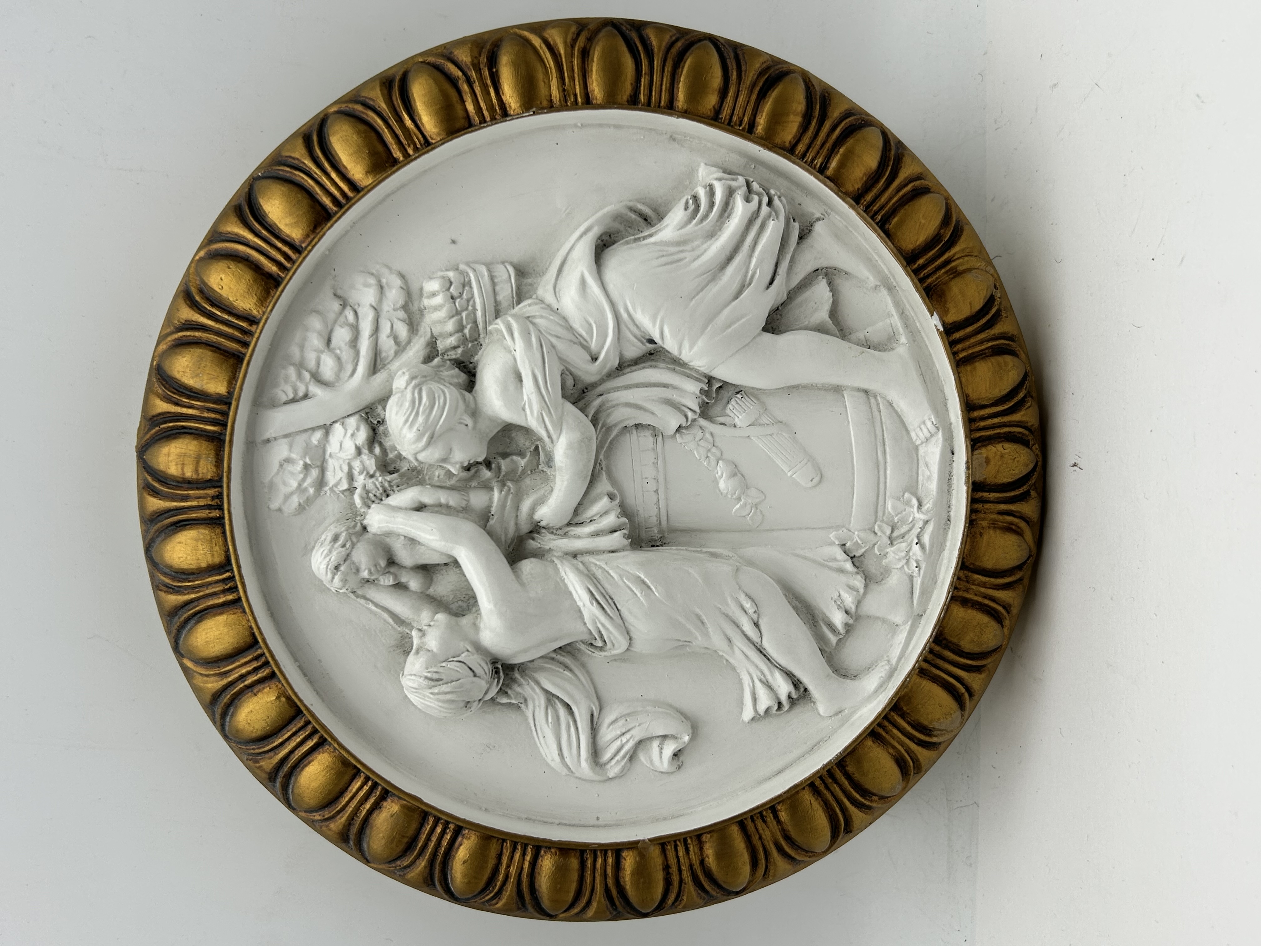 A circular wall relief plaque in the neoclassical style, attributed to the Alexander Backer Company (ABCO). The piece features a high-relief scene in a matte white finished chalkware, depicting three draped female figures in a landscape with a basket and a quiver of arrows. The scene is set within a circular composite frame with a gilded, gadrooned border. No maker’s marks or signatures are visible. A partial manufacturer’s paper tag is present on the reverse, bearing the text: in which each piece is unique. It is a genuine work of art.