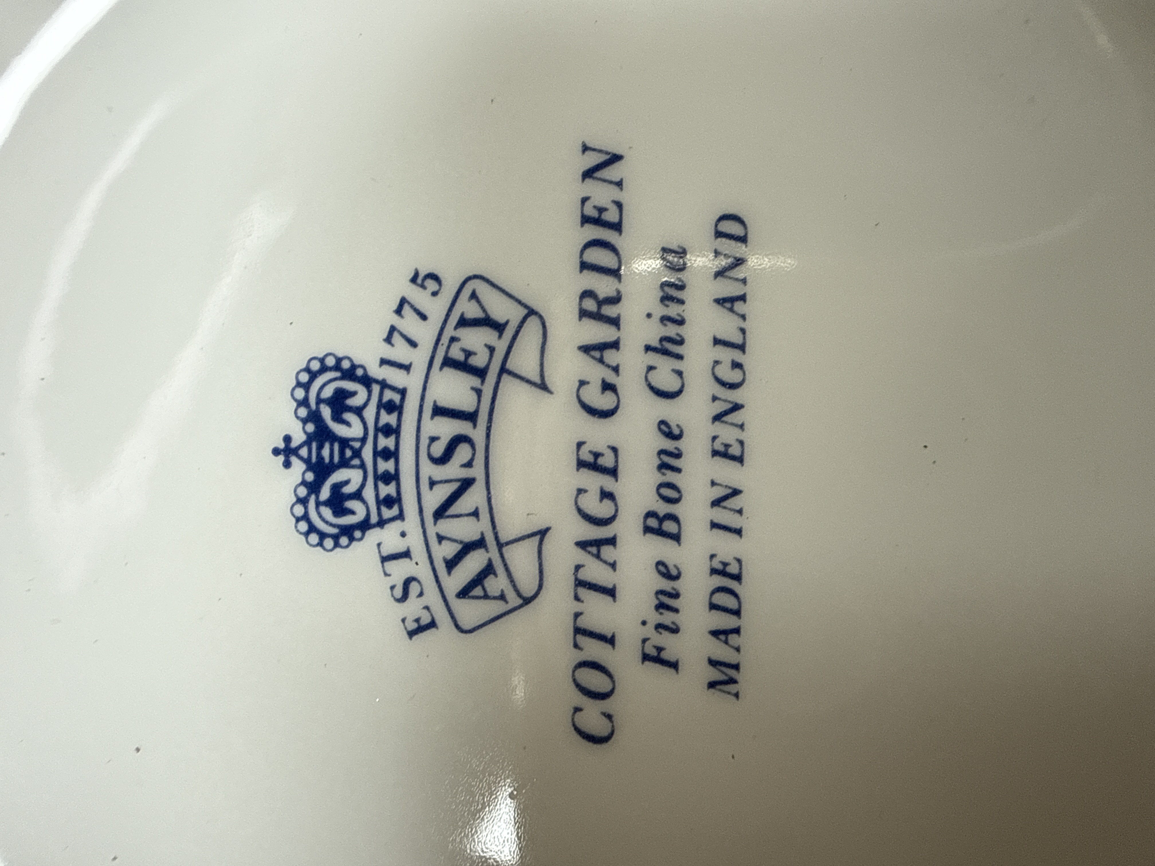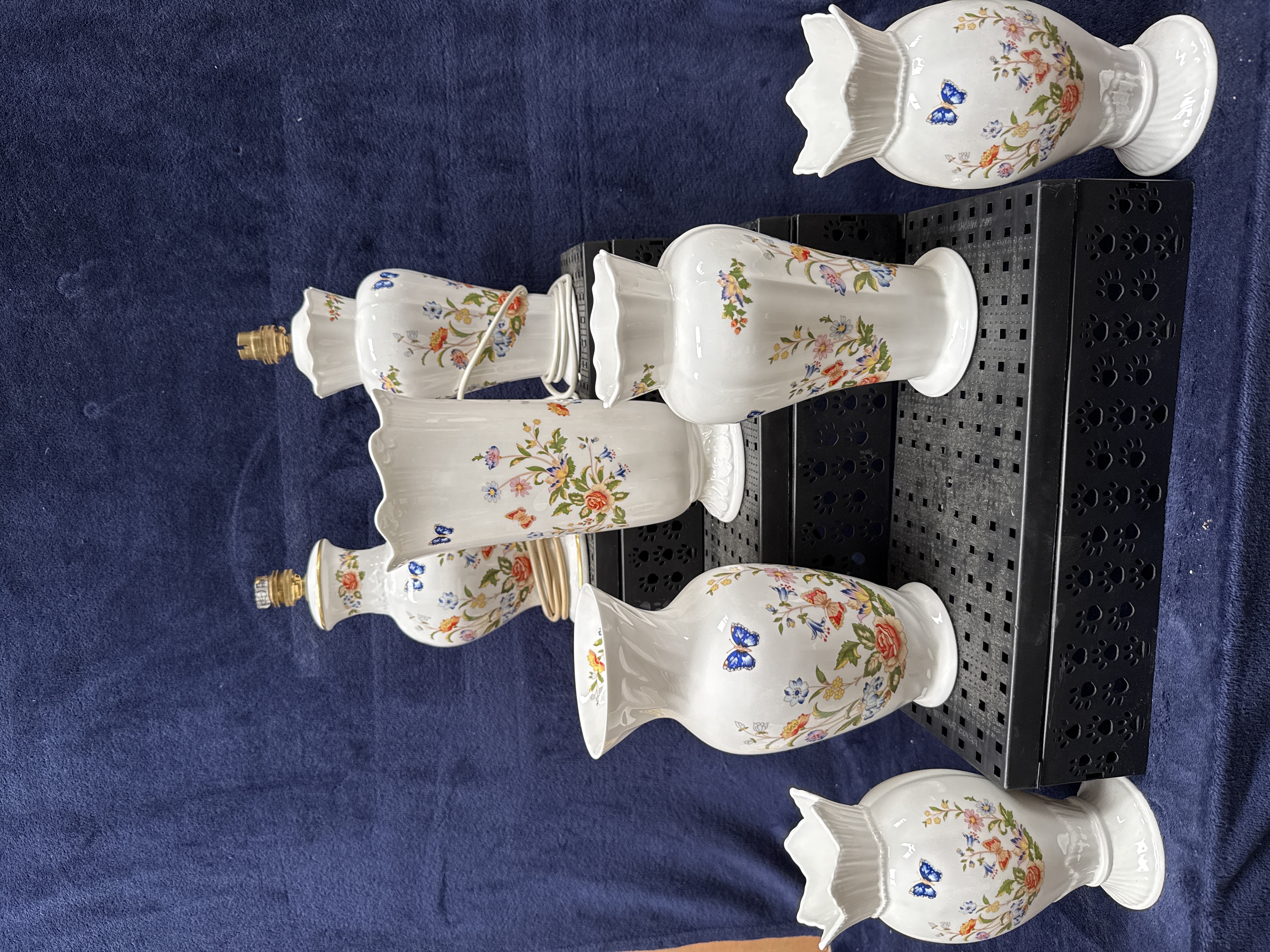 A collection of seven pieces of fine bone china produced by Aynsley in the Cottage Garden pattern. The group includes two table lamp bases of baluster form, fitted with brass-toned light sockets and white electrical cords. The assortment of vases comprises two vases of swelling form with flared rims and footed bases, two smaller vases with wide wavy scalloped rims and footed bases, and one taller cylindrical vase with a flared scalloped rim. Each piece features a vibrant transfer-printed design of traditional English garden flowers, including roses and bluebells, accompanied by colourful butterflies against a white ground. The base of each item bears a blue printed mark featuring a crown above a banner containing the name AYNSLEY, with EST. 1775 above and COTTAGE GARDEN, Fine Bone China, and MADE IN ENGLAND below.