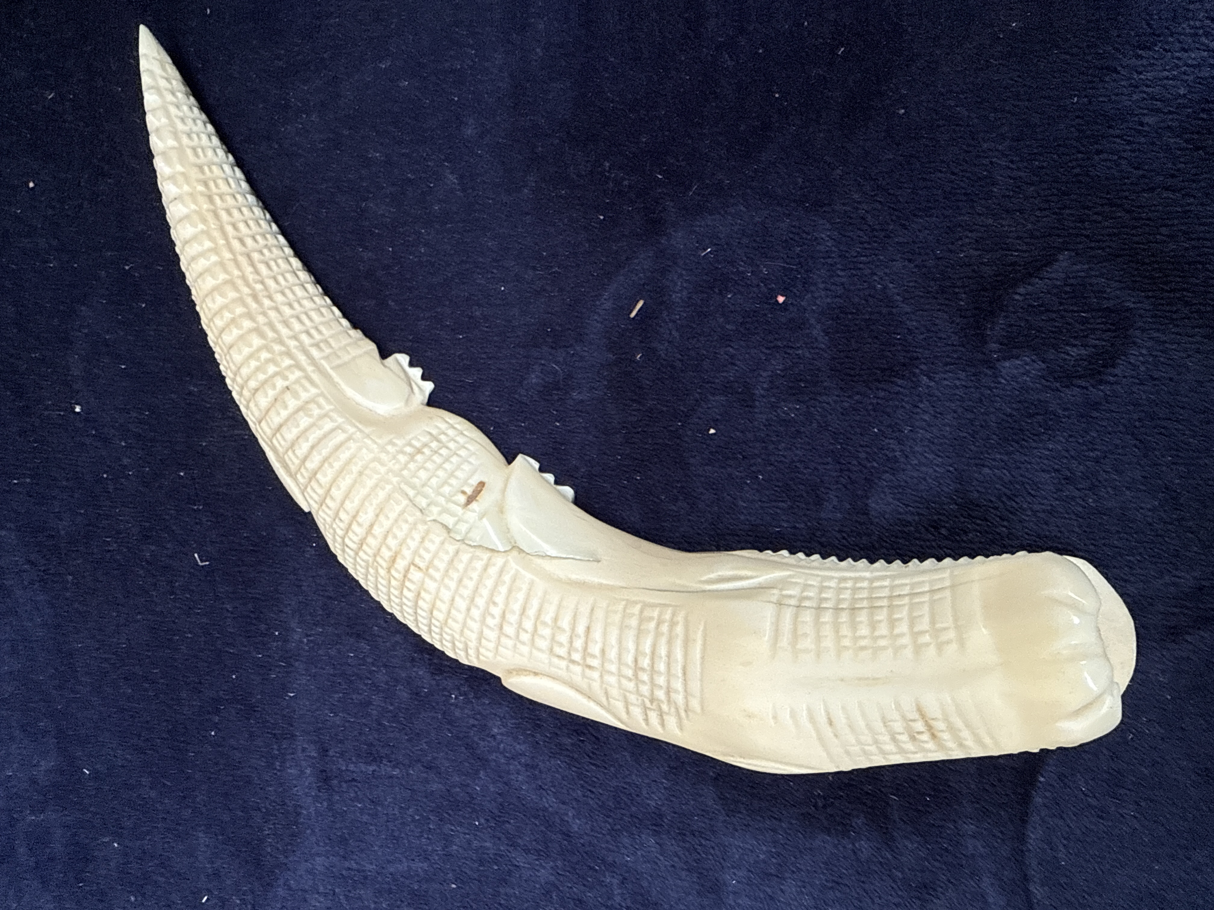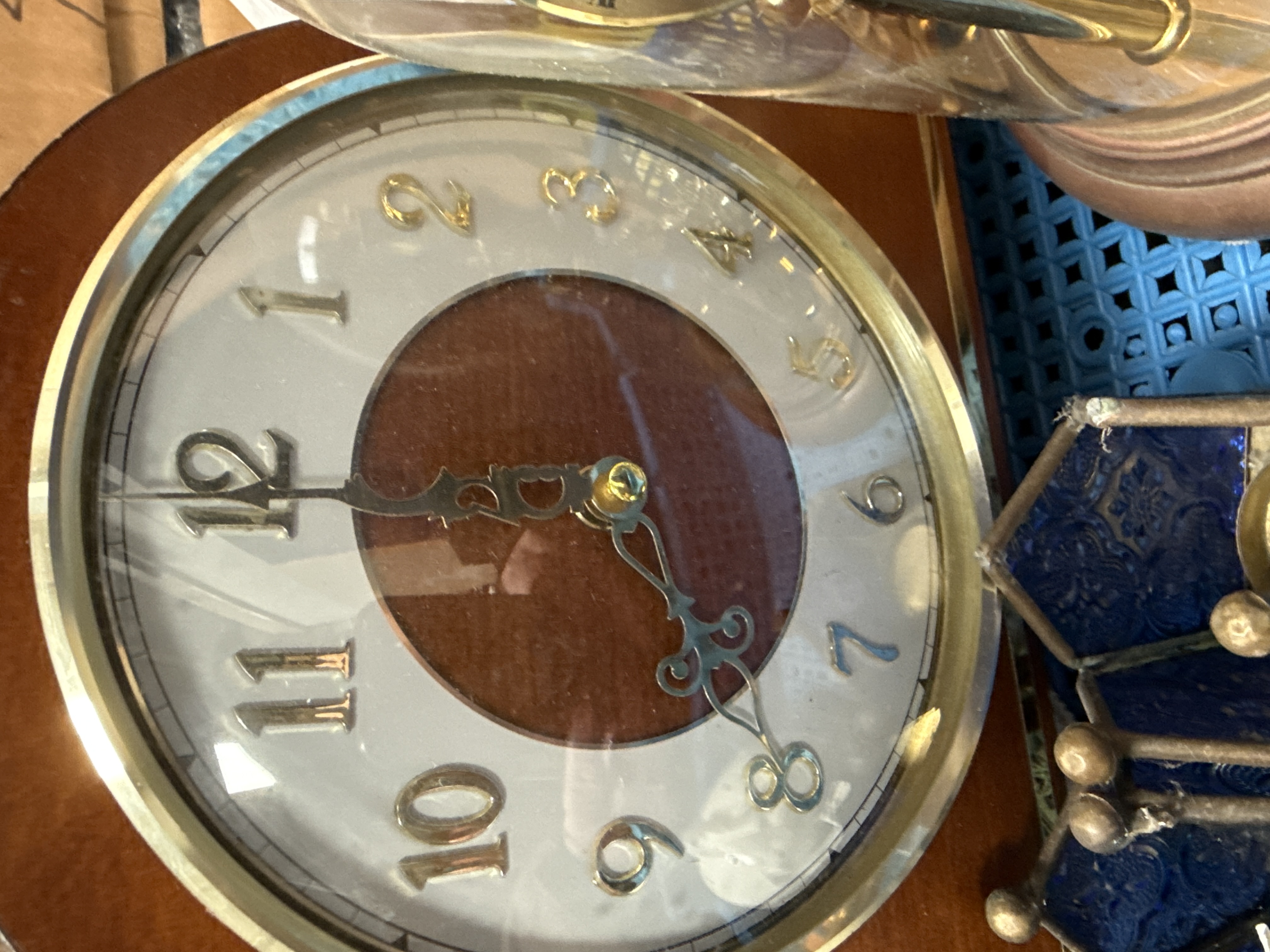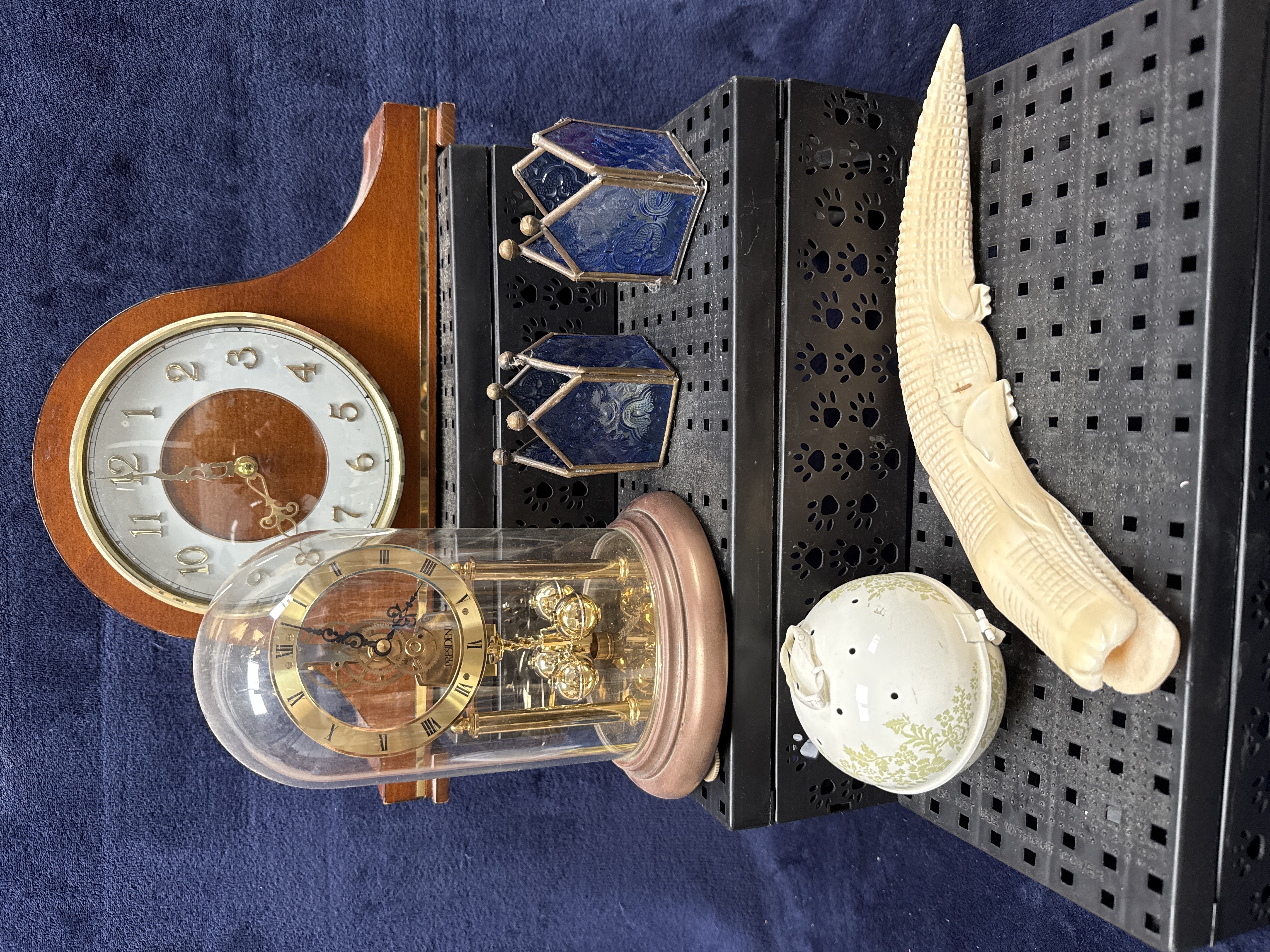 This lot comprises two clocks and several decorative objects. The first is a Napoleon hat style mantel clock featuring a polished mahogany-effect wooden case with a stepped base. The dial is designed with a silvered chapter ring, applied gold-toned Arabic numerals, and a wood-inlaid centre with ornate openwork hands behind a glass bezel. The absence of winding holes indicates a quartz movement. The second clock is a mechanical torsion or anniversary clock marked President on the dial. It features a rotating four-sphere pendulum and a gold-toned dial with Roman numerals, all housed within a brass-toned metal frame and a clear glass dome. Decorative items include a carved figure of a crocodile made from a dense off-white natural substance with detailed scale textures. Also included are a pair of hexagonal metal-framed lanterns with blue pressed glass panels and a white ceramic lidded pomander with a green transfer-printed floral design.