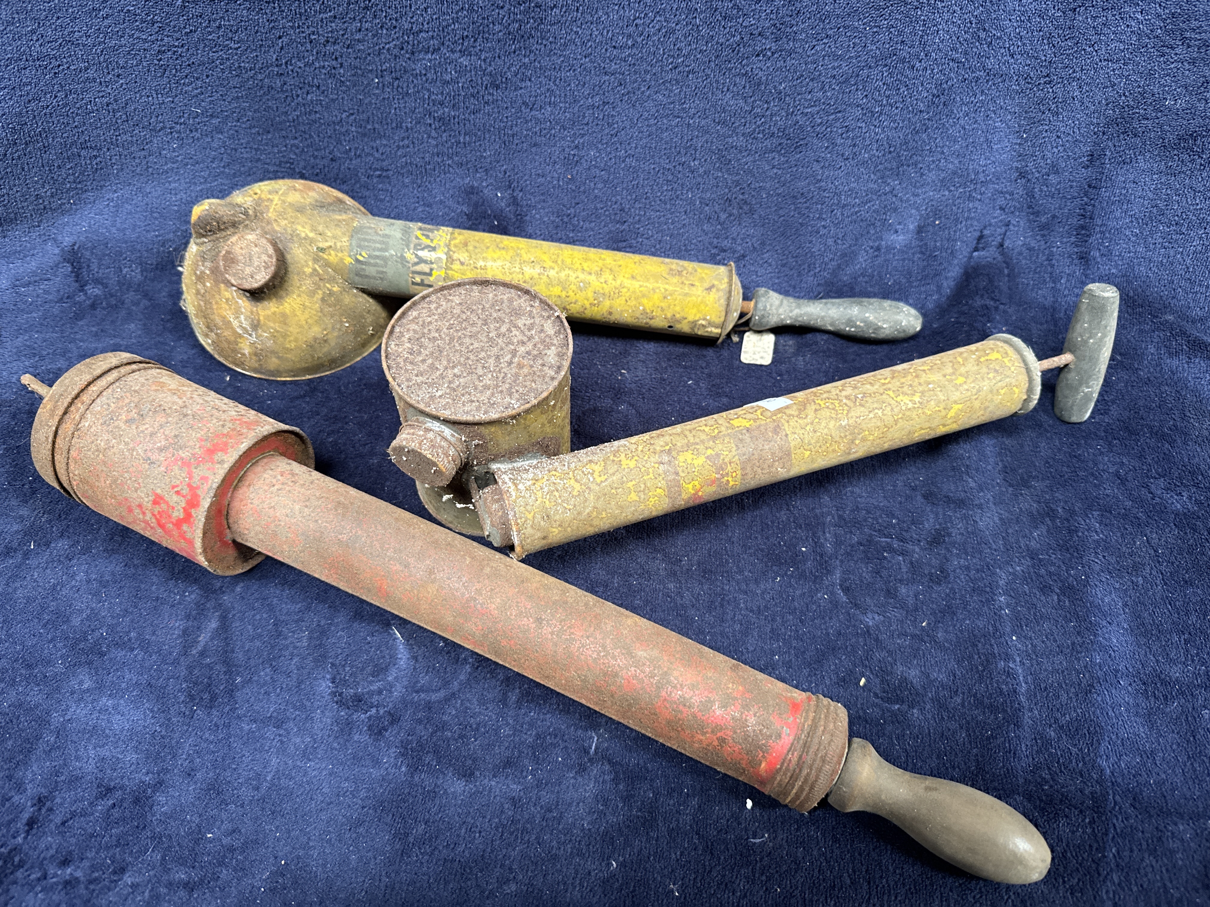 A collection of three vintage metal hand-pump sprayers, typically utilised for insecticide or agricultural purposes. The group includes one sprayer with a yellow-painted metal body and a circular reservoir, bearing the printed mark COOPER’S FLYSOL. This item is fitted with a wooden bulb-shaped handle. A second yellow-painted sprayer consists of a pump cylinder with a grey T-bar handle and is missing its reservoir tank. The third, larger sprayer is finished in red paint and features a large cylindrical reservoir at the nozzle end with a wooden bulb handle. All three items are of metal construction.