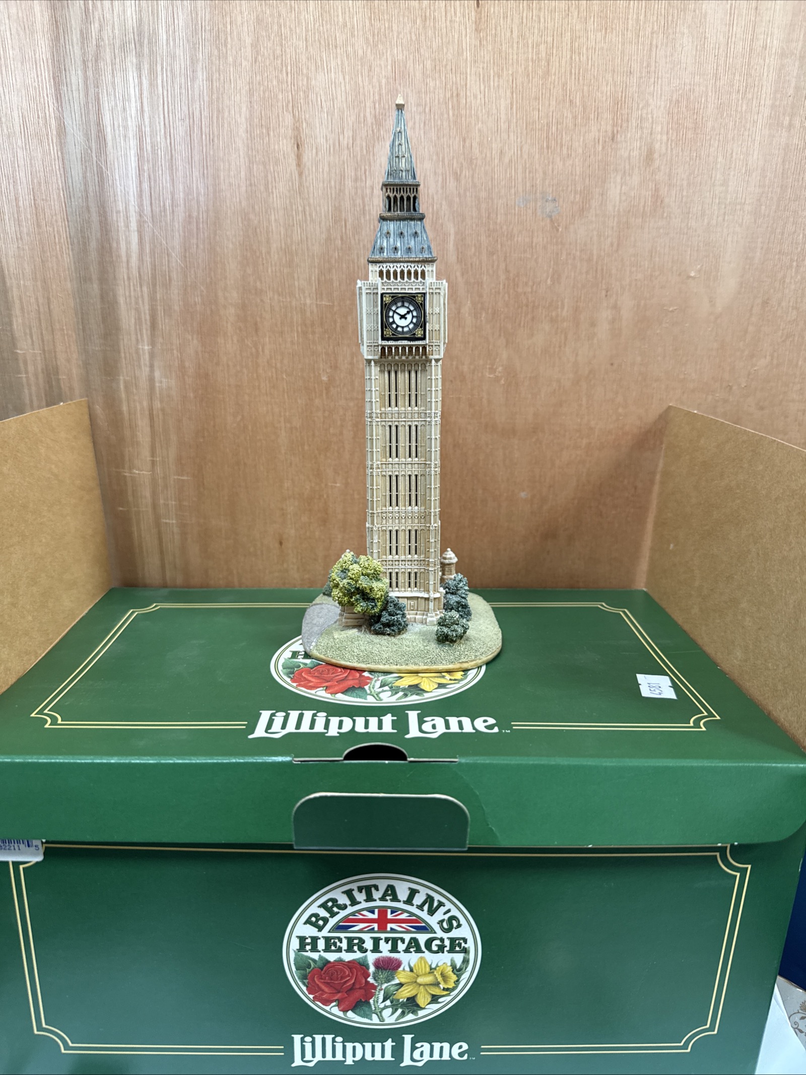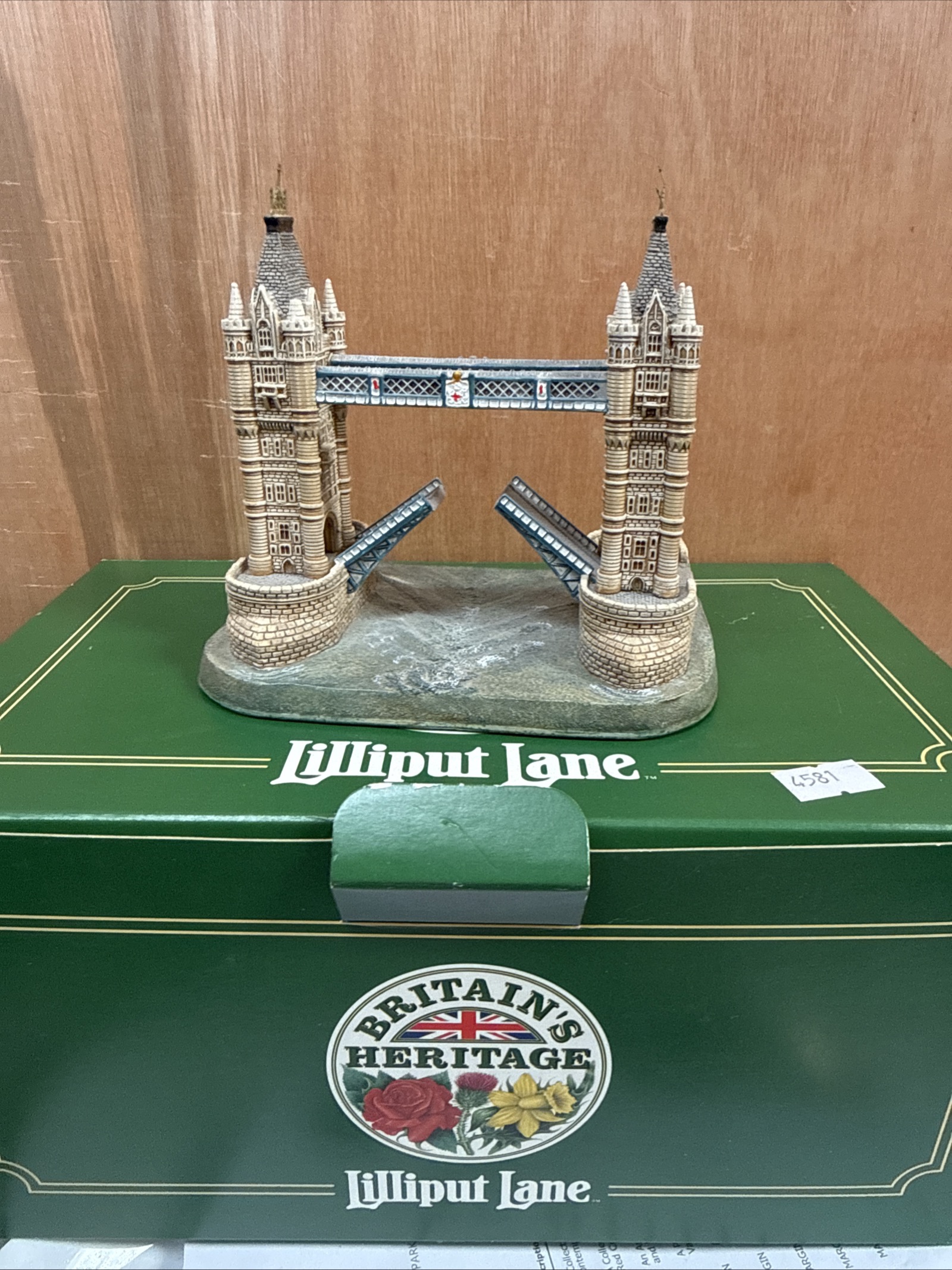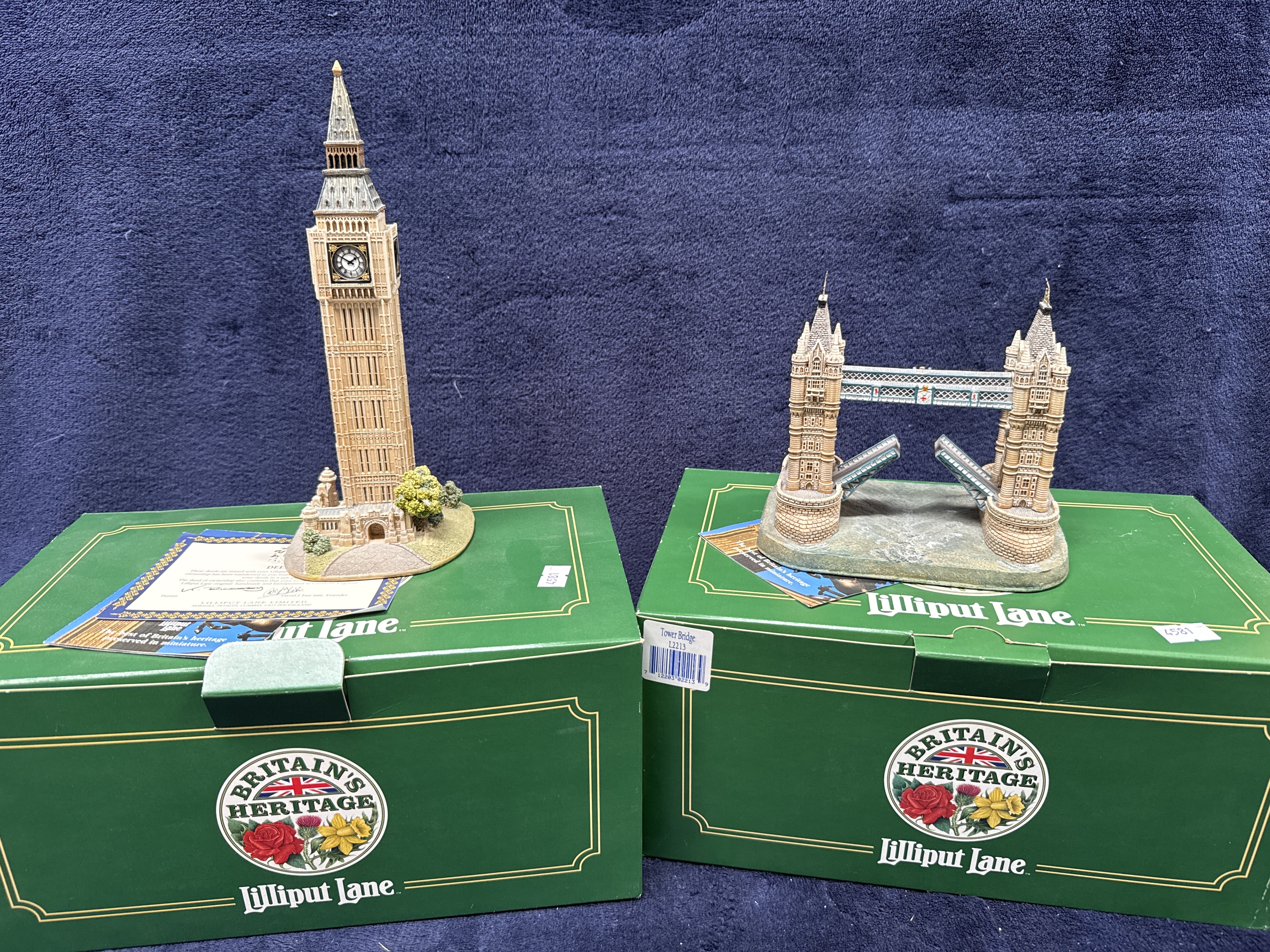 Two Lilliput Lane hand-painted cast resin architectural miniatures from the Britain’s Heritage collection. The first model depicts the Elizabeth Tower, commonly referred to as Big Ben, featuring detailed clock faces and a landscaped base with miniature trees and a pathway. The second model depicts Tower Bridge in London, shown with the bascules in a raised position over a sculpted water-effect base. Both miniatures are housed in their original green presentation boxes which bear the Lilliput Lane name and the Britain’s Heritage circular logo. The Tower Bridge box includes a side label identifying the model and the number 12213. The Elizabeth Tower miniature is accompanied by a Deed of Ownership certificate.