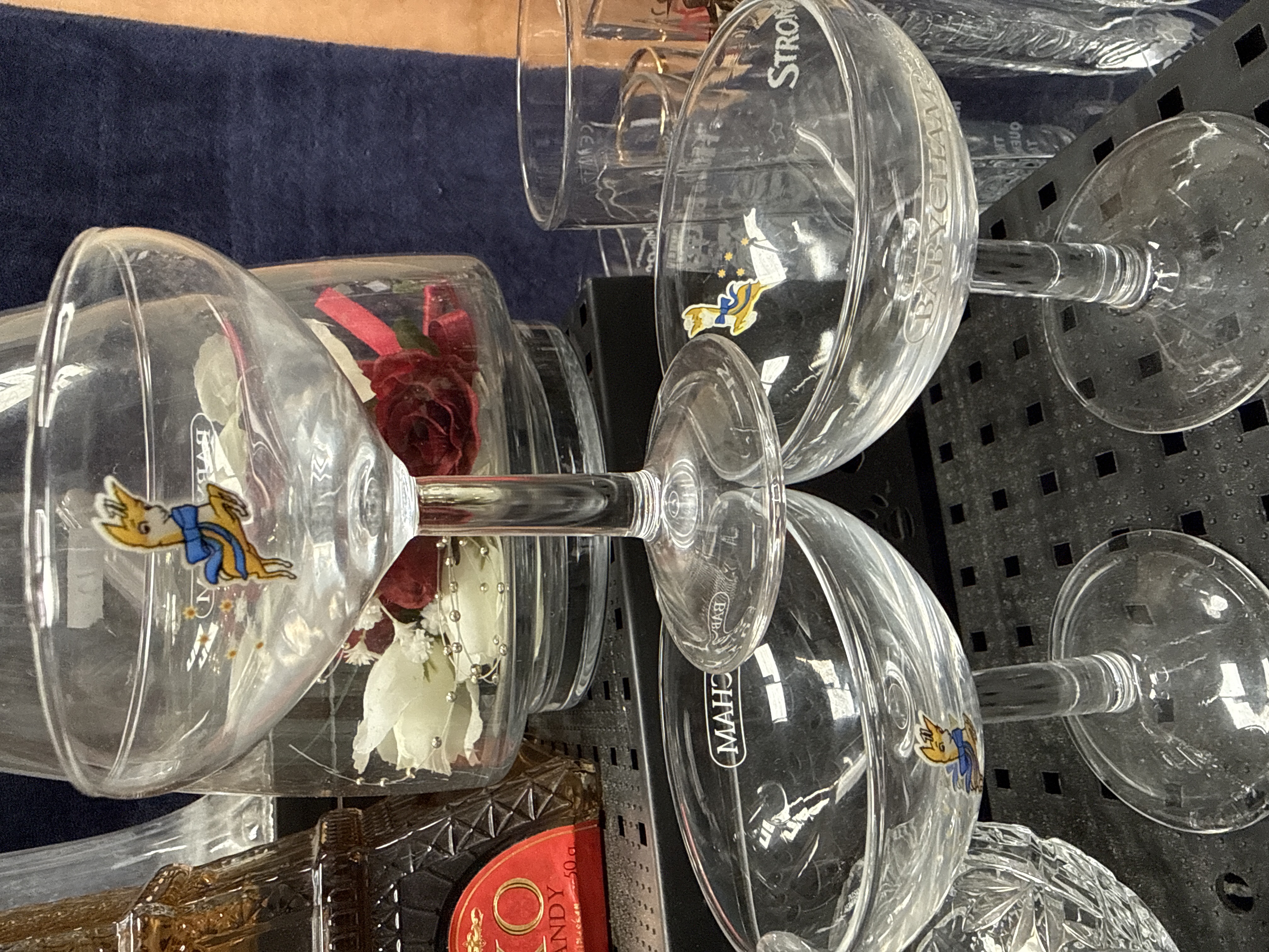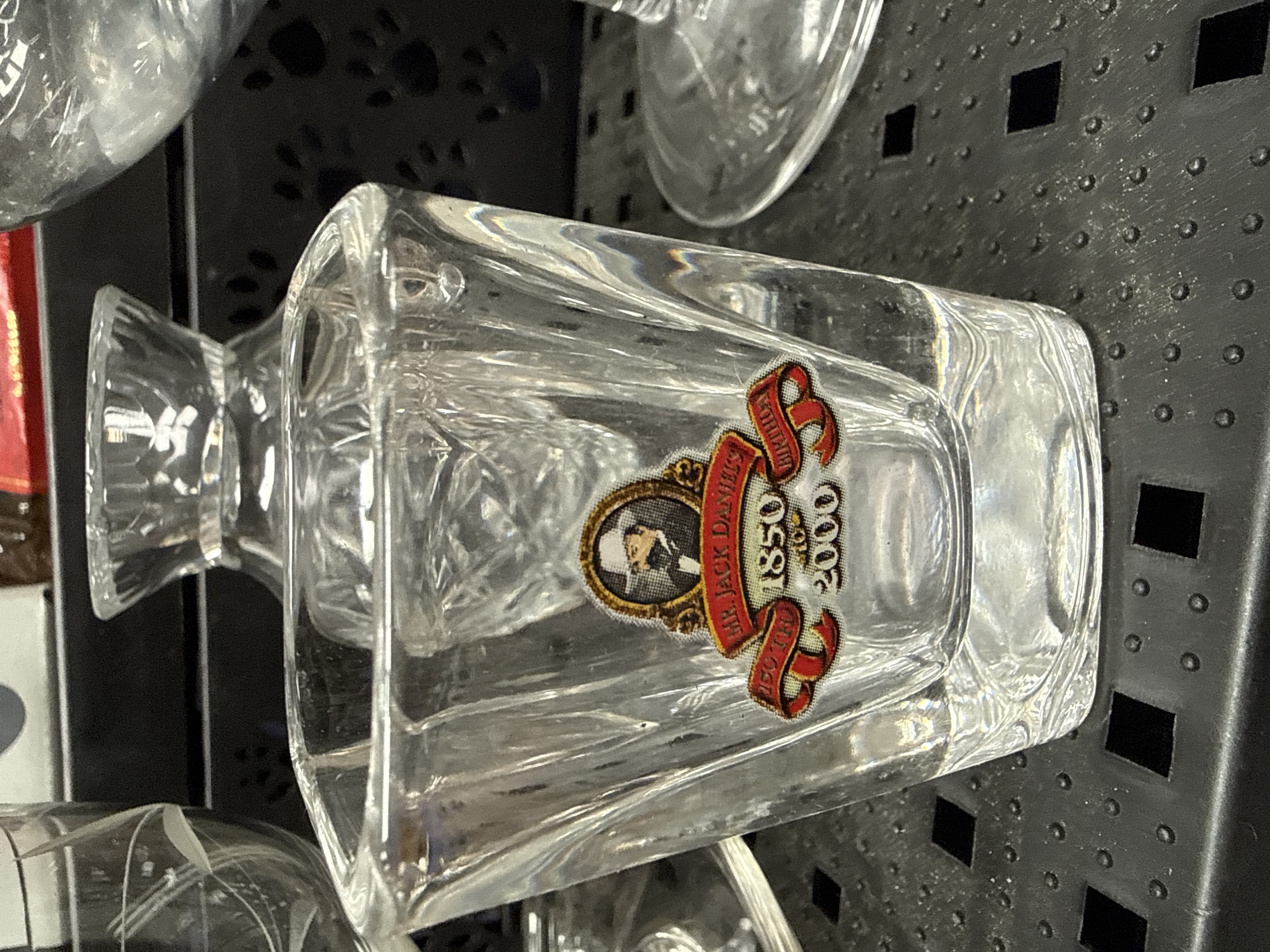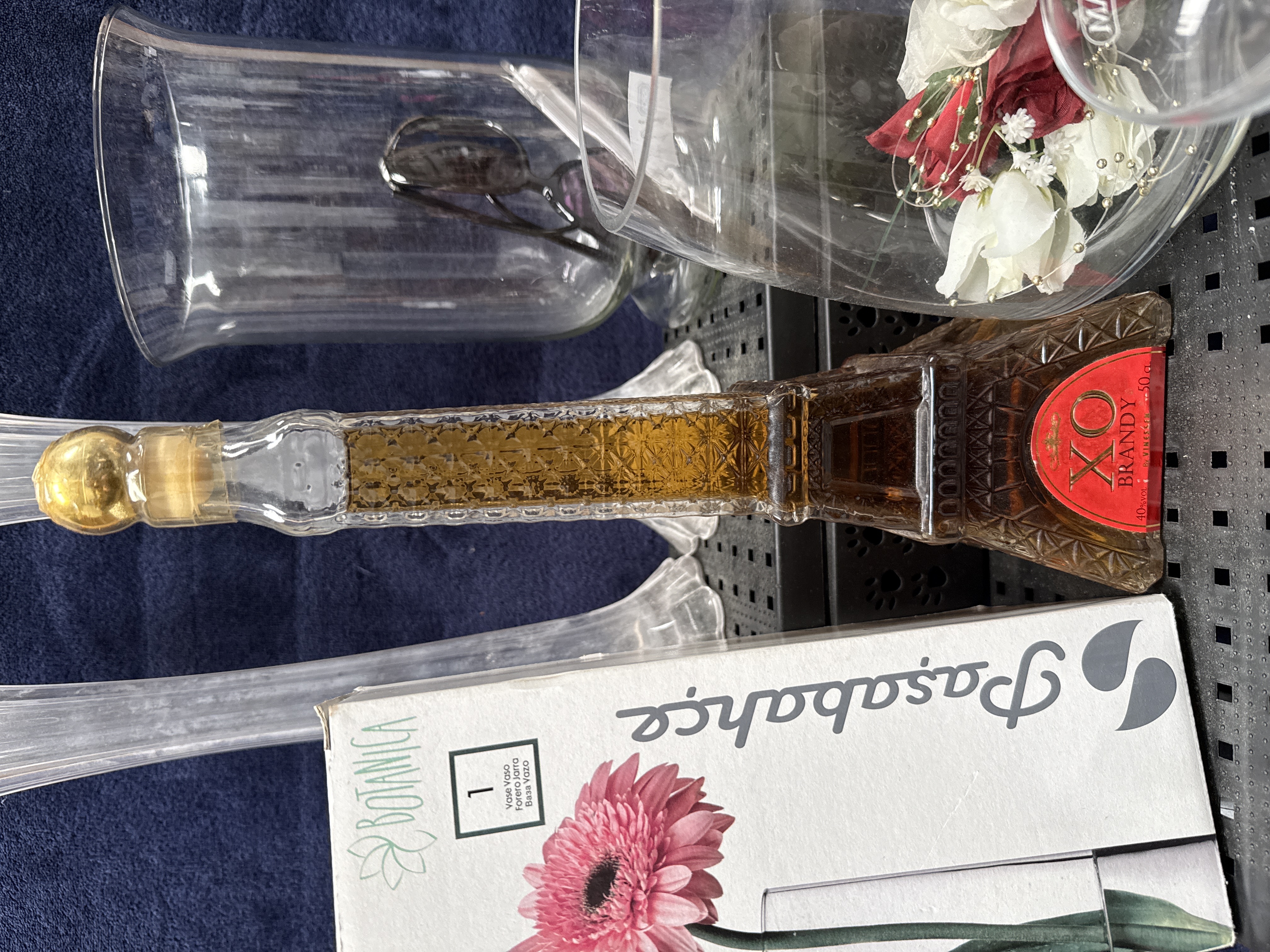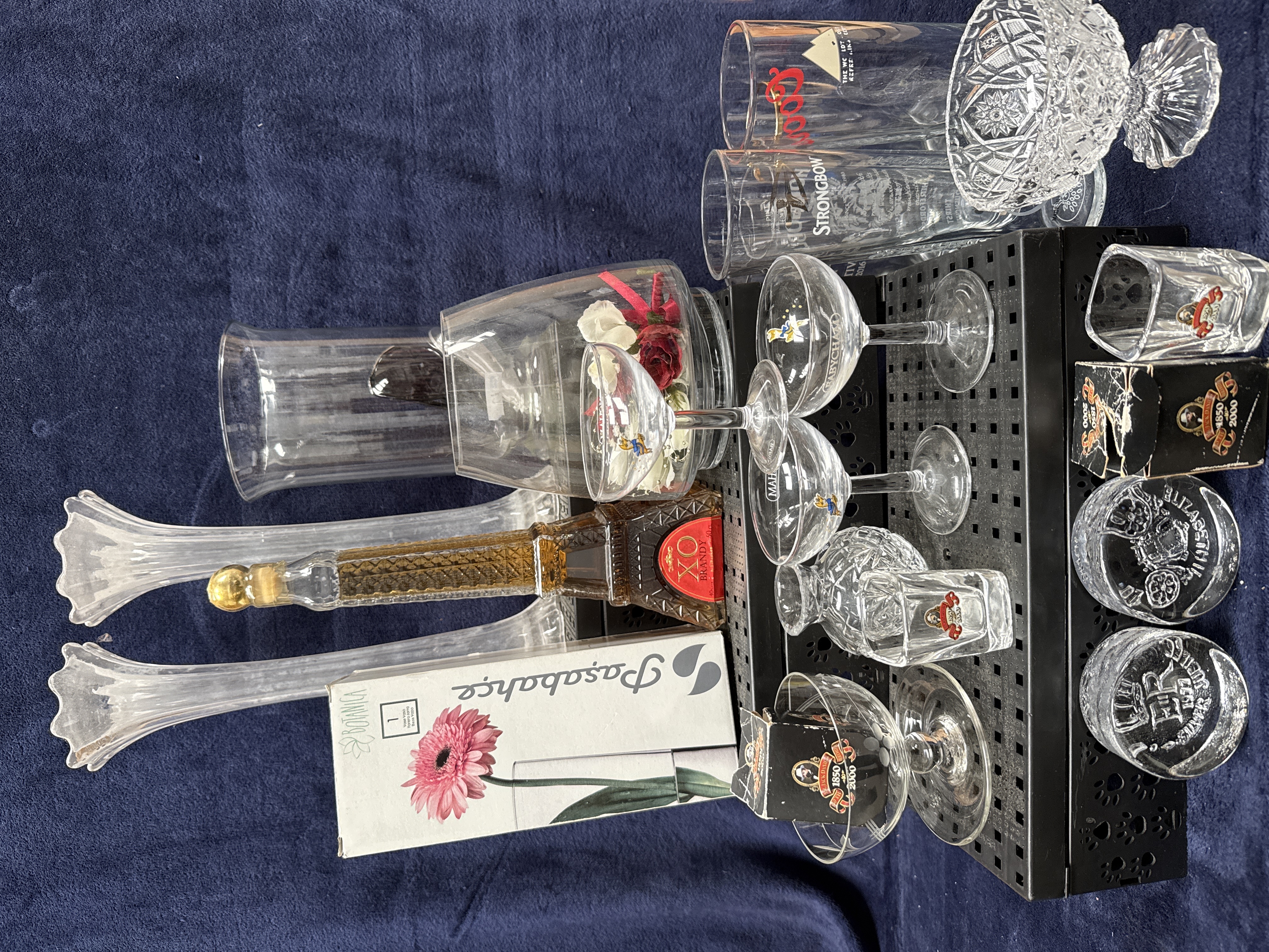An assortment of commemorative, branded, and decorative glassware. The collection includes a trio of Babycham coupe glasses featuring the brand’s characteristic yellow fawn logo and blue bow. Also included is a Jack Daniel’s commemorative tumbler produced for the 150th birthday anniversary (1850-2000), accompanied by its original black box. The lot features a novelty glass bottle in the form of the Eiffel Tower containing 50cl of XO Brandy at 40 percent volume, which remains sealed with a red label and textured amber glass base. Two clear glass flared-rim vases from the Pasabahce Botanica range are present with their original cardboard packaging. Royal memorabilia is represented by a pair of lowball glasses etched for the 1977 Silver Jubilee of Queen Elizabeth II. Further items include branded pint and highball glasses for Strongbow and Coors, a footed glass bowl with a moulded diamond-cut pattern, and two large clear hurricane-style glass cylinders, one containing an arrangement of artificial flowers. The items are primarily of pressed and moulded glass construction rather than lead crystal.