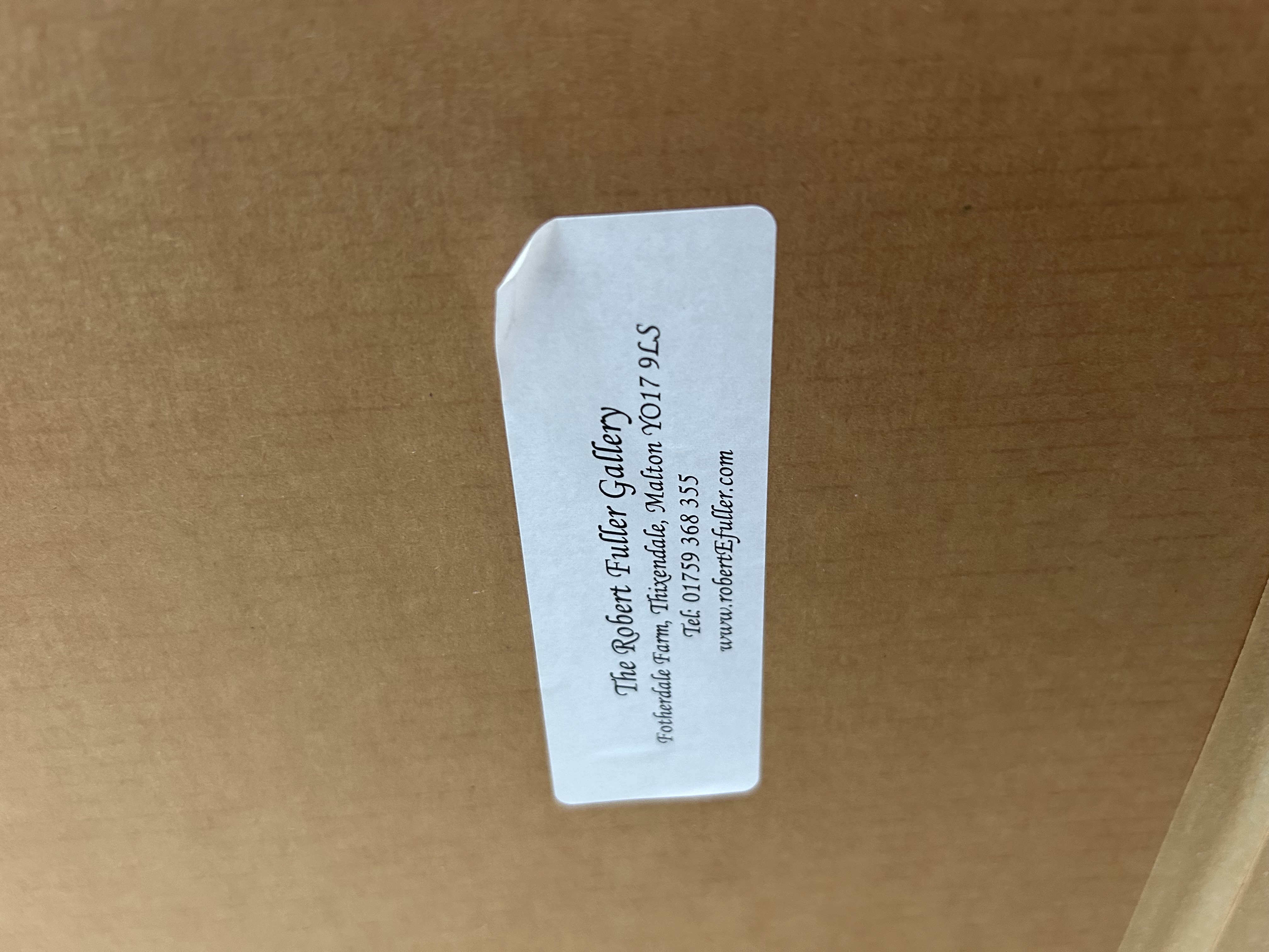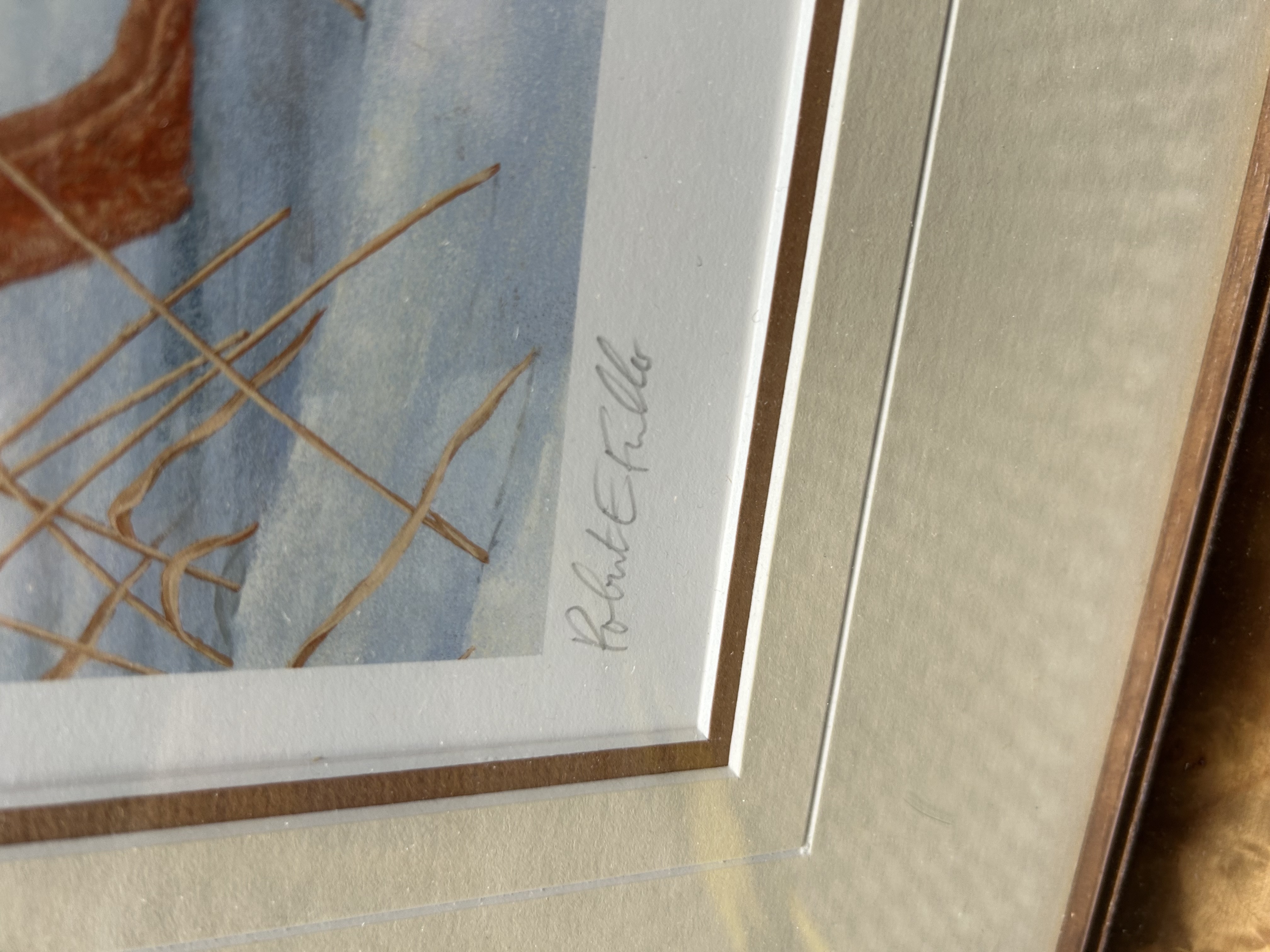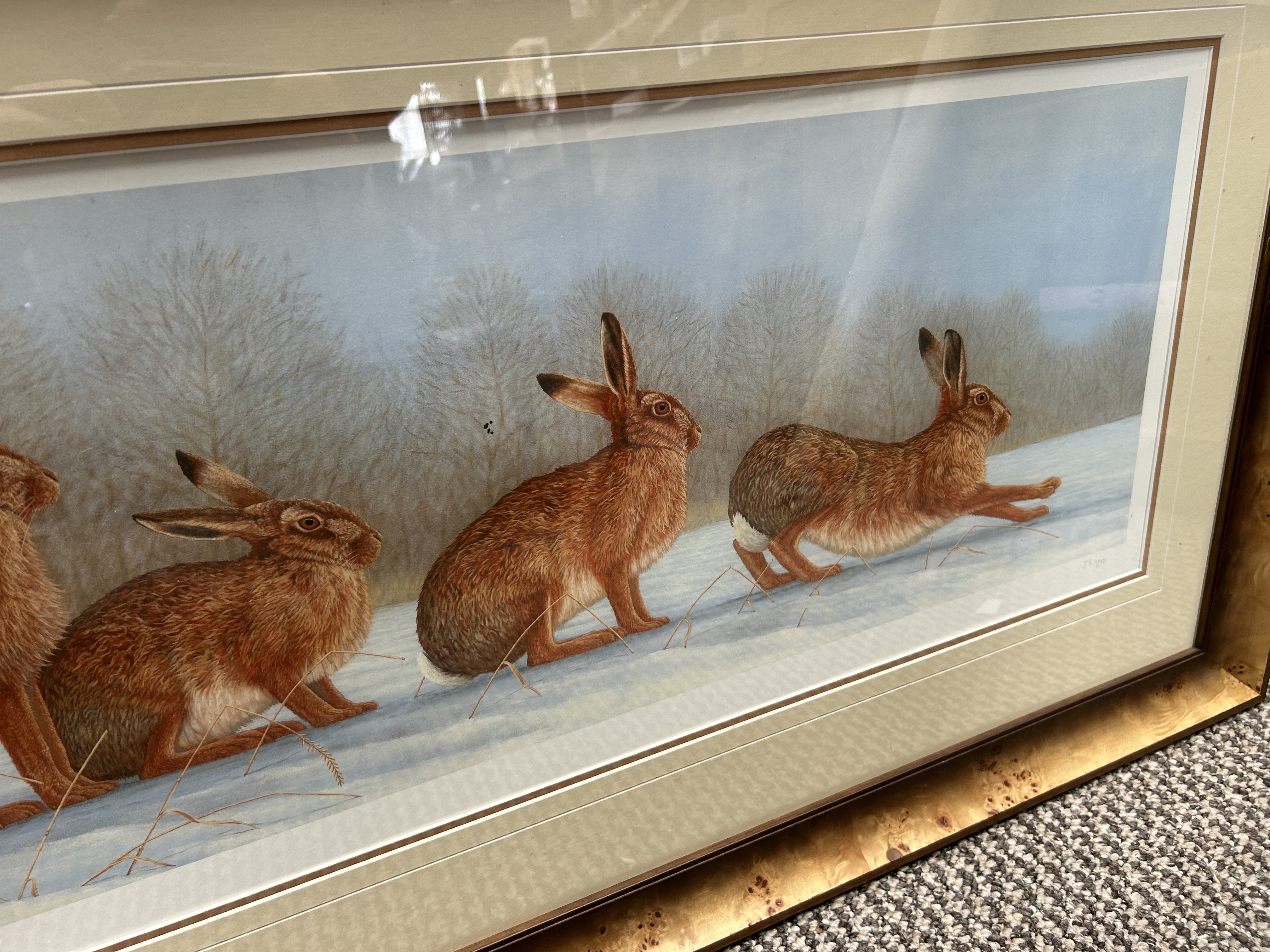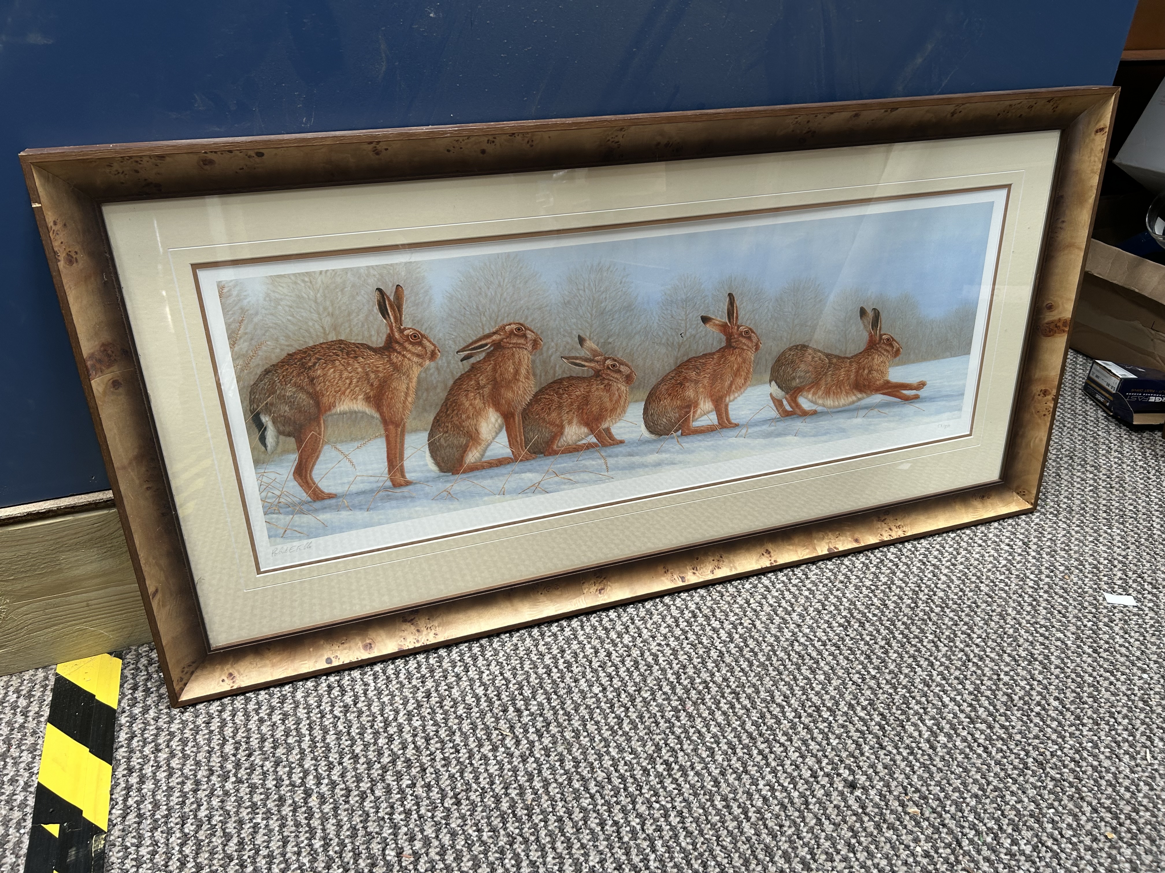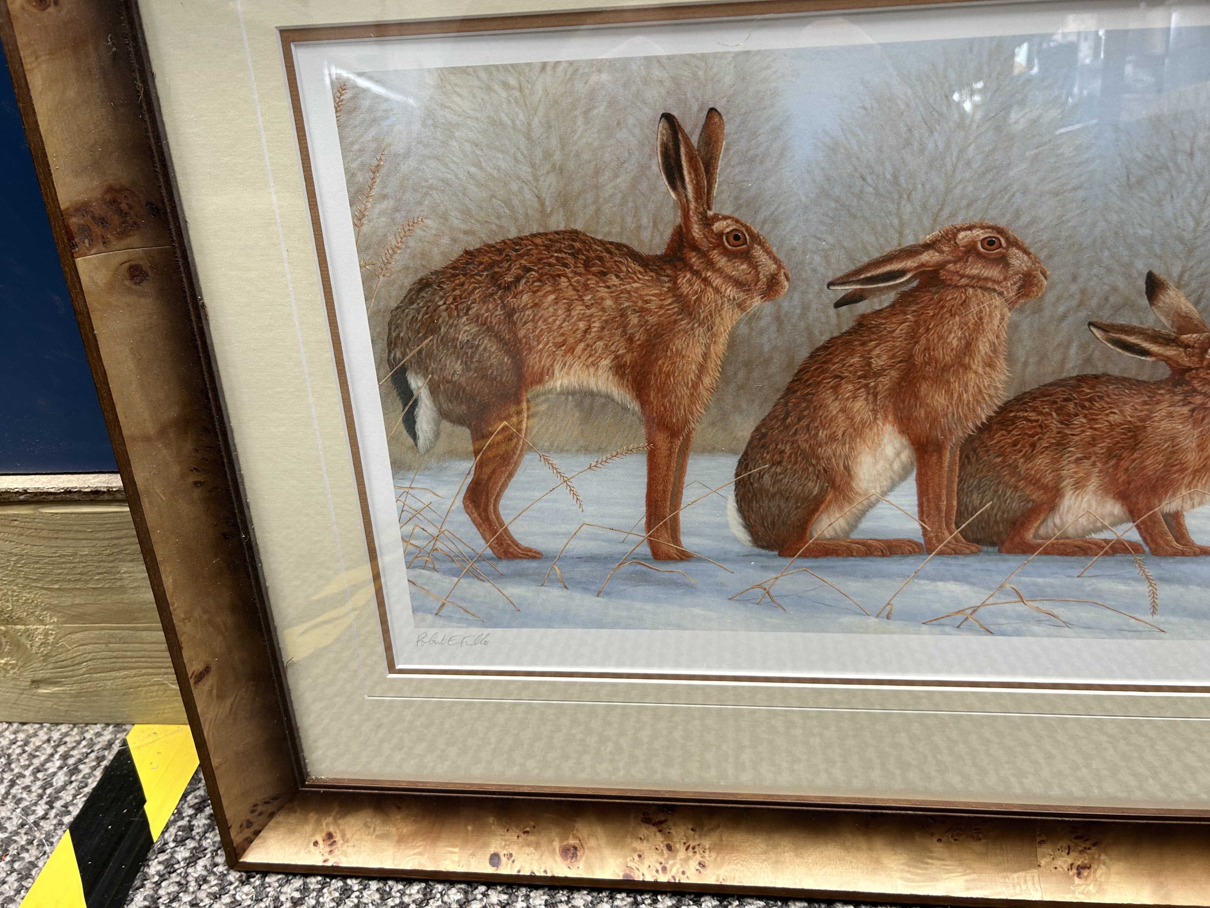 A limited edition colour print on paper after an original work by the British wildlife artist Robert E. Fuller. The composition depicts five brown hares in various poses, including sitting and running, across a snow-covered field against a backdrop of wintry trees. The work is hand-signed in pencil by the artist to the lower left margin and numbered 56/850 in pencil to the lower right margin. The reverse of the frame retains a trade label for The Robert Fuller Gallery, Thixendale, North Yorkshire. The print is housed within a triple-layered card mount and a wide burr-wood effect frame under glass.