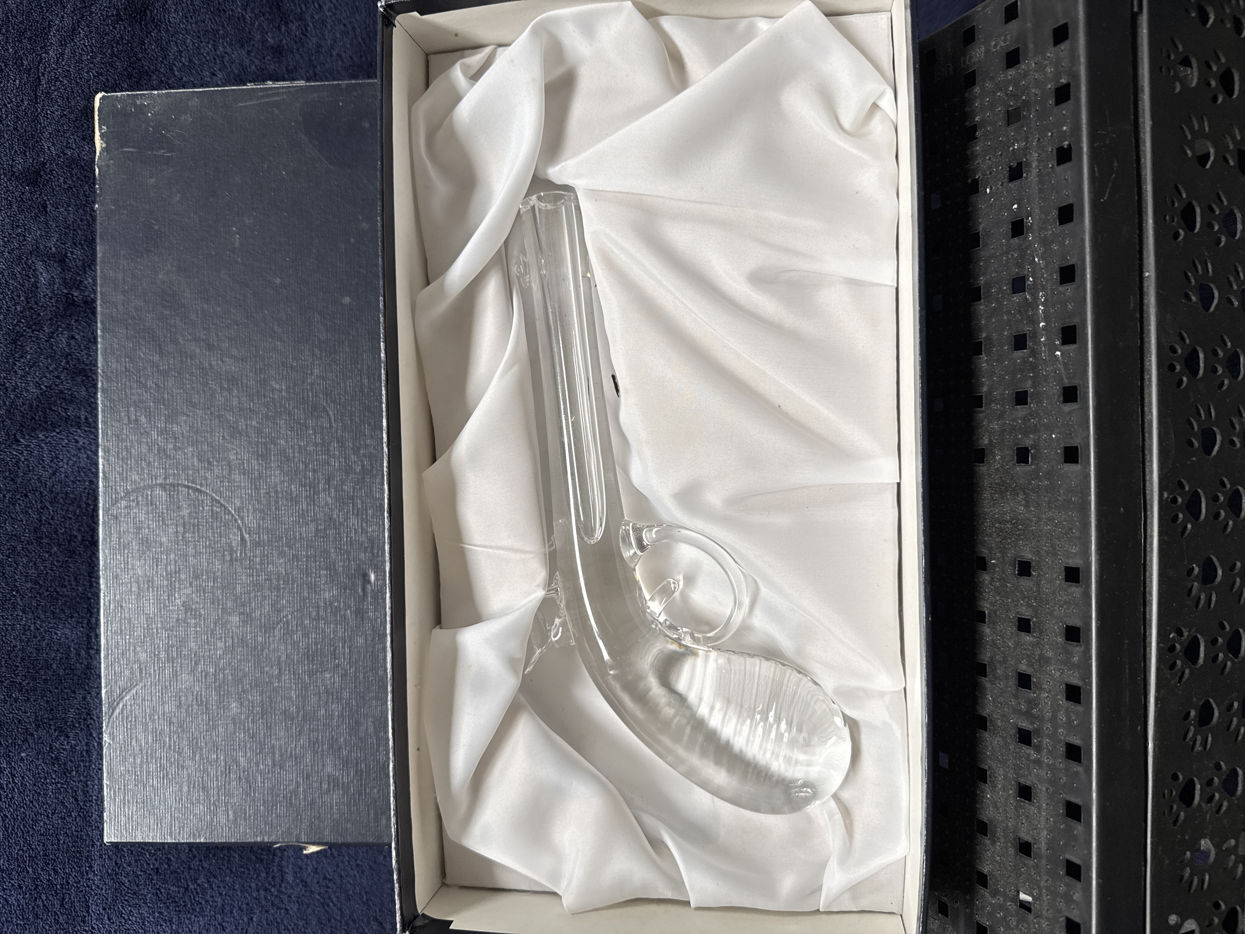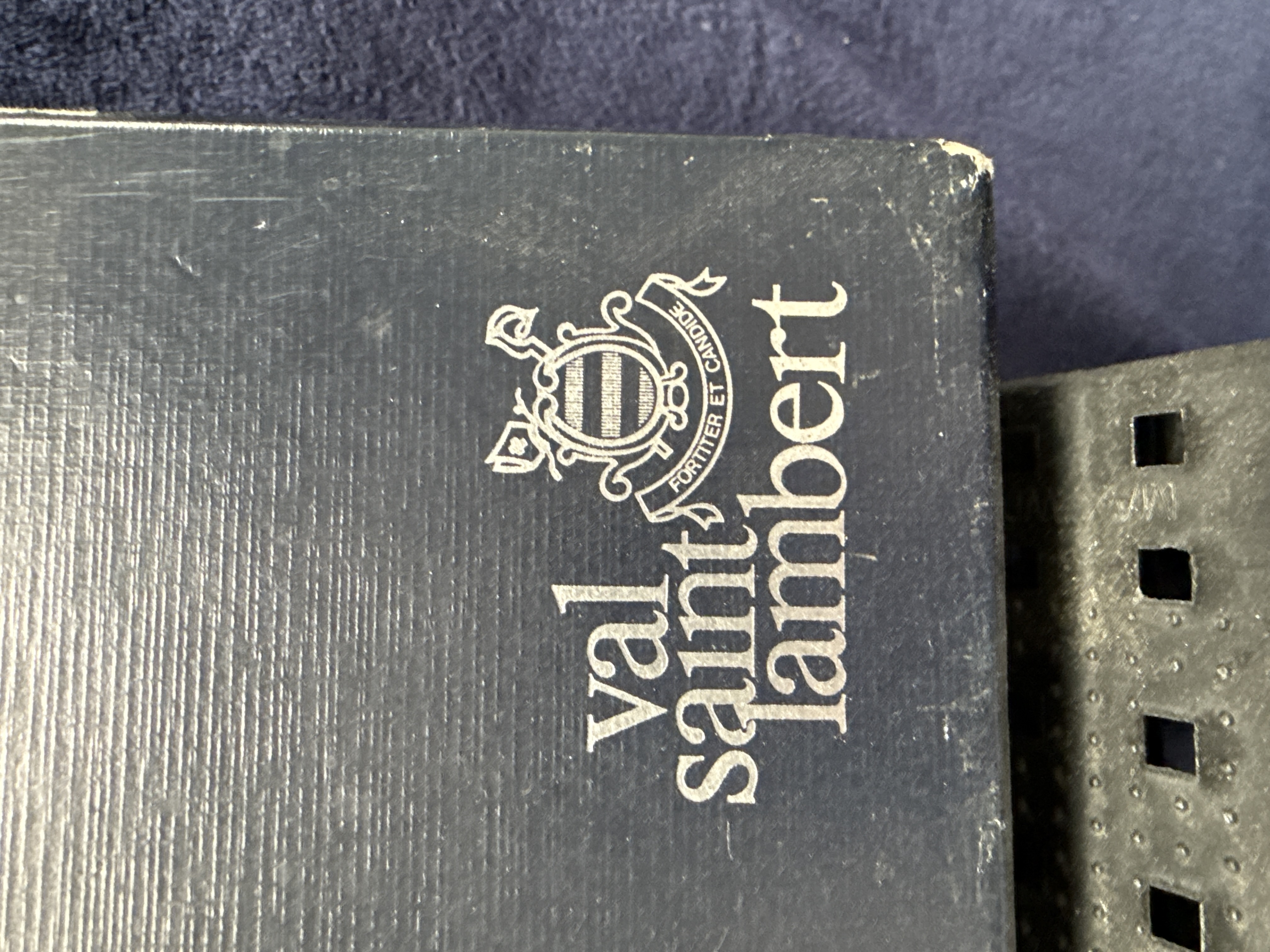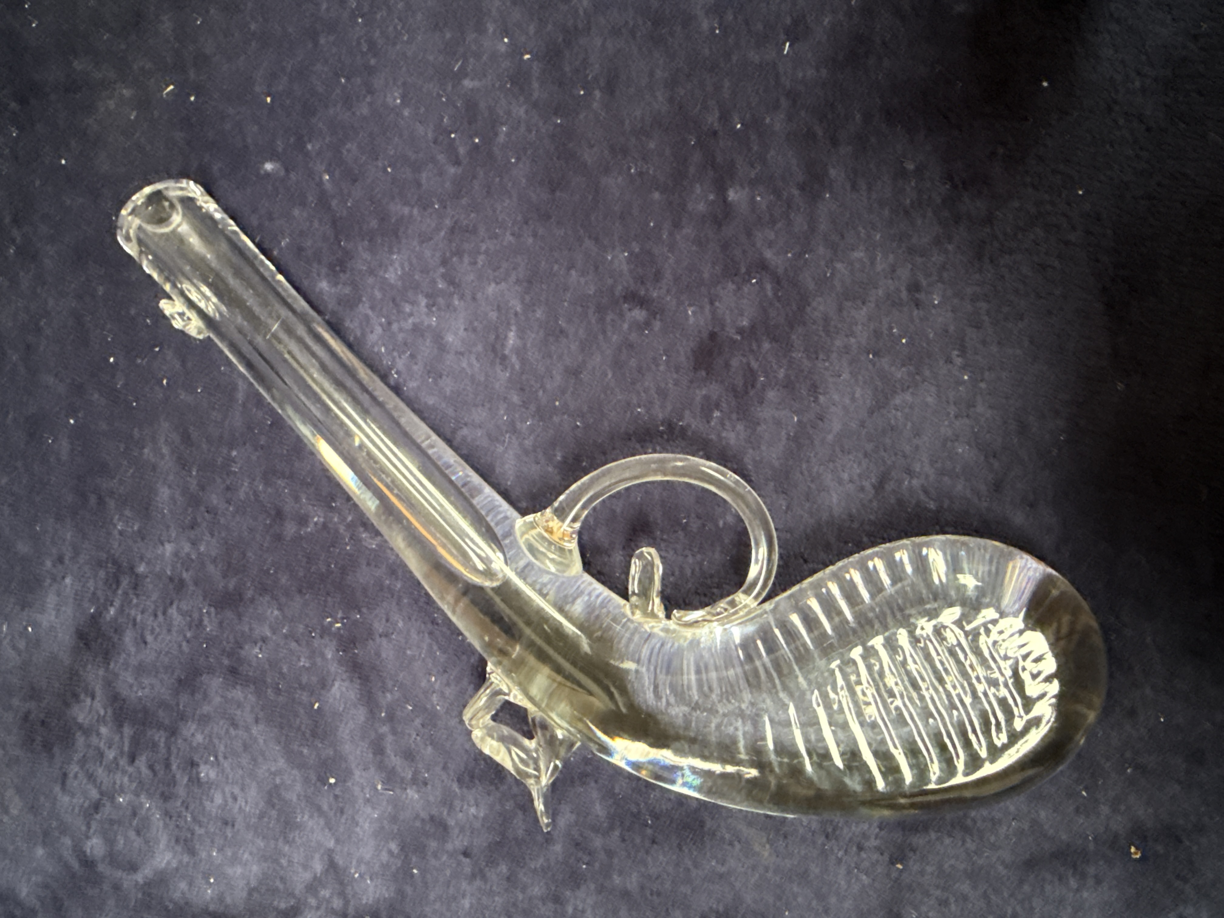 A Val Saint Lambert clear lead crystal sculpture modelled in the form of a flintlock-style dueling pistol. The piece is constructed from solid clear glass, featuring a smooth, tapering barrel and a curved grip with textured vertical ribbing on the underside. It includes applied glass elements representing the trigger and a large circular trigger guard. The item is housed in its original dark blue presentation box with a white satin-lined interior. The exterior of the box is printed with a silver Val Saint Lambert logo and a heraldic crest featuring a central shield flanked by two flags and a scroll containing the words FORTITER ET CANDIDE.