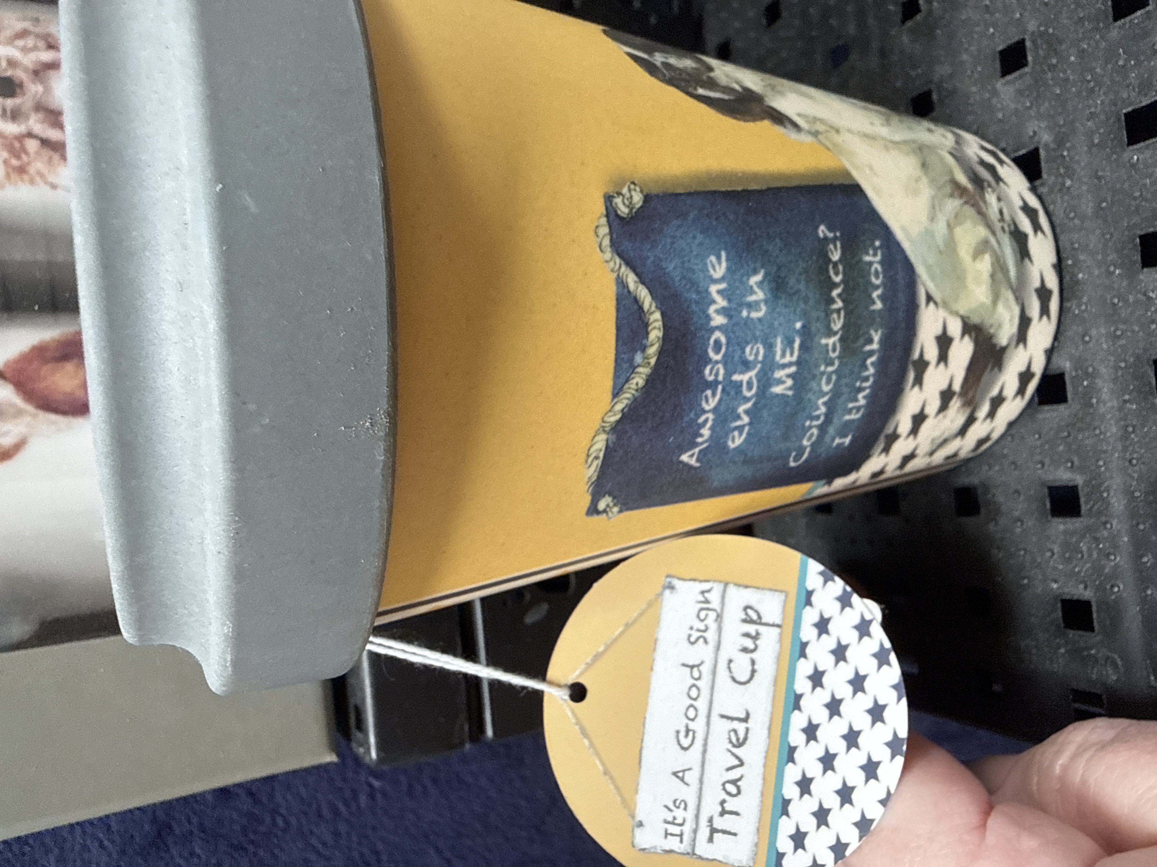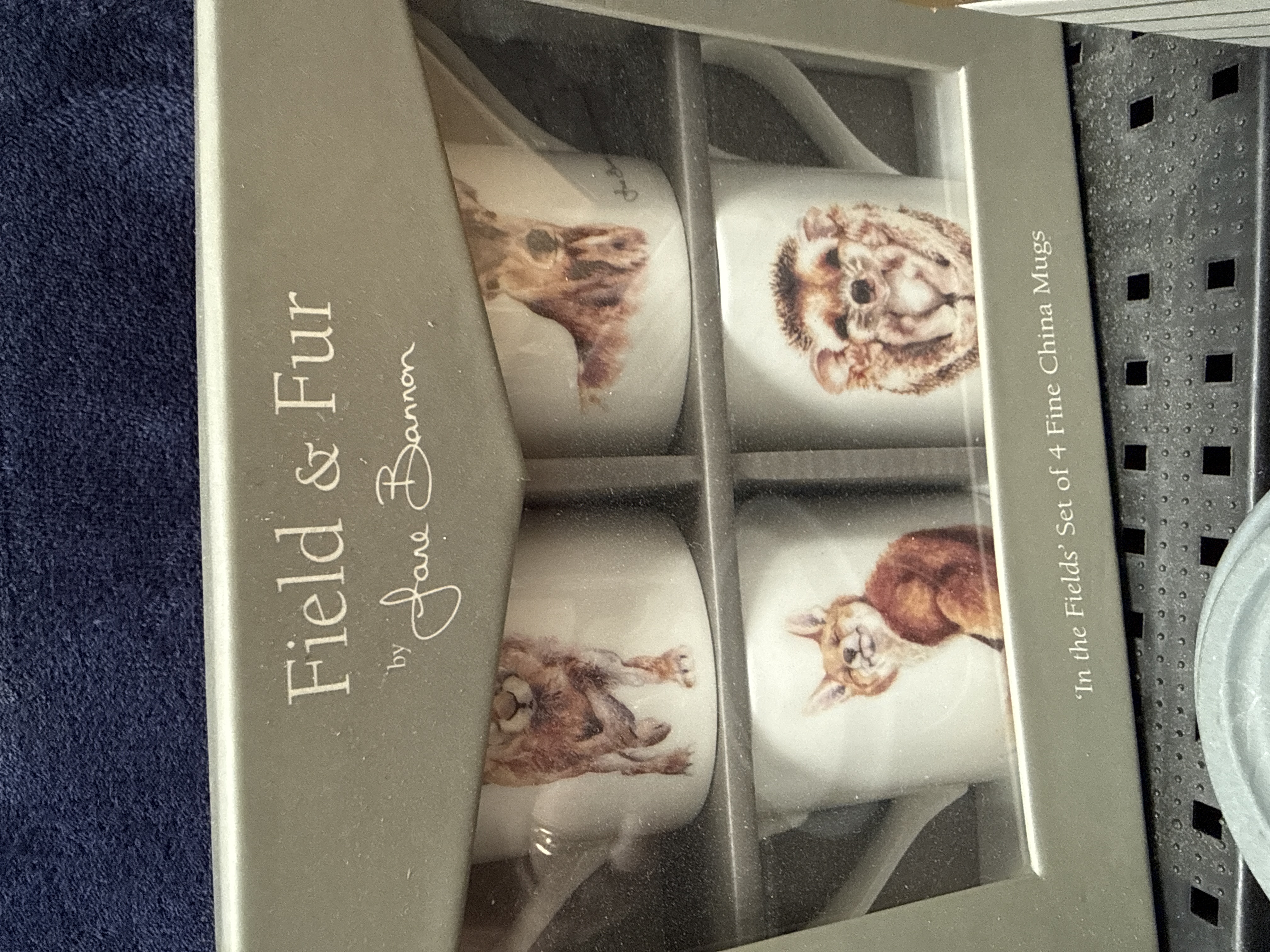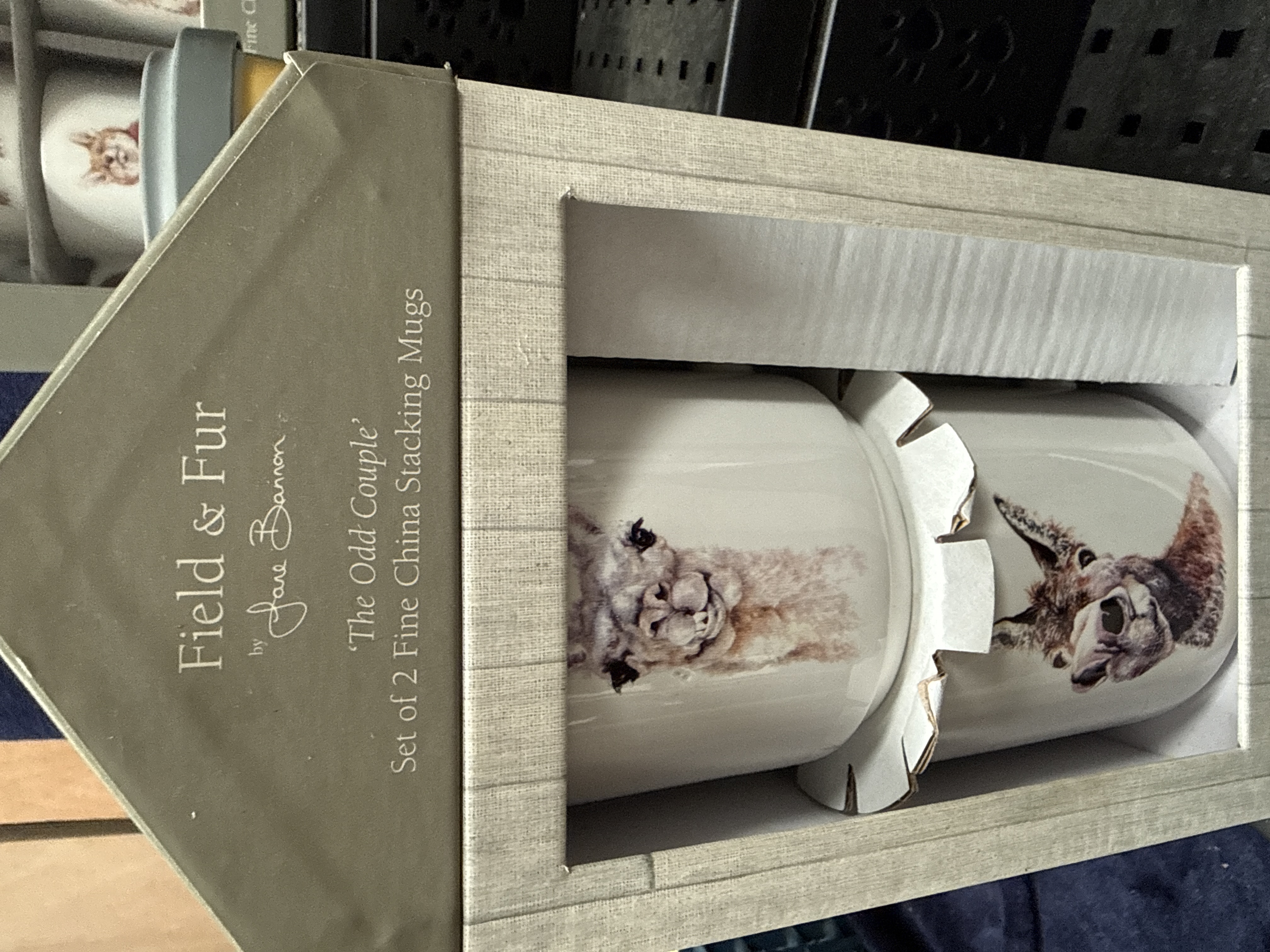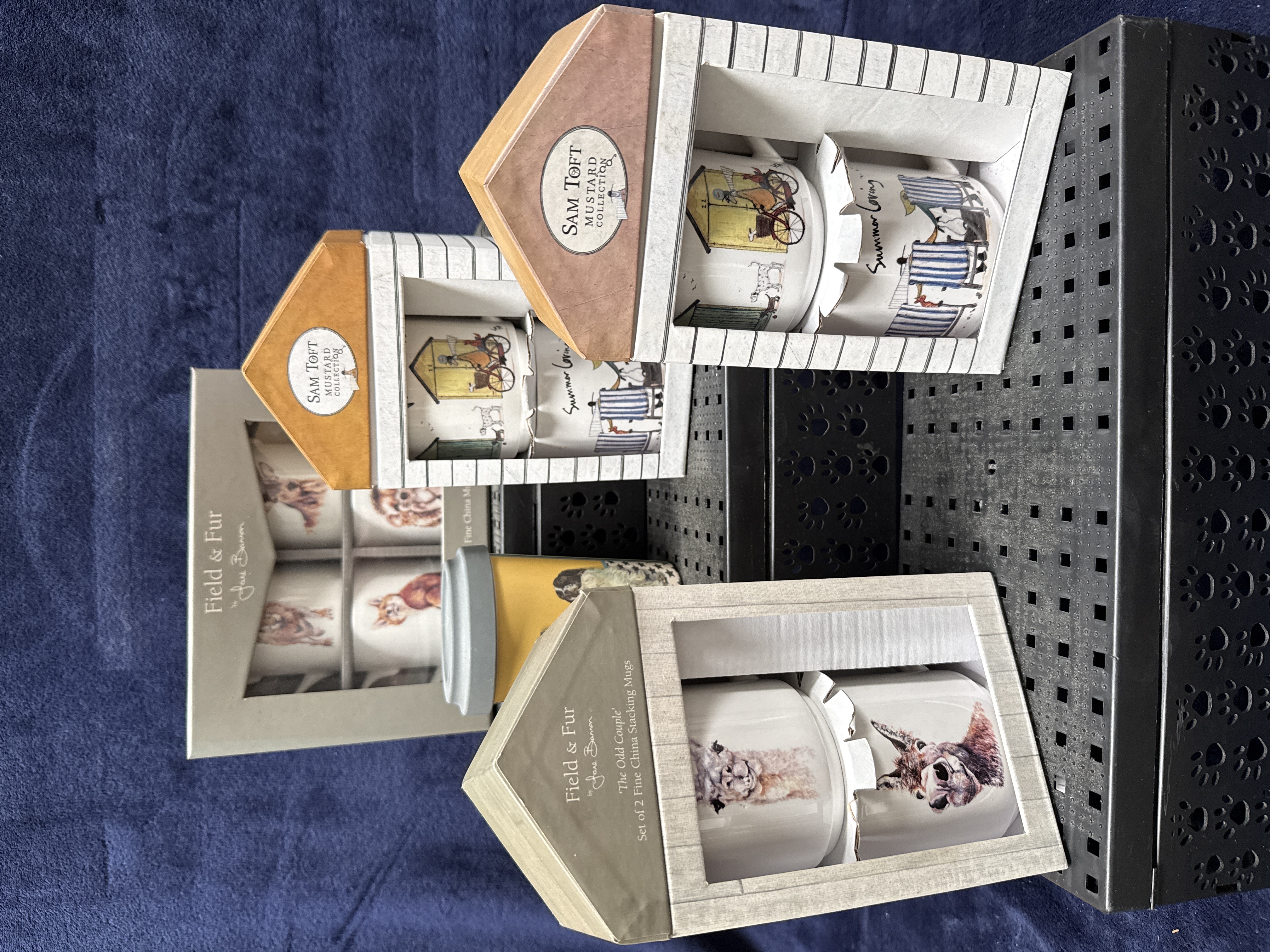 A collection of contemporary giftware comprising several sets of fine china mugs and a ceramic travel cup. The collection includes a set of four mugs from the Field and Fur by Jane Bannon range titled In the Fields, decorated with transfer-printed watercolour-style animal portraits including a fox, hedgehog, deer, and squirrel. Also included is a set of two stacking mugs from the same range titled The Odd Couple, featuring a llama and a donkey. The lot further contains several stacking mugs from the Sam Toft Mustard Collection, featuring whimsical beach-themed illustrations of characters Ernest Hemmingway Mustard and his dog Doris, with one set titled Summer Loving. Completing the collection is a ceramic travel cup with a grey silicone lid, decorated with a yellow and blue graphic design and the slogan Awesome ends in ME. Coincidence? I think not. The travel cup retains its original It is A Good Sign swing tag. All ceramic items are housed in their original decorative cardboard retail packaging.