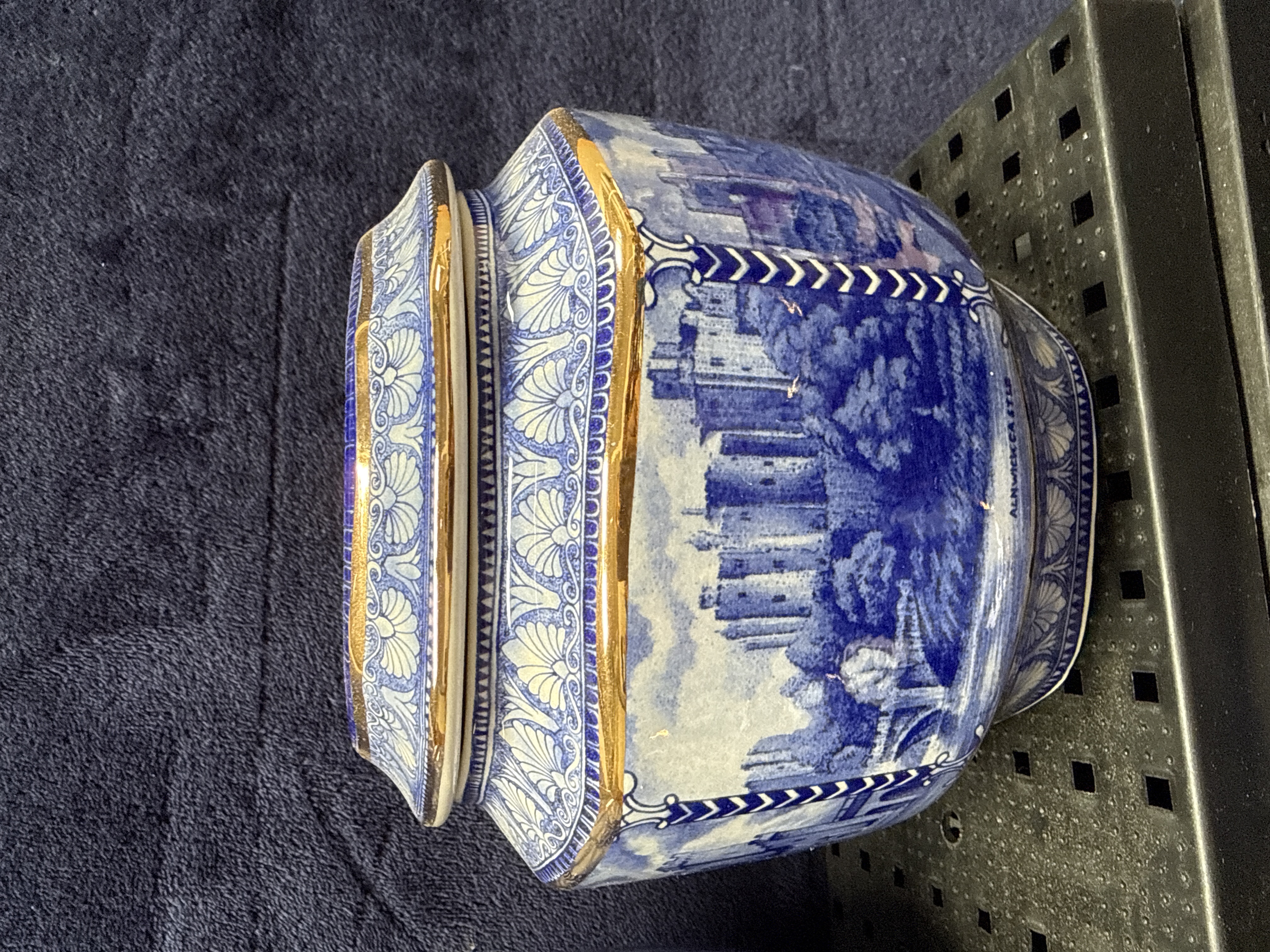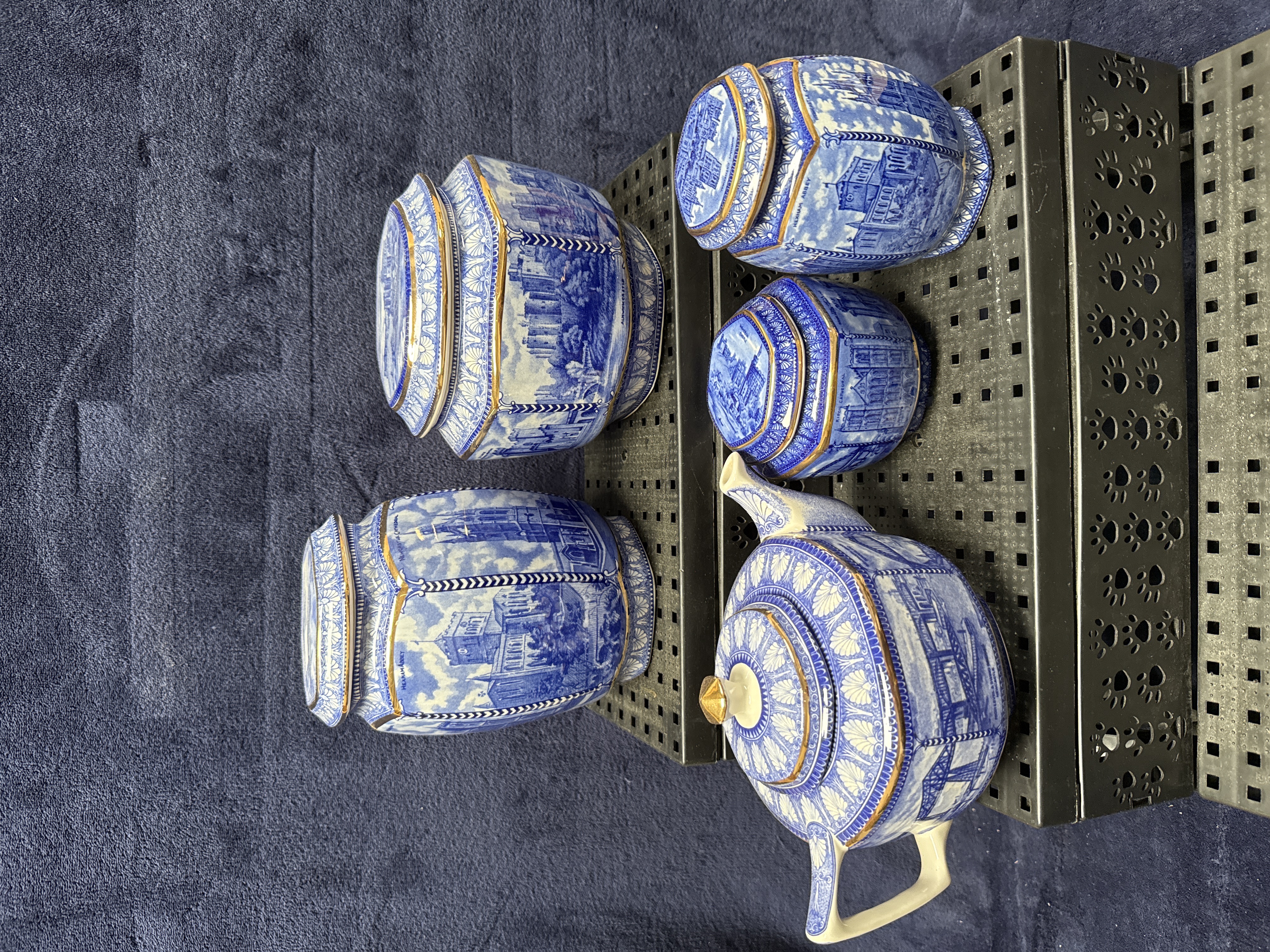 A collection of five earthenware items produced for Ringtons, comprising one teapot and four lidded canisters of graduated sizes. The pieces feature blue and white transfer-printed topographical scenes depicting British landmarks, including Alnwick Castle, Hexham Abbey, and Lincoln Cathedral. Each scene is framed by decorative shell and scroll borders. The items are designed with multi-faceted octagonal bodies and are embellished with gilt highlights to the rims, handles, and finials. While no maker marks are visible on the bases, the topographical subjects and style are characteristic of Ringtons promotional ware, frequently manufactured by Wade or Maling. The teapot features a faceted body, curved spout, and simple loop handle, while the canisters have corresponding fitted lids.