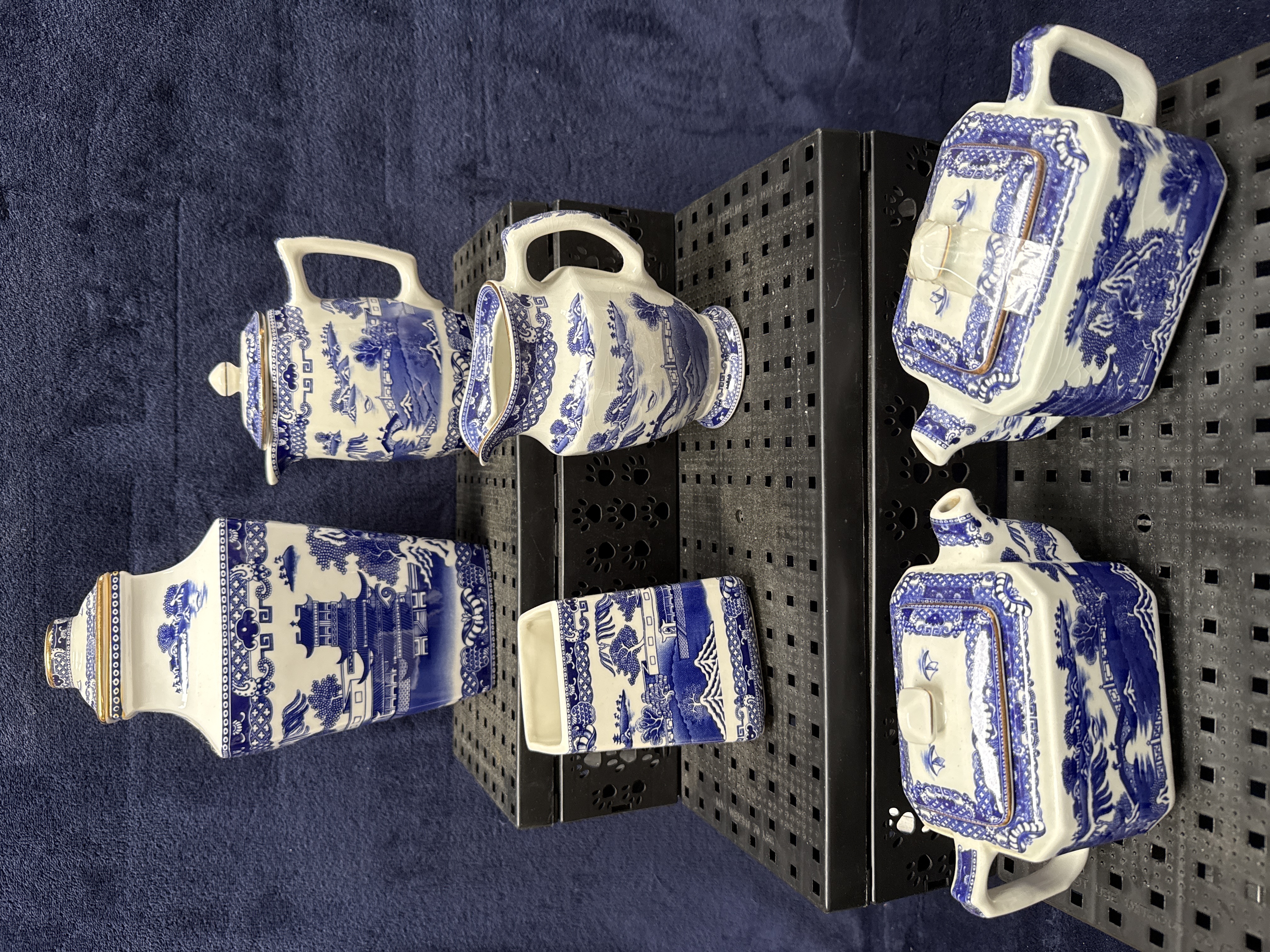 A set of six glazed earthenware items featuring the blue and white Willow pattern, produced for Ringtons Limited Tea Merchants. The collection includes a teapot and cover, a hot water jug or coffee pot and cover, a twin-handled sugar bowl and cover, a milk jug, a square-section storage jar or caddy and cover, and a small rectangular open stand. Each piece is designed with an angular, octagonal-sided form and decorated with traditional transfer-printed oriental landscapes depicting pagodas, bridges, and trees. The items are finished with gilt highlights to the rims, handles, and finials. While no manufacturer marks are visible on the exterior, this specific design and pattern are associated with the tea merchant Ringtons.