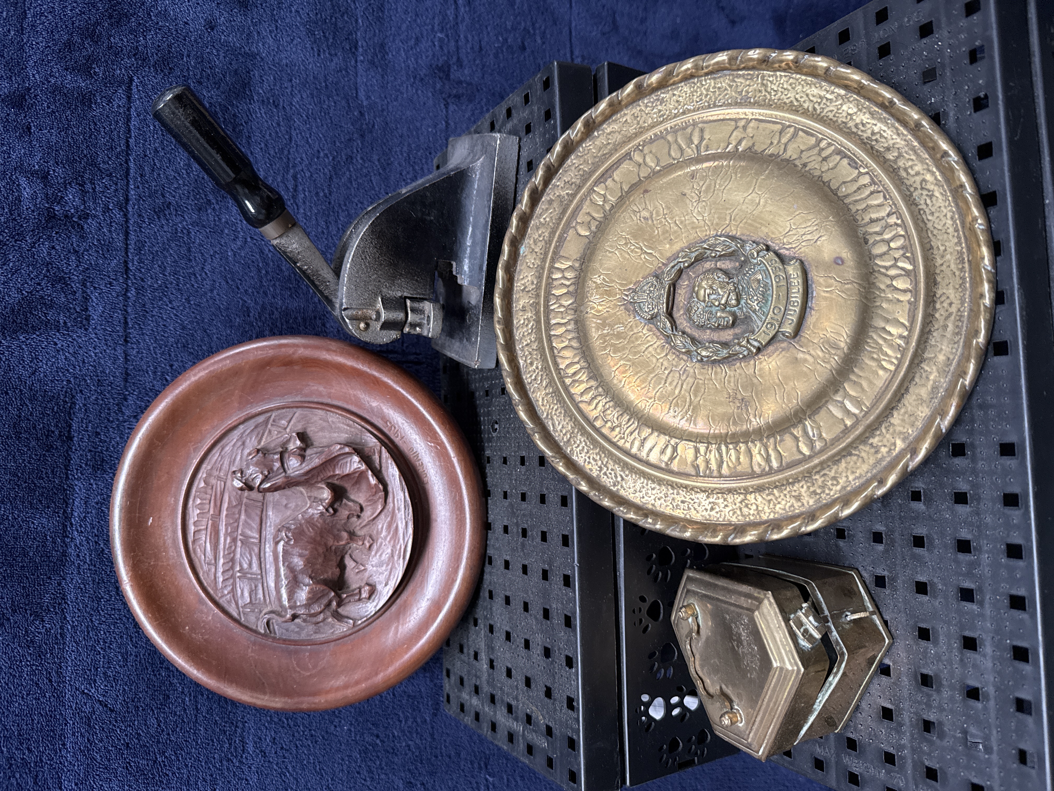 An assortment of vintage and commemorative items. The collection includes a circular brass dish commemorating the Silver Jubilee of King George V, featuring a central medallion with a profile portrait flanked by the dates 1910 and 1935, with a banner inscribed JUBILEE. The dish is designed with a rope-twist border and a hammered textured ground. Also present is a circular decorative wall plaque in a reddish-brown composition material, featuring a relief-moulded bullfighting scene with a matador and bull, bearing the incised mark DINERO. The lot further contains a hand-operated industrial lever press with a cast iron frame finished in black paint and a wooden handle. Completing the assortment is a small hexagonal brass box with a hinged lid and latch, constructed from folded and soldered brass sheet.