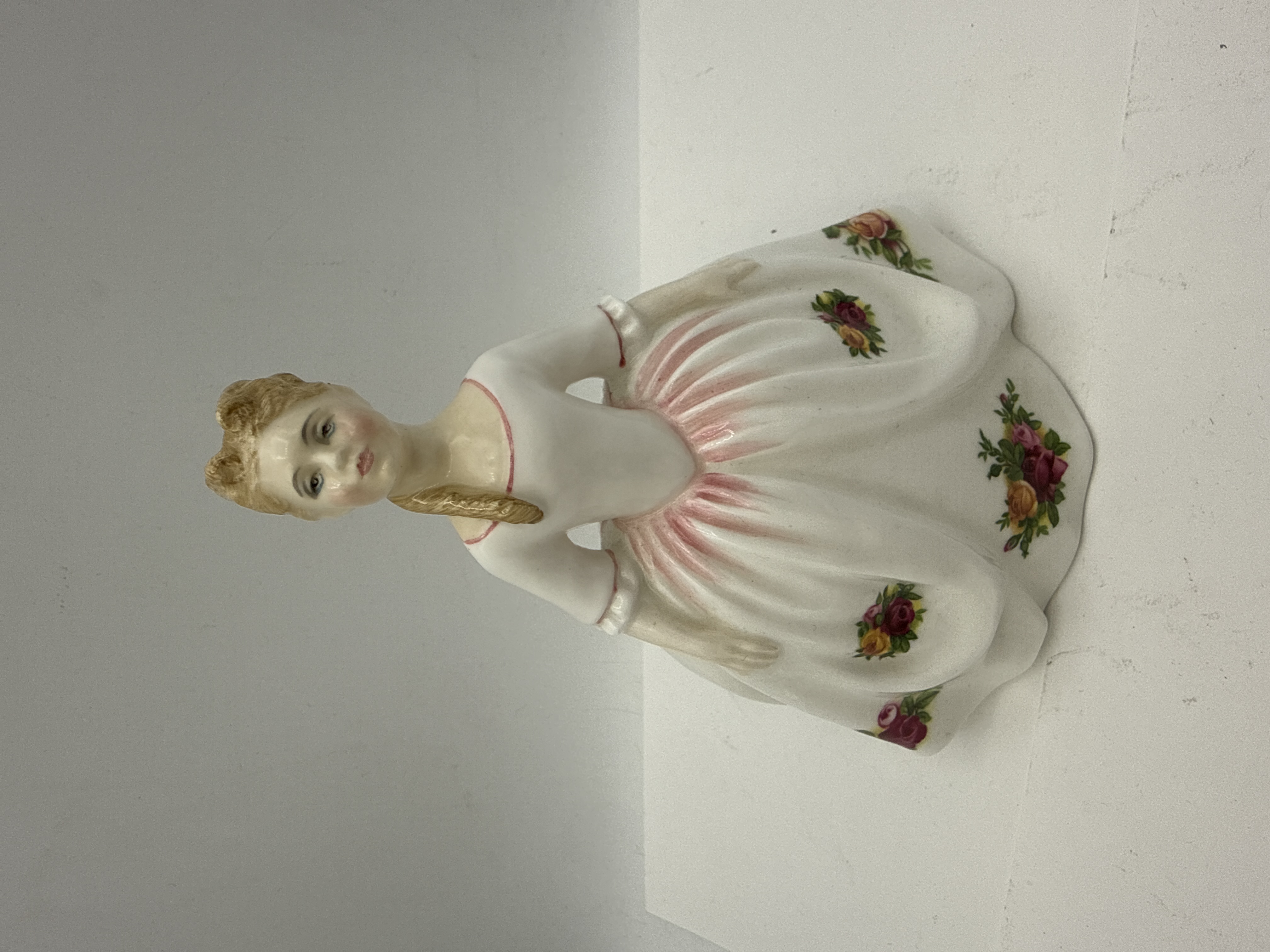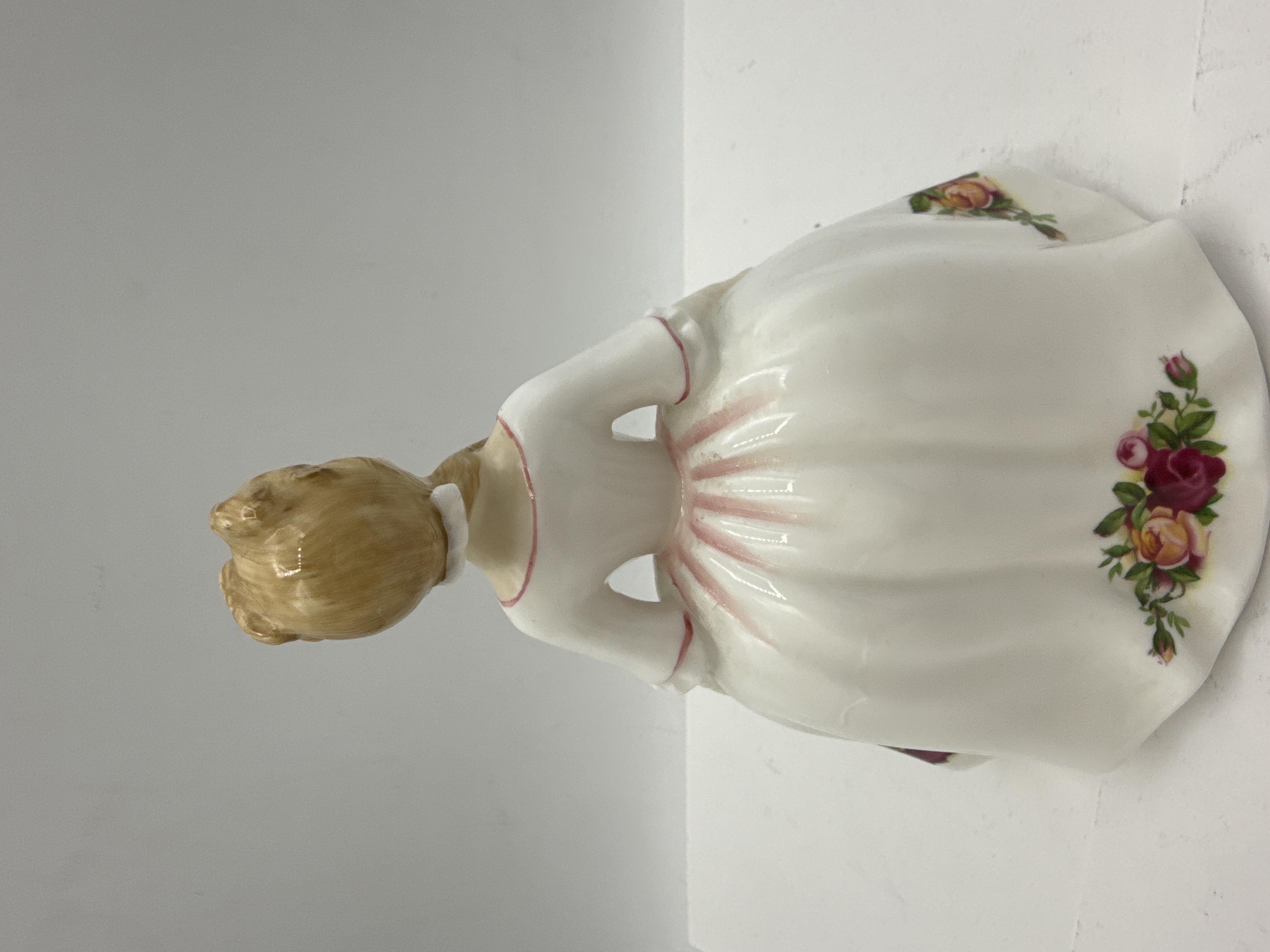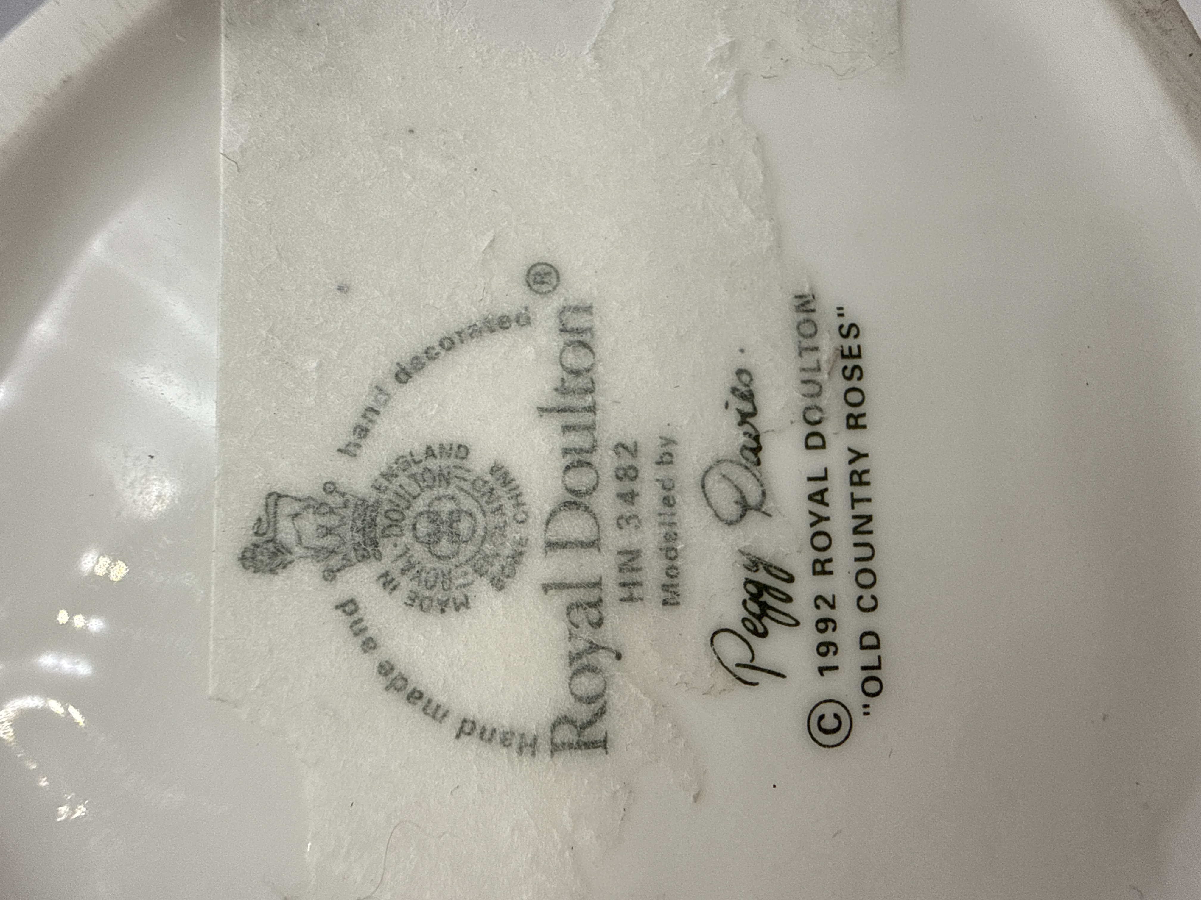 A Royal Doulton glazed bone china figurine titled Old Country Roses, model number HN 3482. This piece was modelled by Peggy Davies and is hand made and hand decorated. The figure depicts a young woman with blonde hair tied in a braid, wearing a flowing white dress adorned with the Old Country Roses floral pattern of red, pink, and yellow roses with green foliage. The dress features pink accents at the neckline, cuffs, and waist. The base carries the Royal Doulton lion and crown backstamp, the model number, the printed signature of the modeller, and a 1992 copyright date.